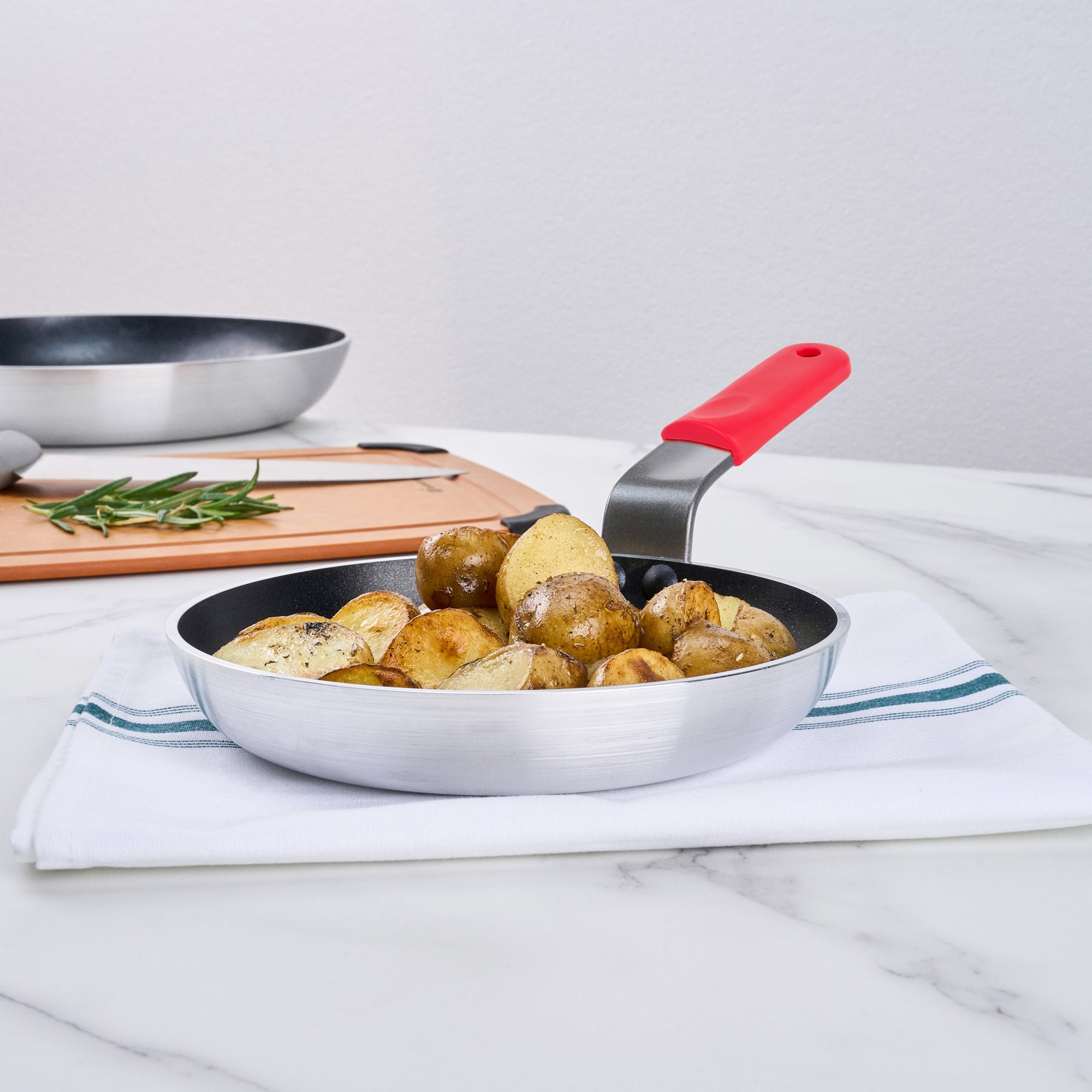 Enjoy meals cooked with our Bundle: Met Lux 1 Aluminum 8" Induction Ready Fry Pan with 1 Red Silicone Pan Handle Sleeve. Designed with a non-stick surface, this aluminum fry pan keeps food from sticking and ensures a smooth release. Featuring a stainless steel bottom plate, this frying pan is compatible with induction cooktops for efficient and even cooking. This skillet pan is crafted from heavy-duty aluminum for premium durability and consistent heat distribution across the pan. The triple-riveted handles of this induction frying pan ensure a secure connection, facilitating enhanced control during cooking. This saute pan is oven-ready and suitable for use with ceramic and electric cooktops, offering a wide range of cooking options. To ensure optimal performance for long-lasting use, this aluminum pan is best cleaned by hand washing. The handle of this kitchen skillet features hanging holes, providing an easy and space-saving storage solution. This silicone sleeve offers heat resistance of up to 450F, allowing for a comfortable and secure grip on hot pans. Each removable handle sleeve features molded indentations to provide a secure and comfortable grip, reducing the risk of accidents. The removable design of this pan handle sleeve enables easy switching between pans, saving time and effort. Measuring 13.82 inches in length by 7.76 inches in width by 3.15 inches in height, this omelet pan offers ample room for a variety of dishes. Each order includes 1 pan and 1 sleeve.