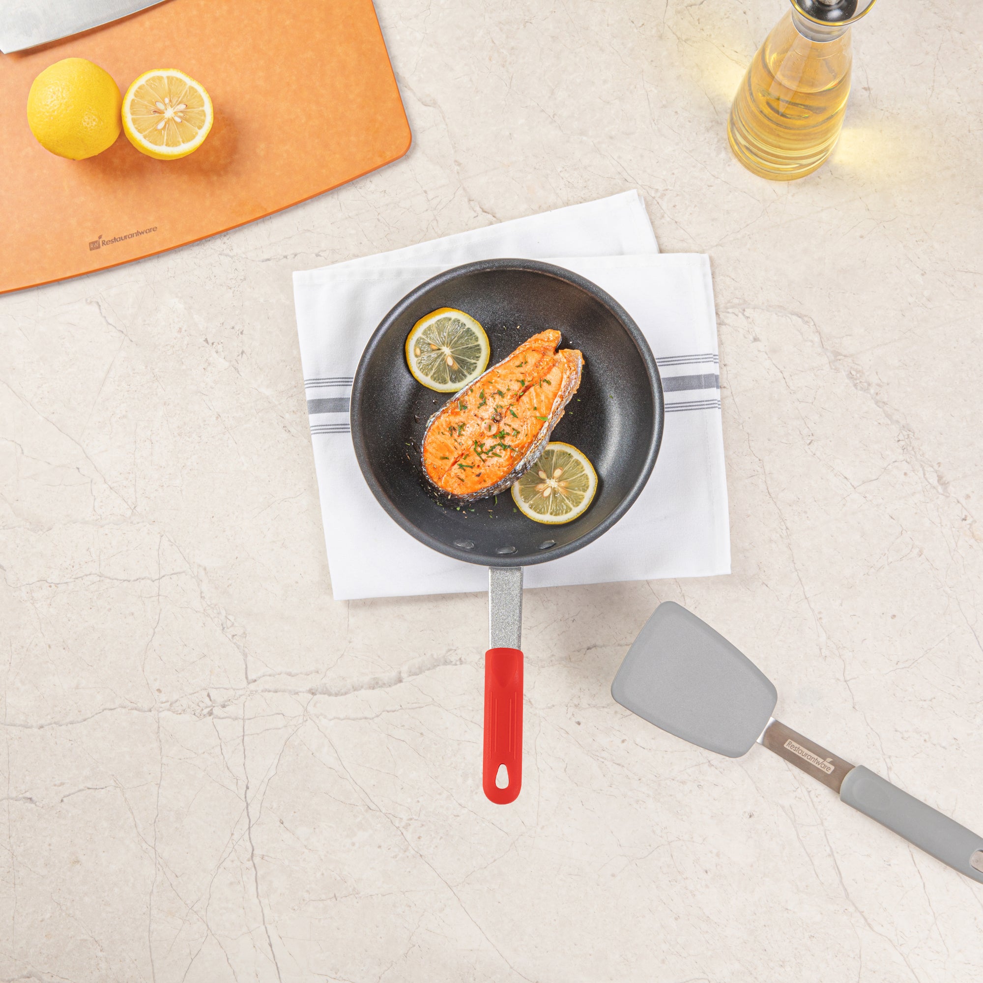 Enhance your culinary efficiency with our Bundle: Met Lux 1 Aluminum 9" Non-Stick Fry Pan with 1 Red Silicone Pan Handle Sleeve. This non-stick fry pan ensures food slides right off, making both cooking and cleanup effortless. Crafted from 3 mm thick aluminum, this frying pan offers even heat distribution and long-lasting durability, ideal for consistent cooking results. Conveniently induction-safe, this skillet pan is versatile and compatible with various stovetops, enhancing your cooking options. The triple-riveted handle of this aluminum fry pan provides a secure and comfortable grip. This cooking pan is equipped with hanging holes to facilitate easy storage, keeping your kitchen organized. To maintain its premium non-stick coating, this kitchen pan should be hand washed and designed for longevity and repeated use. This pan handle sleeve withstands heat temperatures up to 450F, protecting hands from burns and ensuring safe handling of hot pan. Featuring molded indentations, this removable handle sleeve provides a secure grip, minimizing accidental slippage during use. The removable design of this red silicone sleeve allows for easy interchangeability between different pan. This aluminum pan measures 14.57 inches in length by 8.66 inches in width by 2.95 inches in height, offering ample space for all your cooking needs. Each order includes 1 pan and 1 sleeve.