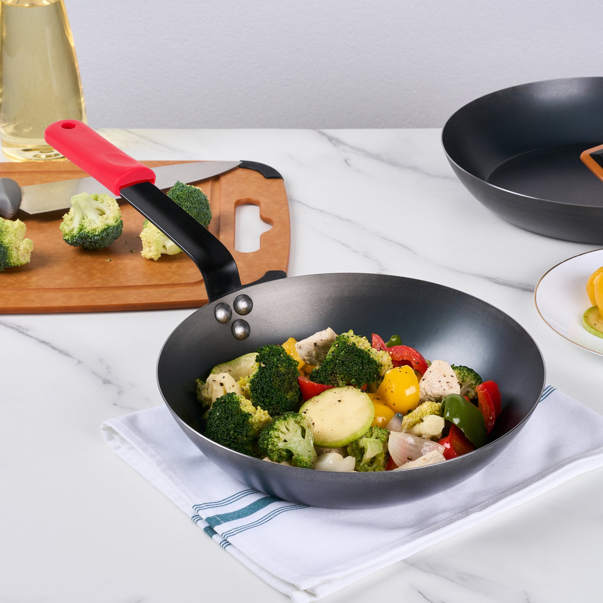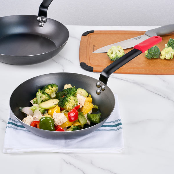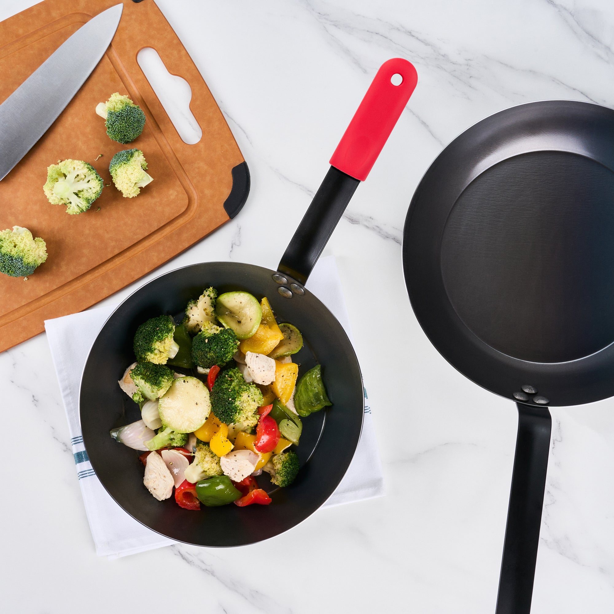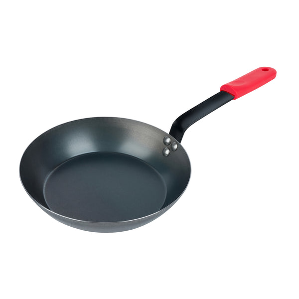 Enhance your culinary prowess with our Met Lux 1 Black Carbon Steel 10" Pre-Seasoned Fry Pan with 1 Red Silicone Pan Handle Sleeve. This cooking pan is non-coated and avoids food from sticking, providing effortless food release and cleanup. Meticulously crafted from 1.5 mm thick carbon steel, this frying pan ensures superior heat distribution, providing even cooking results for all your dishes. Designed to be induction-compatible, this skillet pan broadens your cooking possibilities. The triple-riveted handle of this carbon steel fry pan provides a secure grip, enhancing ease and comfort during use. With a convenient hanging hole, this kitchen skillet offers an efficient storage solution, ideal for maximizing space in busy kitchen environments. This pan handle sleeve is heat-resistant up to 450F, safeguarding your hands from burns and enhancing kitchen safety. The molded indentations of this removable handle sleeve offer a firm and comfortable grip for secure handling of hot pans. With a removable design, this silicone pan handle sleeve allows for effortless attachment and detachment, facilitating quick transitions between pans for efficient cooking. Measuring 18.31 inches in length by 10.25 inches in width by 4.06 inches in height, this 10-inch fry pan provides ample cooking space for a variety of dishes, accommodating all your culinary needs. Each order includes 1 pan and 1 sleeve.
