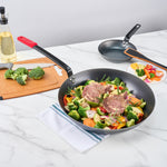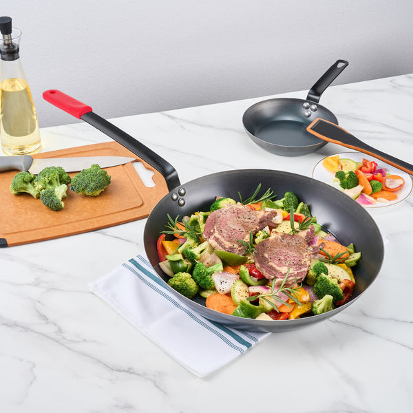 Cook pancakes with our Met Lux 1 Black Carbon Steel 16" Pre-Seasoned Fry Pan with 1 Red Silicone Pan Handle Sleeve. This fry pan is made from 1.5 mm thick carbon steel, offers exceptional heat distribution for even cooking and browning, ensuring consistent results every time. Lightweight yet durable, this carbon steel fry pan makes maneuvering in the kitchen effortless, whether you're flipping pancakes or sauteing vegetables. Boasting a non-coated surface, this frying pan provides superior performance and adds a touch of elegance to your cookware collection. The triple-riveted handle of this cooking pan ensures a secure connection, facilitating enhanced control in cooking. For added convenience, this skillet pan features a hanging hole, allowing for easy storage and quick access in busy kitchen environments. Designed for hand washing, this carbon steel skillet ensures optimal care and maintenance to extend its lifespan. Withstanding heat up to 450F, this removable handle sleeve keeps your hands cool and secure, even during the busiest cooking times. The molded indentations on this pan handle sleeve provide a secure grip, reducing the chances of slips and spills, which is crucial for maintaining kitchen safety. With a removable design, this silicone pan handle sleeve allows for easy cleaning and storage, fitting seamlessly into any kitchen routine. Including the handle, this 16-inch fry pan measures 28.54 inches in length by 15.75 inches in width by 5.79 inches in height. Each order includes 1 pan and 1 sleeve.