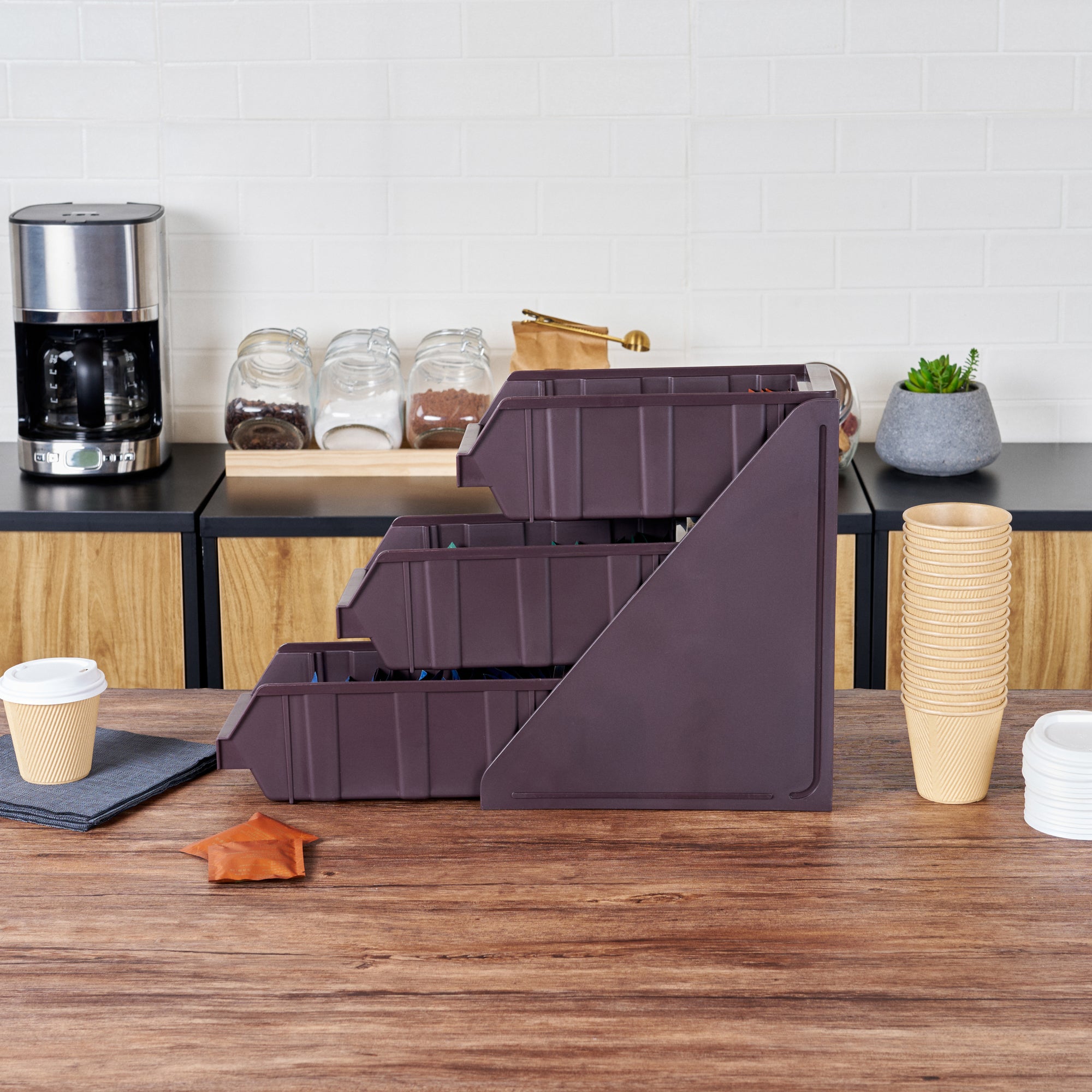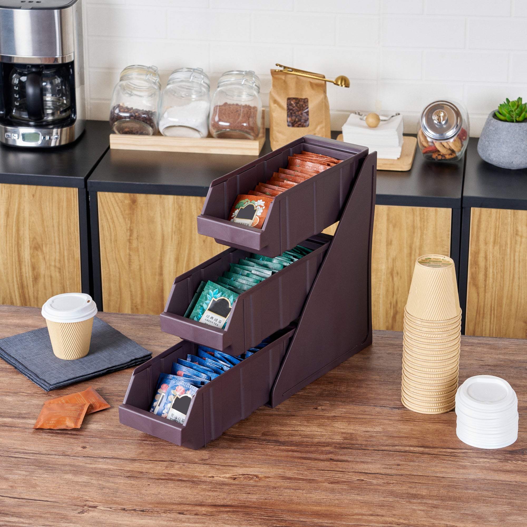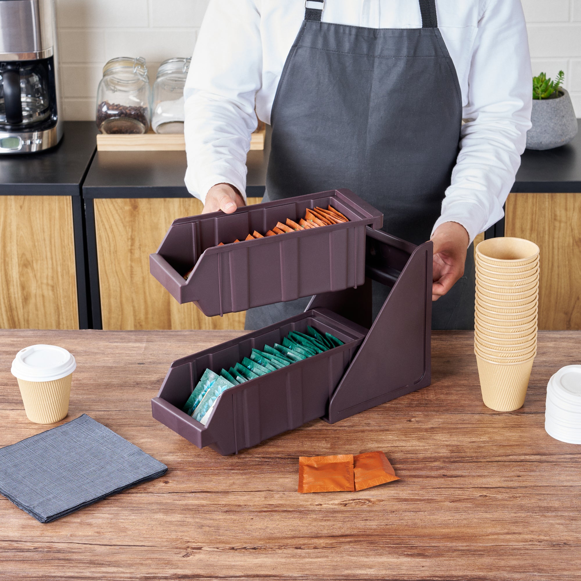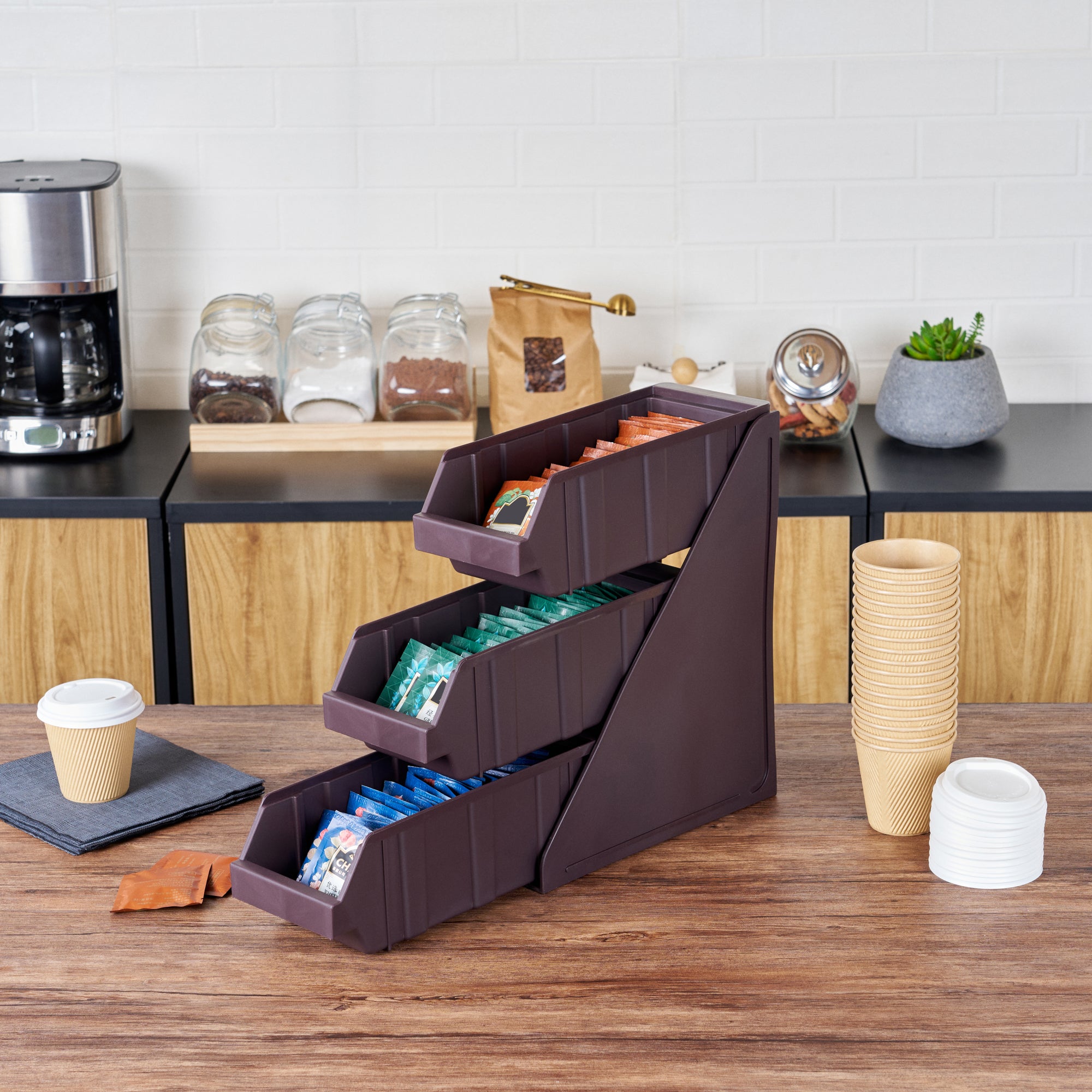 Elevate your foodservice setup with our Bundle: Met Lux 1 Brown 3-Tier Stand and 3 Condiment Bins, designed to streamline your operations with style and efficiency. This bundle includes one durable brown plastic 3-tier stand and three matching condiment bins, creating a seamless and organized workspace for self-serve beverage stations or take-out order preparation areas. The vertical design of the stand maximizes counter space, allowing you to make the most of your available area while maintaining a sleek appearance. Easily customize your configuration by combining multiple stands using connector clips, offering flexibility to adapt to your specific needs. The brown finish of both the stand and bins blends effortlessly with various decor styles, ensuring a cohesive and professional look in any setting. The stand's sturdy construction provides stability for the condiment bins, keeping everything neatly organized and easily accessible for customers or staff. Measuring 11.57 inches in length, 5.59 inches in width, and 13.78 inches in height, this compact yet efficient bundle is perfectly sized to fit in various foodservice environments. Each order includes one 3-tier stand and three condiment bins, providing a complete solution for your organization needs.