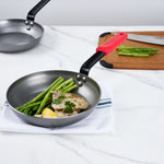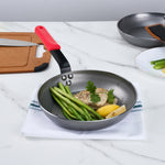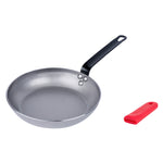 Transform your kitchen operations with our Met Lux 6 Carbon Steel 9.5" Non-Stick Fry Pan with 1 Red Silicone Pan Handle Sleeve. This fry pan, made from 3 mm thick carbon steel, offers exceptional durability and optimal heat distribution for even cooking. The lightweight design of this fry pan makes the cooking process simpler, making it essential in any dynamic kitchen. Once seasoned, this hand-washable skillet pan develops non-stick properties, significantly improving your cooking experience. The oven-safe capability of this fry pan allows you to transition dishes effortlessly from the stovetop to the oven. Plus, the triple-riveted handle of this carbon steel fry pan provides a secure grip, giving you confidence while cooking and transferring the pan. This induction-safe fry pan offers a versatile frying solution. The hanging hole on the handle of this fry pan enables convenient storage, saving valuable kitchen space. Plus, the red silicone removable pan handle sleeve is heat-resistant up to 450F, protecting your hand from burns. Molded indentations on this sleeve ensure a firm grip even in high-heat situations, and its removable design allows for flexible use on multiple pans. For added convenience, this handle sleeve features a hanging loop for easy storage and is dishwasher-safe for effortless maintenance. Measuring 16.73 inches in length by 9.45 inches in width by 3.86 inches in height, this 9.5-inch pan offers ample space for various dishes. Each order includes 1 pan and 1 sleeve.
