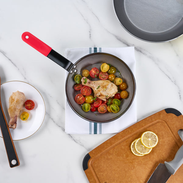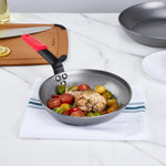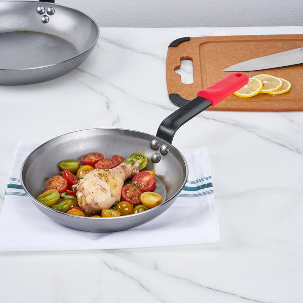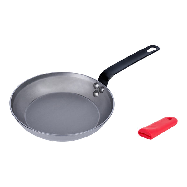 Rejuvenate your kitchen toolkit with our Met Lux 6 Carbon Steel 9" Non-Stick Fry Pan with 1 Red Silicone Pan Handle Sleeve. Crafted for excellence, this 9-inch pan is made from 3 mm thick carbon steel which ensures longevity and perfect heat conduction for consistent results. Lightweight yet robust, this fry pan is essential for the dynamic culinary demands of any kitchen. The non-stick surface of this fry pan develops post-seasoning, making cooking and subsequent cleaning effortless. Refined for versatility, this fry pan can move from stovetop to oven, thanks to its oven-safe design. This carbon steel pan boasts a triple-riveted secure handle for confident maneuvers. Compatible with all stovetops, including induction, this fry pan's utility is unparalleled. Easily store this fry pan with the hanging hole. The included red silicone sleeve is designed to protect hands up to 450F and features an ergonomic grip for safe handling. This handle sleeve is removable, suitable for multiple pans, and dishwasher safe for hassle-free maintenance. Measuring 15.55 inches in length by 8.66 inches in width by 3.74 inches in height, this 9-inch pan offers ample space for a variety of dishes. Each order includes 1 pan and 1 sleeve.
