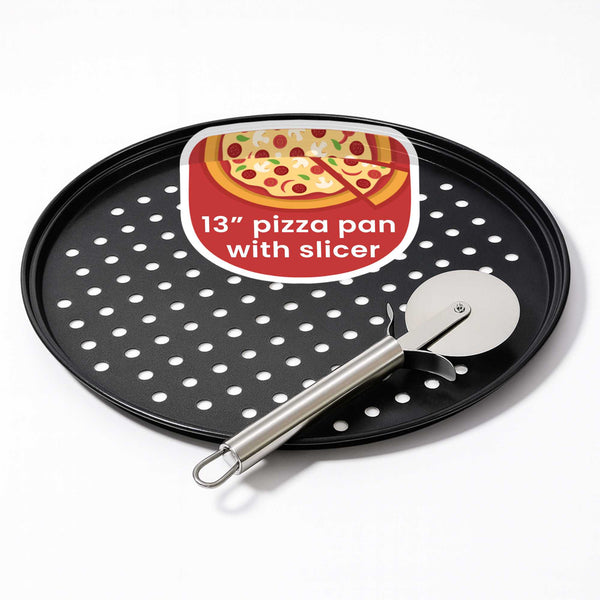 Elevate your pizza-making experience with a complete baking and slicing set. The Pizza-Making Essentials Bundle pairs a 13-inch perforated carbon steel pizza disk with a 7.8" by 2.6" stainless steel pizza cutter to help you craft and serve pizzas with professional precision. The perforated pizza pan promotes superior airflow and even heat distribution, ensuring crisp, evenly baked crusts that rival your favorite pizzeria. Designed with a durable non-stick surface, it prevents dough from sticking or tearing, making it easy to transfer and serve your creations. The included stainless steel pizza cutter features a protective finger guard and ergonomic handle, providing safe, comfortable slicing for both home cooks and busy commercial kitchens. Built from high-quality materials, these tools withstand frequent use while delivering consistent, reliable performance. Each order includes one perforated pizza disk and one stainless steel pizza cutter as a convenient bundle.