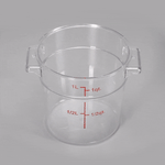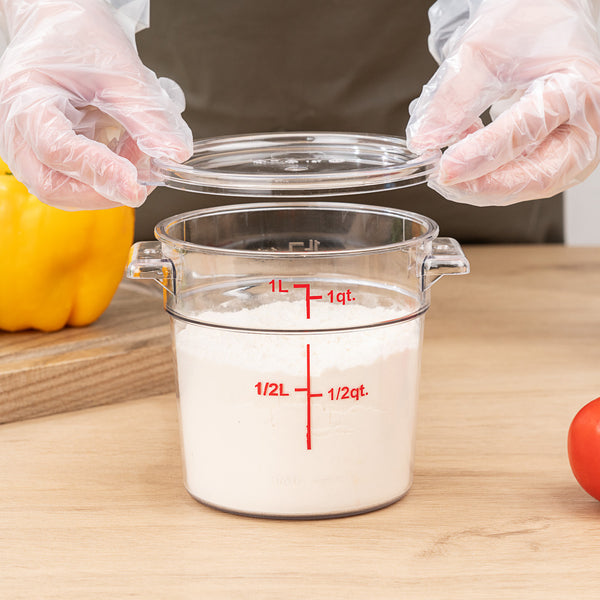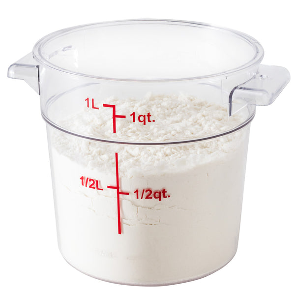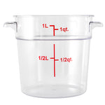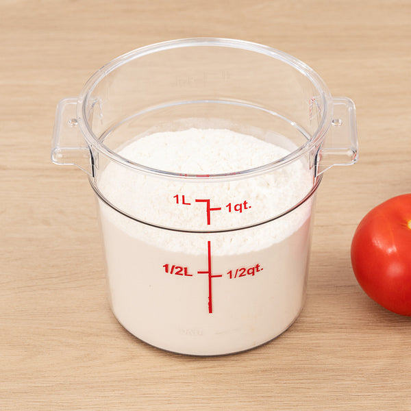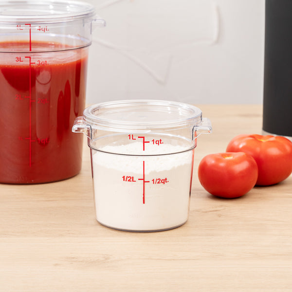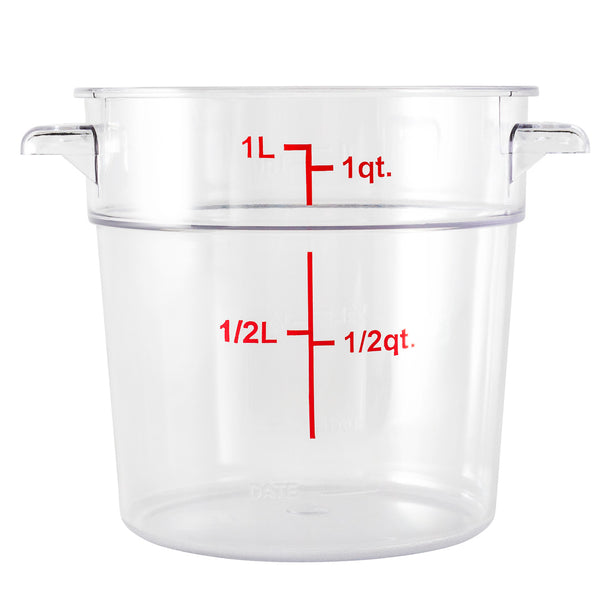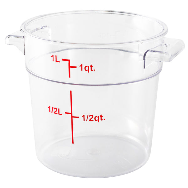 Easily keep track of your inventory with our Met Lux 1-quart Round Clear Plastic Food Storage Container. With red quart and liter graduations, this commercial food storage container allows you to practice proper inventory management. Designed with a clear finish, this food container displays your ingredients for quick identification. The handles of this food prep container provide a comfortable grip while transporting vegetables to your storage room. Crafted from high-quality plastic, this professional food container endures temperatures from -40F to 210F. Great for storing sliced peppers or tomato paste, this freezer-safe container is stain and odor-resistant to maintain their premium appearance. This plastic food container is dishwasher-safe to shorten cleanup during and after shifts. Featuring a round shape, this clear food container is stackable to save space in your storage area. Combine this round food container with our compatible lid to prevent leaks and spills. This 1-quart graduated food container measures 5 inches in diameter and 4.75 inches in height. Sold in a 1 count box. Food storage lid (SKU: RWT0845-1) is available and sold separately.