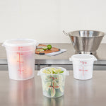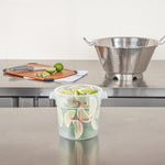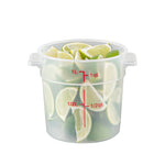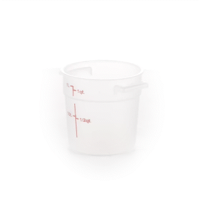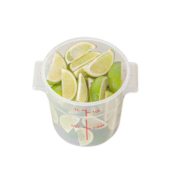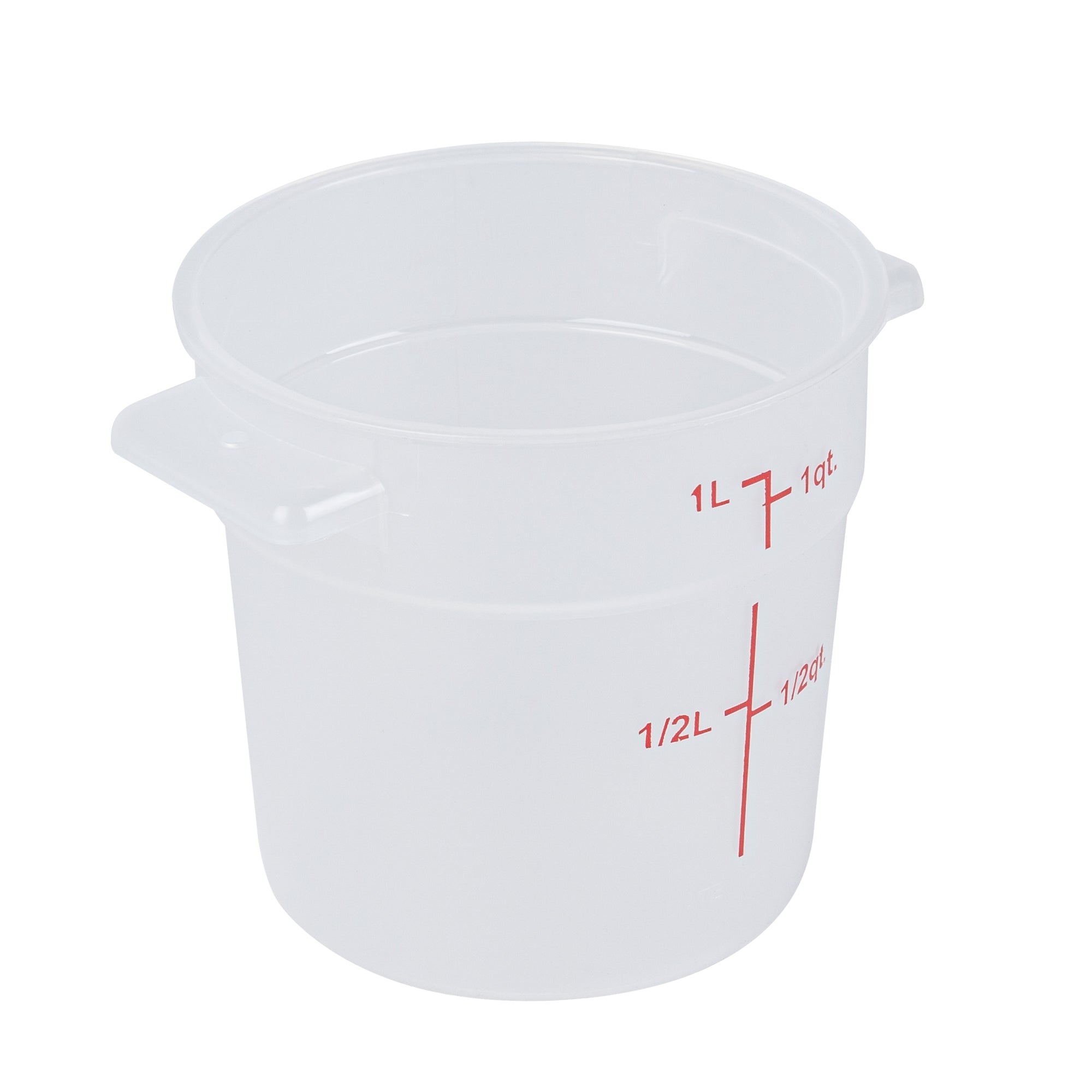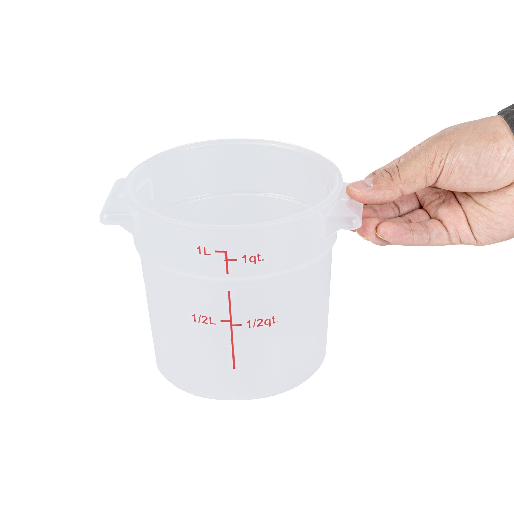 Our Met Lux 1-quart Round Translucent Plastic Food Storage Containers are a versatile and efficient solution for all your food storage needs. Crafted from durable pp plastic, these food storage containers are designed to withstand daily use in a busy kitchen environment. With red volume graduations, these round plastic food containers make it easy to measure out precise portions, reducing waste and saving on food costs. The sturdy handles of these storage containers enhance the stability and ease of transport, ensuring a secure grip even when the container is full. These translucent food containers are dishwashable and freezable, providing you with more options for food preparation and storage. Designed to withstand temperatures from -40 to 160 degrees Fahrenheit, these round plastic containers are perfect for storing a variety of foods, from chilled salads to hot soups. With a capacity of 1 quart and measuring 5 inches in diameter by 5 inches in height, these plastic food containers possess plenty of room for storing your delicious creations. Pair these storage container lids with our compatible lids (SKU: RWT1569C) to provide a tight seal, keeping your food fresh and protected. Sold in a 10 count box. Lids are available and sold separately.