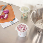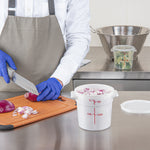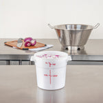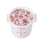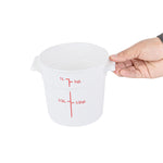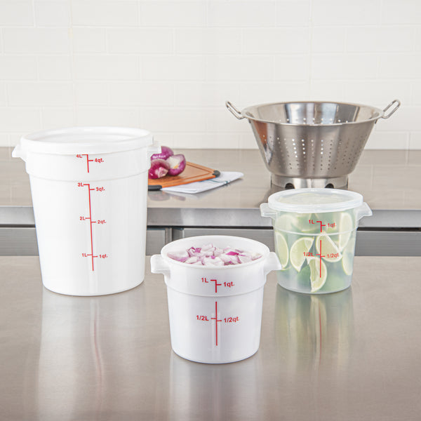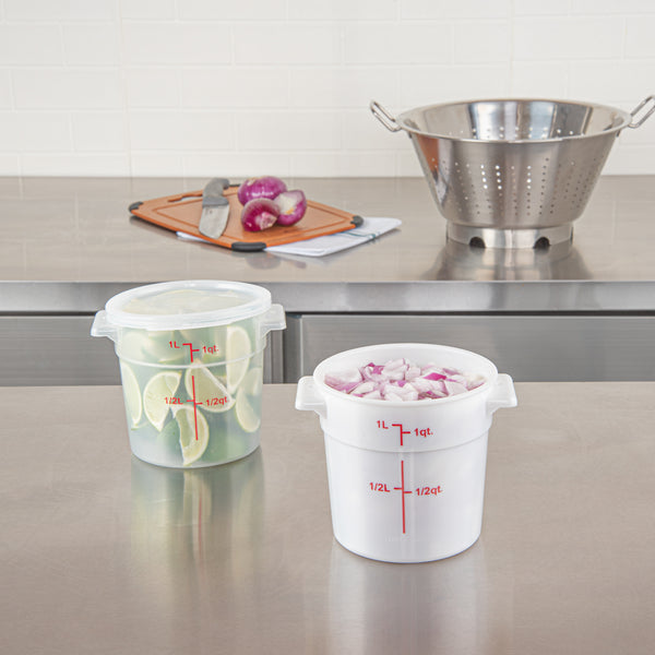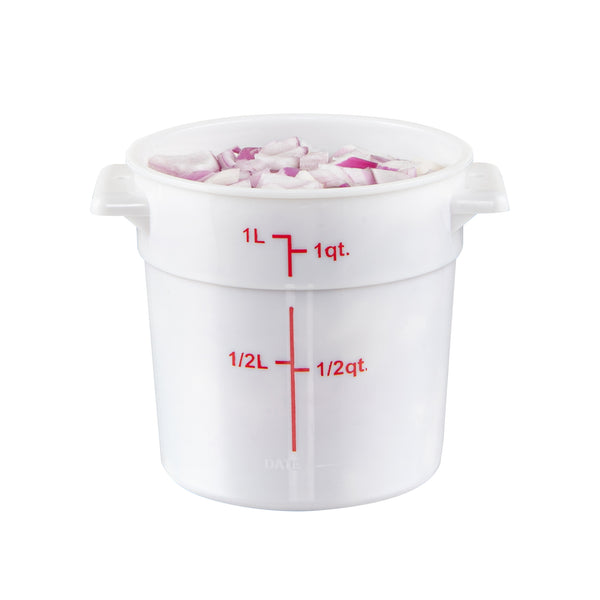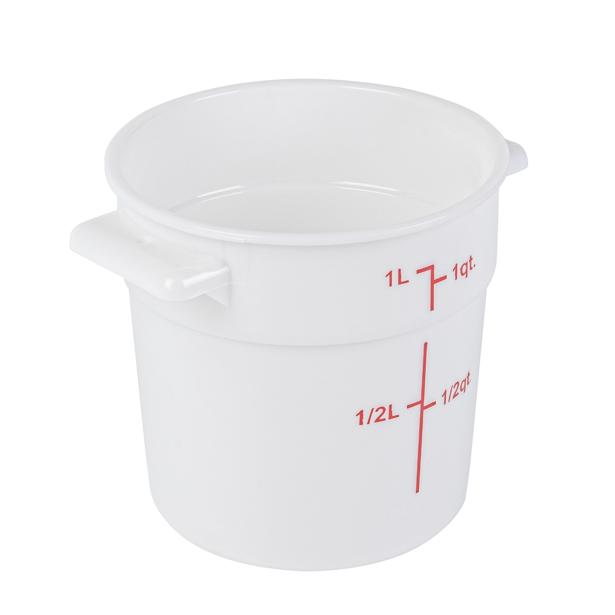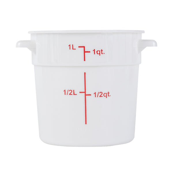 Elevate your kitchen organization with our Met Lux 1-quart Round White Plastic Food Storage Container. This food storage container is crafted from durable PP plastic, ensuring long-lasting use in any busy kitchen. Featuring red volume markers and graduations, this plastic food storage container allows for easy measurement and portion control. Equipped with a stable handle, this food container provides a convenient grip for effortless transportation. Designed for versatility, this round plastic food container is dishwashable and freezable, making it perfect for both hot and cold applications. Able to withstand temperatures ranging from -40F to 160F, this white food container ensures the security and freshness of your ingredients. Boasting a generous 1-quart capacity, this round plastic container offers ample space for storing a variety of food items. Measuring 5 inches in diameter by 5 inches in height, this round storage container is a compact storage solution. Pair this storage container with a compatible lid (SKU: RWT1569C-1) for a secure seal. Sold in a 1 count box. Lid is available and sold separately.
