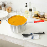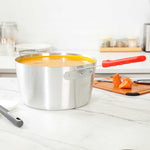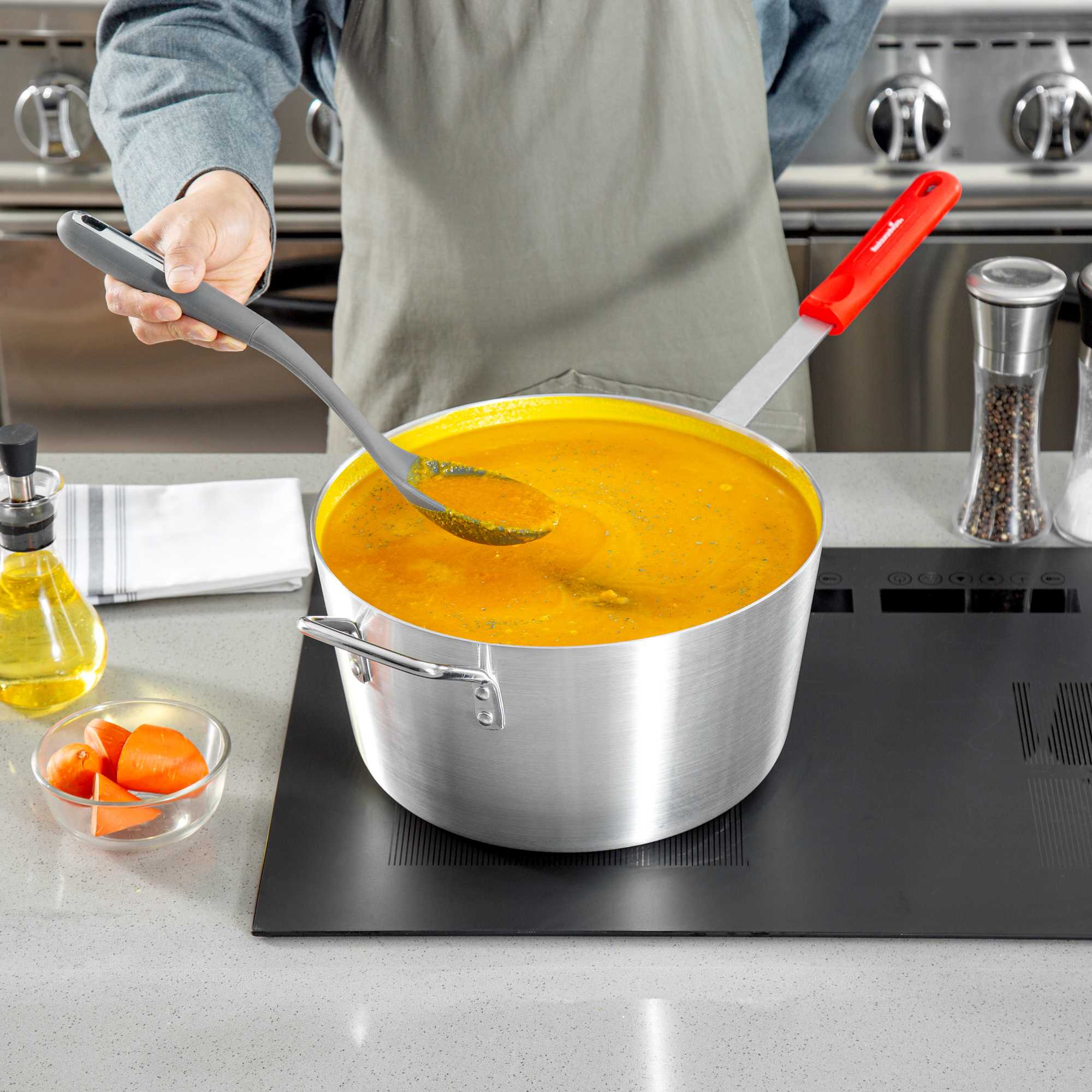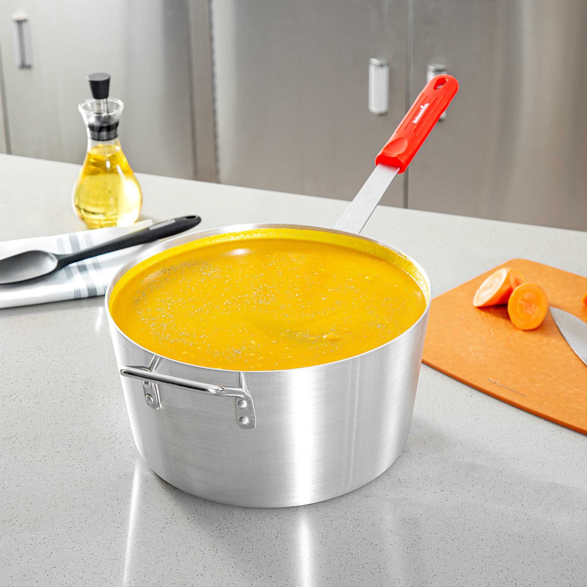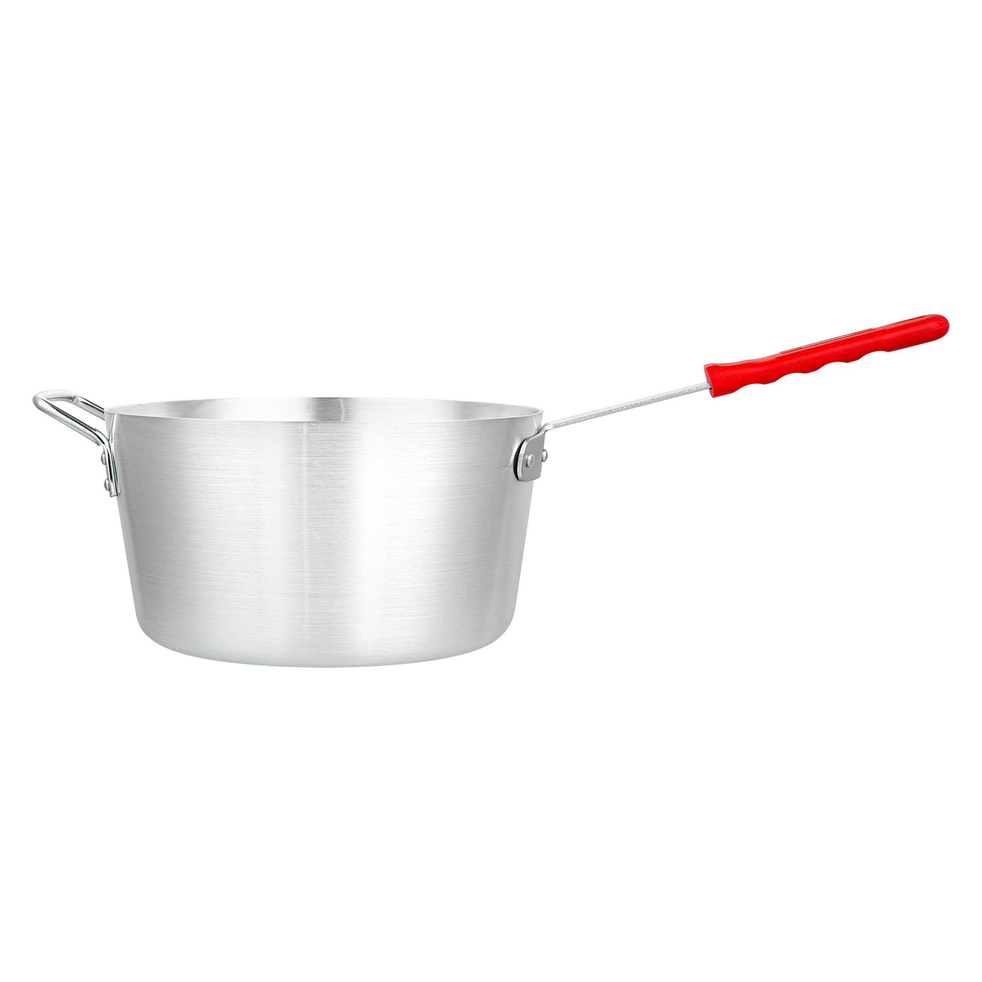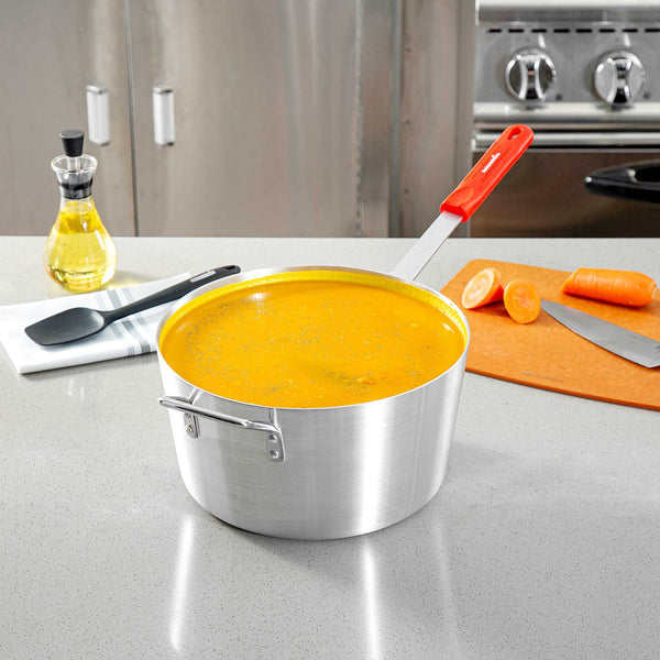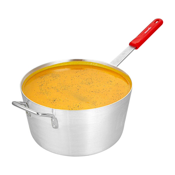Achieve precise culinary results with this versatile 10 qt sauce pan. The Met Lux Heat Distribution Sauce Pan is expertly crafted with a tapered aluminum design, promoting efficient stirring and cooking at lower temperatures, ideal for busy kitchens. Constructed from 2.5-millimeter thick 3003 series aluminum, this 10 quart aluminum cooking pot ensures excellent heat distribution and resists warping, making it a reliable choice for both home cooks and commercial chefs. This commercial sauce pan features a red silicone handle that remains cool up to 450F, providing a secure, comfortable grip that minimizes burn risks. Compatible with standard lids (sold separately), this pan offers versatile cooking applications, seamlessly integrating into any cookware collection. With a sleek silver finish and dimensions of 24.41 inches in length, this sauce pan combines practicality with a professional look. Sold in a 1 count box.