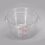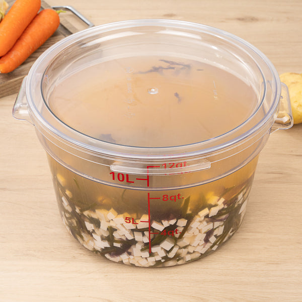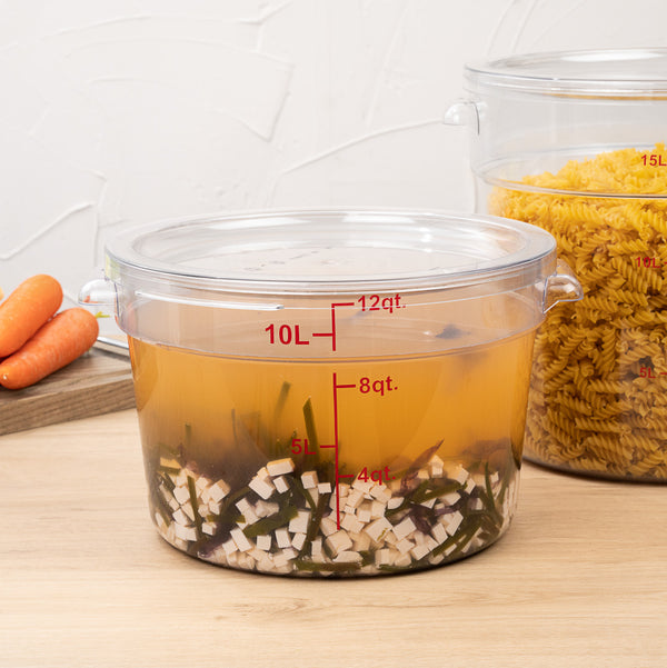 Perfectly store a variety of hot and cold ingredients using our Met Lux 12-quart Round Clear Plastic Food Storage Container. Ideal for measuring produce, this freezer-safe container has red volume markers printed on the side that measures up to 10 liters and 12 quarts. This durable plastic container for food is stain-resistant, odor-resistant, and designed to endure constant use in your commercial kitchen. Made to pair with our coordinating lid (SKU: RWT0855-1), this plastic kitchen container is great for keeping meals fresh. Perfect for safely carrying ingredients throughout busy kitchens, this food container is equipped with 2 built-in handles. This plastic kitchen container can endure temperatures between -401F to 210F, allowing you to safely store hot and cold ingredients. With a clear finish and wide base, this container for food is great for storing large amounts of ingredients while providing maximum visibility. To quickly clean up after use, this plastic kitchen container is conveniently dishwasher-safe. Measuring 12.25 inches in diameter by 8 inches in height, this 12-quart kitchen container is sold in a 1 count box. The lid is available and sold separately.