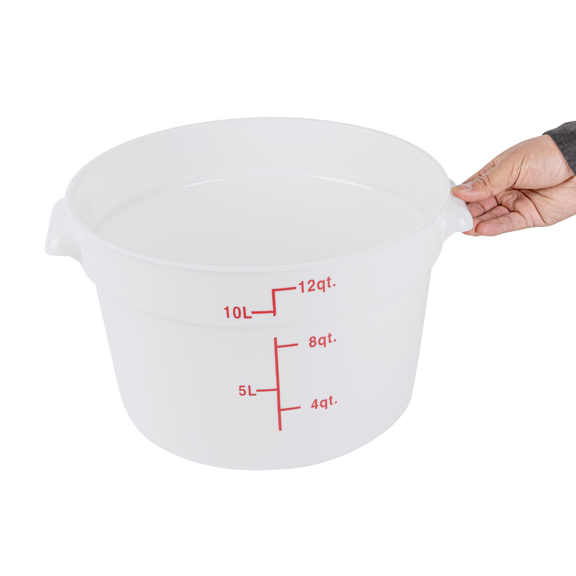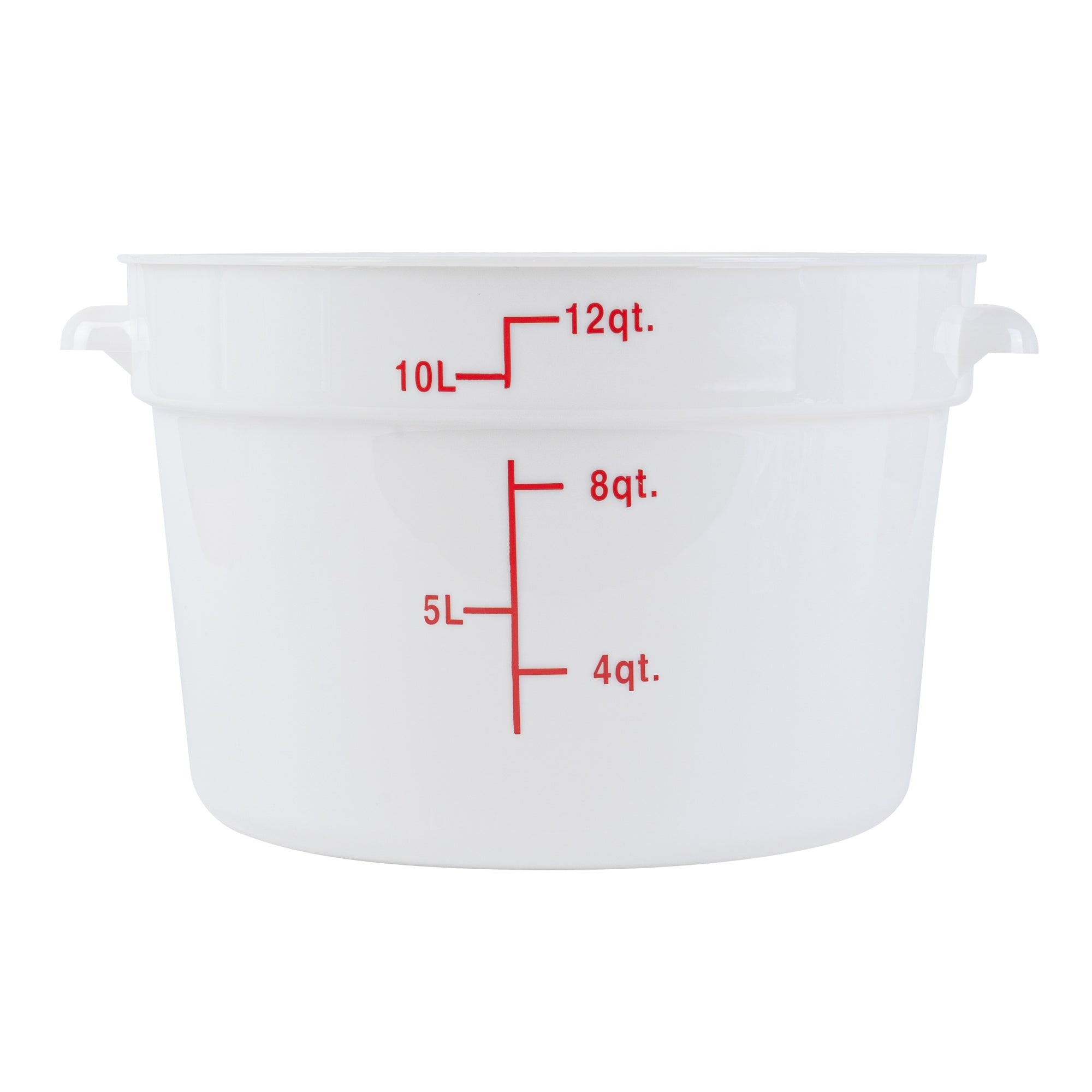 Upgrade your kitchen's organization with our Met Lux 12-quart Round White Plastic Food Storage Containers. Durably constructed from PP plastic, these food storage containers are designed to withstand temperatures ranging from -40 to 160 degrees Fahrenheit, making them perfect for storing hot or cold foods. With red volume markers and graduations, these plastic food storage containers make it easy to measure and track your ingredients. Featuring stable handles, these food containers allow for convenient transport and handling in busy commercial kitchens. Designed to be dishwashable and freezable, these round plastic food containers make cleaning and storing a breeze. Paired with compatible lids (SKU: RWT1579C), these white food containers ensure freshness and easy identification of contents. Boasting a 12-quart capacity, these round plastic containers offer ample storage space for your ingredients while measuring 12.25 inches in diameter by 8 inches in height. Sold in a 10 count box. Lids are available and sold separately.