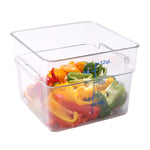 Conveniently store ingredients or prepared foods using our Met Lux 12-quart Square Clear Plastic Food Storage Container. Featuring blue volume markers in liters and quarts, this food container box allows you to measure, portion, and store ingredients. Built to resist stains and odors, this durable food container is made to maintain its high-quality design and withstand frequent use. This plastic kitchen container has a clear finish which provides you with full visibility to quickly identify ingredients in your freezer or refrigerator. This food storage container features sturdy handles to ensure you have a secure and comfortable grip when transporting ingredients from your prep area to your storage room. Cover this container with our compatible food storage lids (SKU: RWT0843-1) to keep food safe and prevent spilling during transport. Ideal for storing all types of ingredients, this freezer-safe food container can withstand temperatures from -40F to 210F. This kitchen storage container is stackable for quick and simple storage in your commercial kitchen. Containing up to 12 quarts, this dishwasher-safe food box measures 11 inches wide by 8 inches tall. Sold in a 1 count box. Lid is available and sold separately.