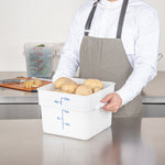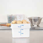 Maximize efficiency in your kitchen with precise portion control. The Met Lux Graduated Plastic Food Container, featuring blue graduations, empowers chefs to manage inventory effectively and reduce waste. Designed for demanding settings, this storage container boasts stable handles that ensure effortless transport, minimizing spillage during peak hours. Made from durable PP plastic, it withstands the rigors of high-demand kitchens, ensuring longevity and reliability. This dishwasher safe food container measures 10.88 inches in length, 10.88 inches in width, and 8 inches in height, offering a spacious 12-quart capacity for versatile storage options. Its white color enhances visibility, while being both hot and cold food friendly adds to its versatility. Choose this exceptional storage solution to optimize your operations with a reliable plastic food container. Each order includes 10 Met Lux Graduated Plastic Food Containers.