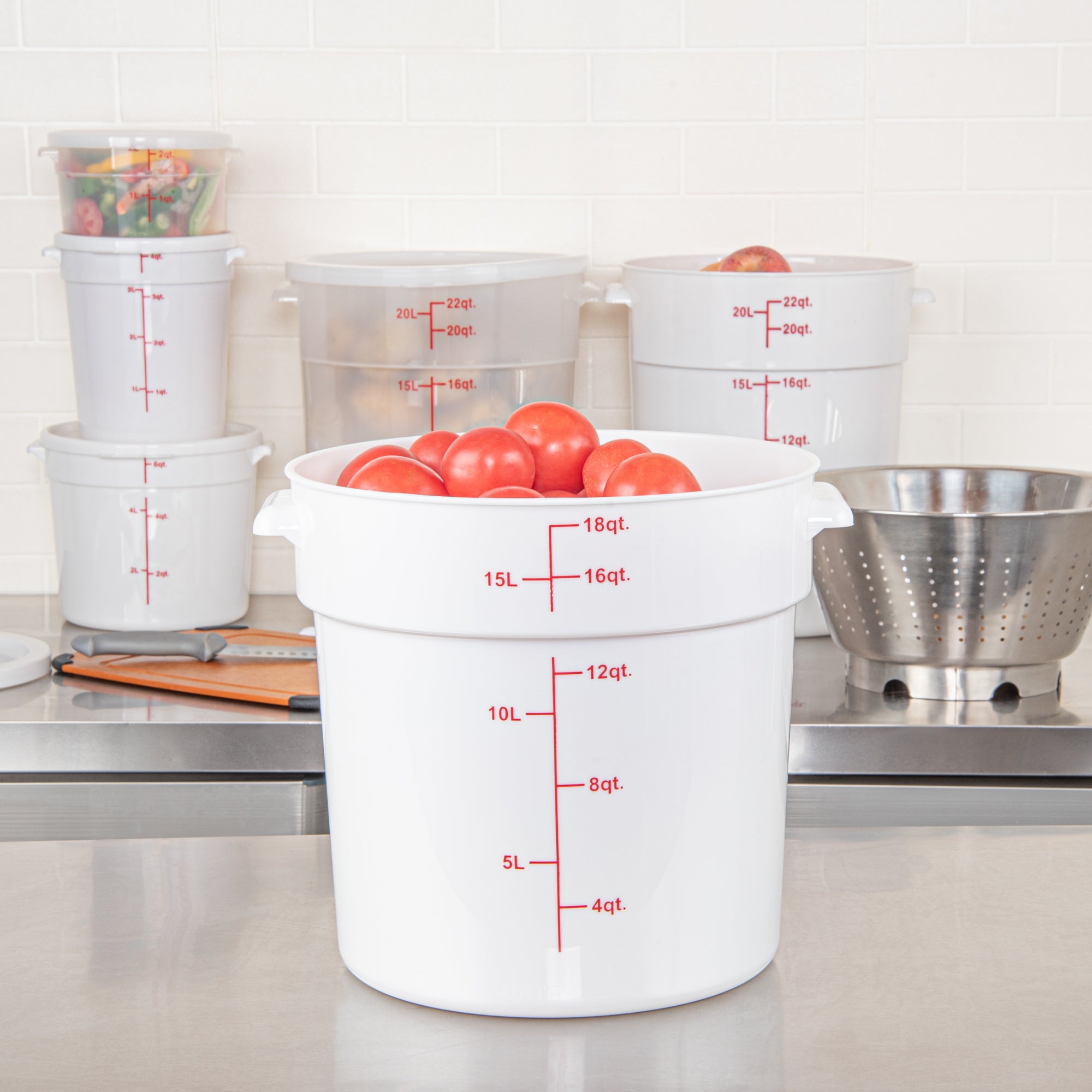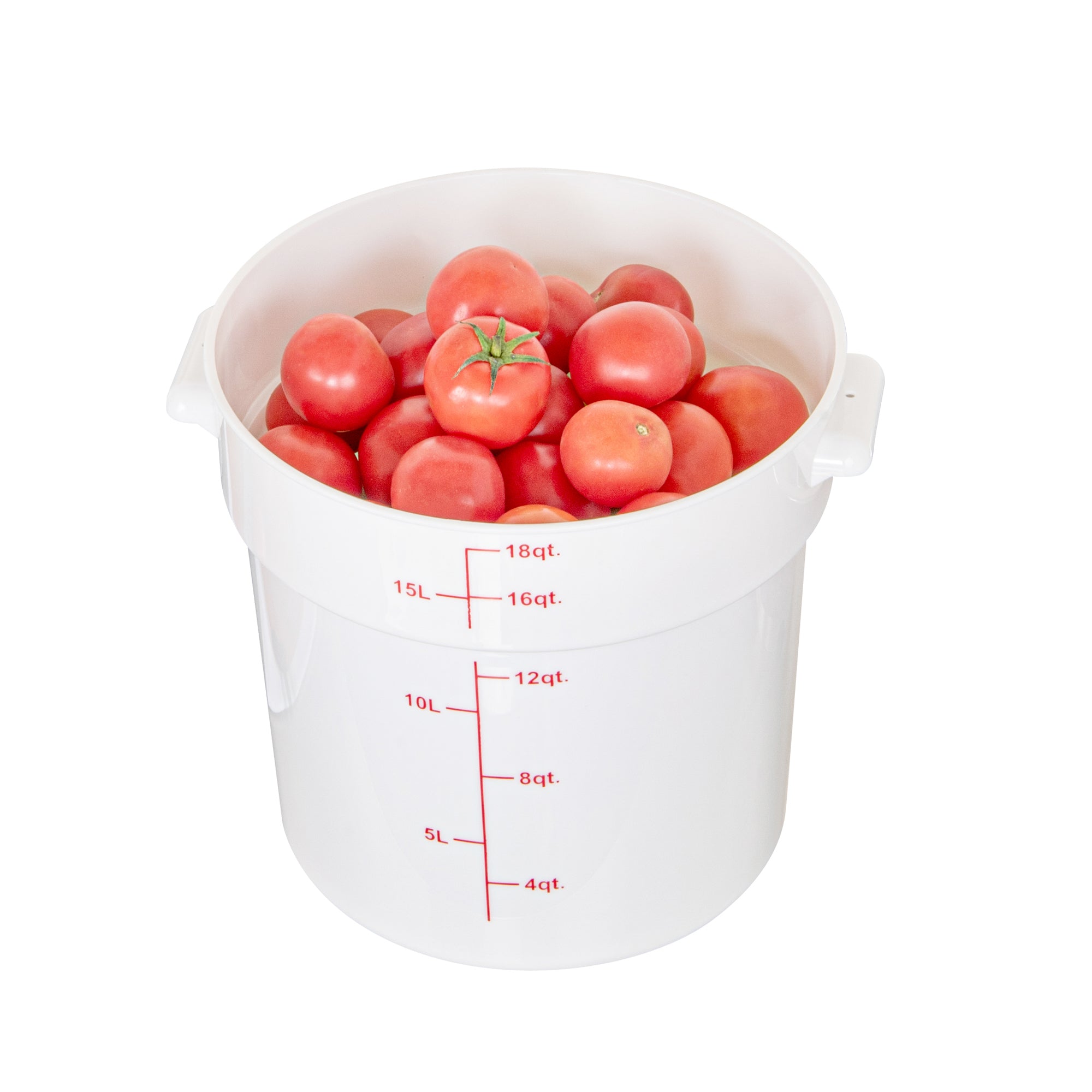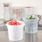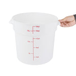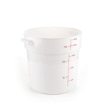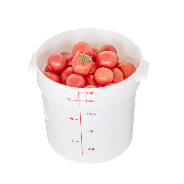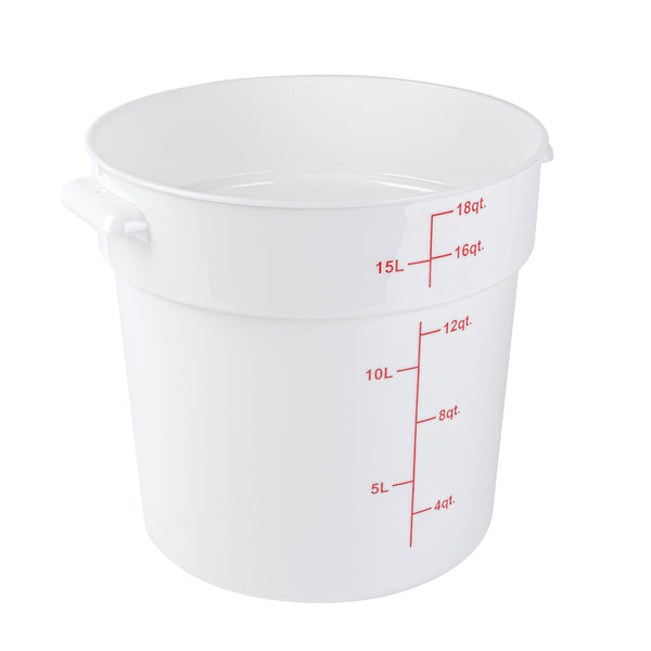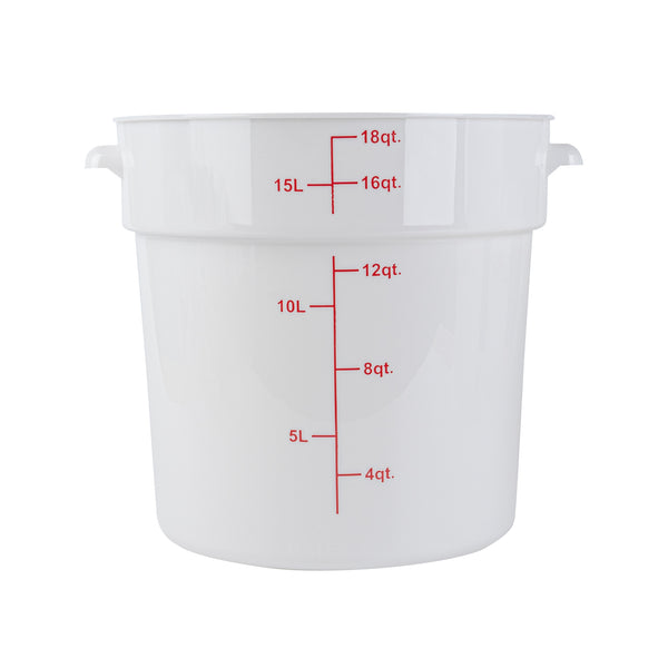 Upgrade your food storage solutions with our Met Lux 18-quart Round White Plastic Food Storage Container. The durable PP plastic construction ensures this food container withstands daily use in busy commercial kitchens while maintaining its shape. Featuring red volume markers, this round plastic food container allows for easy measurement of ingredients and portion control. Conveniently equipped with a stable handle, this storage container provides a secure grip for effortless transport. Designed to withstand temperatures ranging from -40 to 160 degrees Fahrenheit, this white food container is suitable for use in the freezer and dishwasher, streamlining your food handling process. Pair this round plastic container with a matching lid (SKU: RWT1579C-1) to create a tight seal, keeping contents fresh and protected. With a generous 18-quart capacity and measuring 12.25 inches in diameter by 12 inches in height, this food storage container offers ample space for storing a variety of ingredients and prepared meals. Sold in a 1 count box. Lid is available and sold separately.