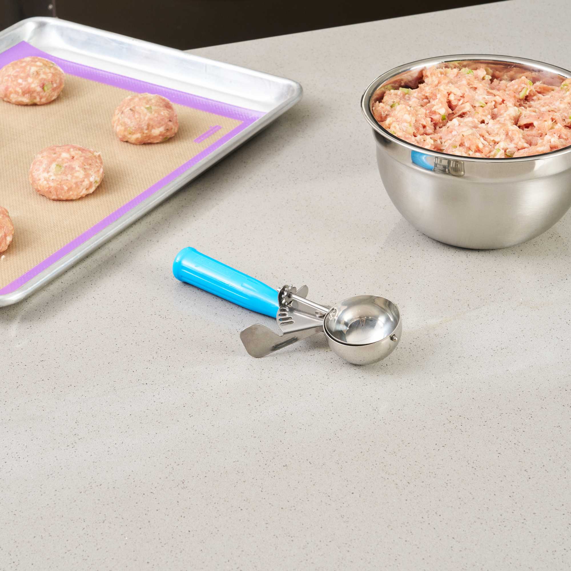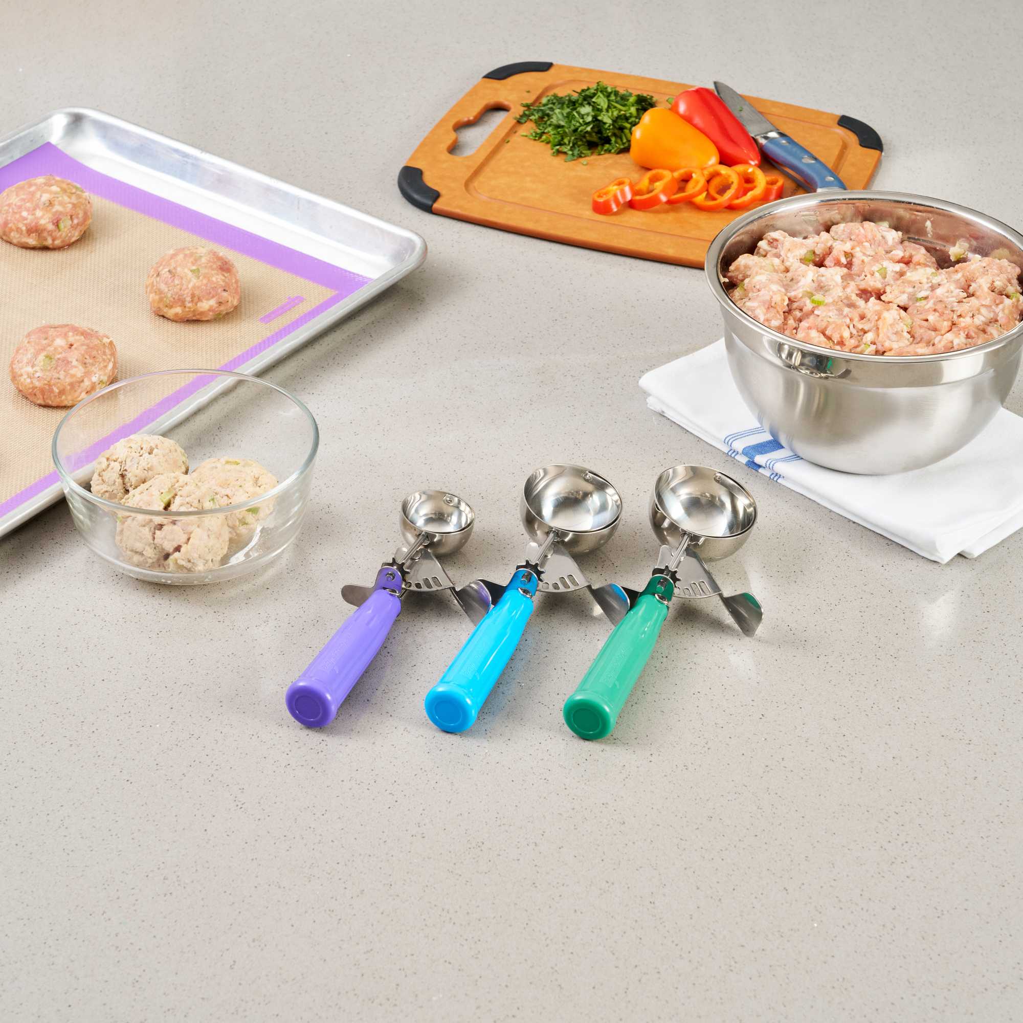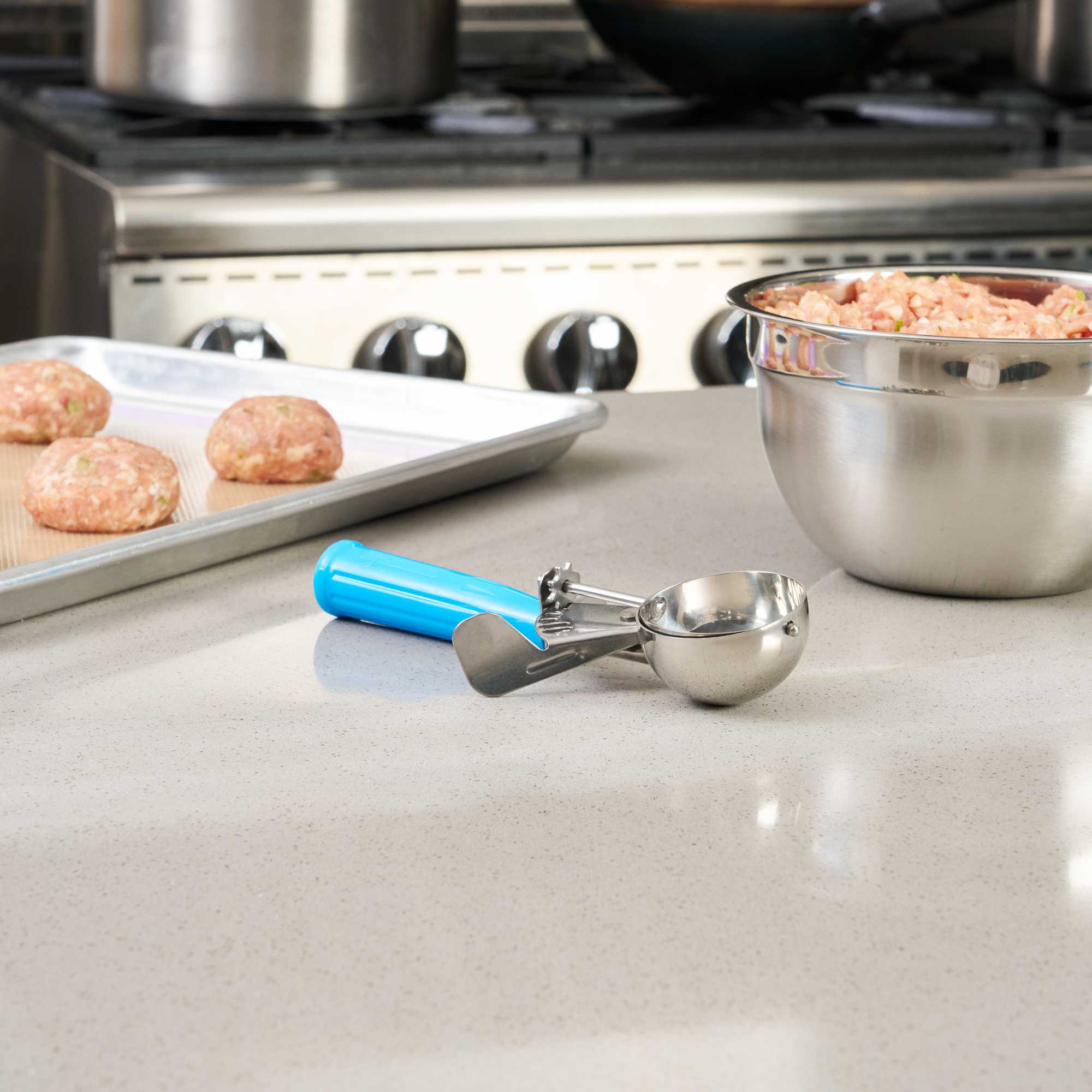 Ideal for preparing evenly baked desserts and accurately portioned meals! These scoops with trigger allow you to easily scoop cookie dough, cupcake batter, meatballs, mashed potatoes, and more in seconds.