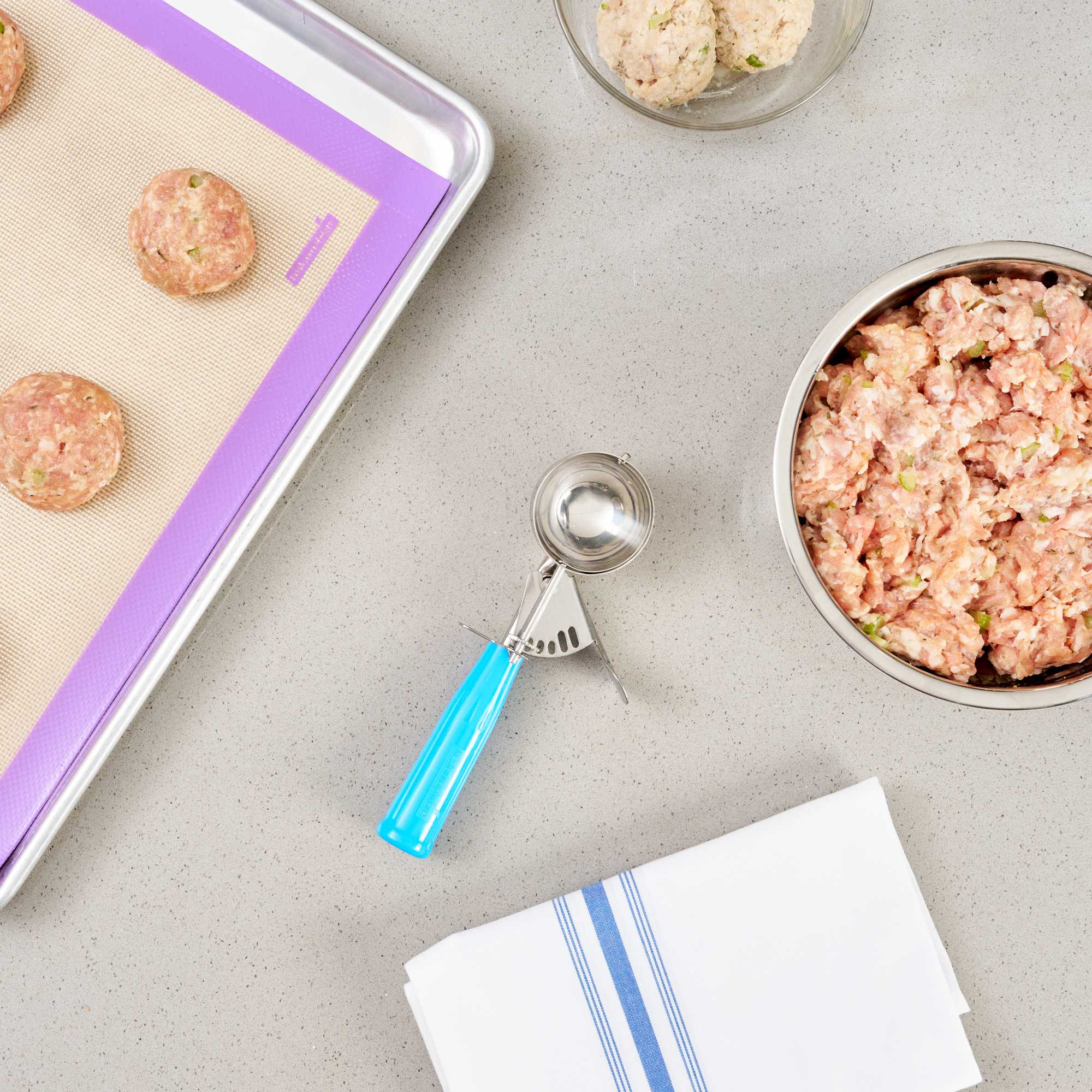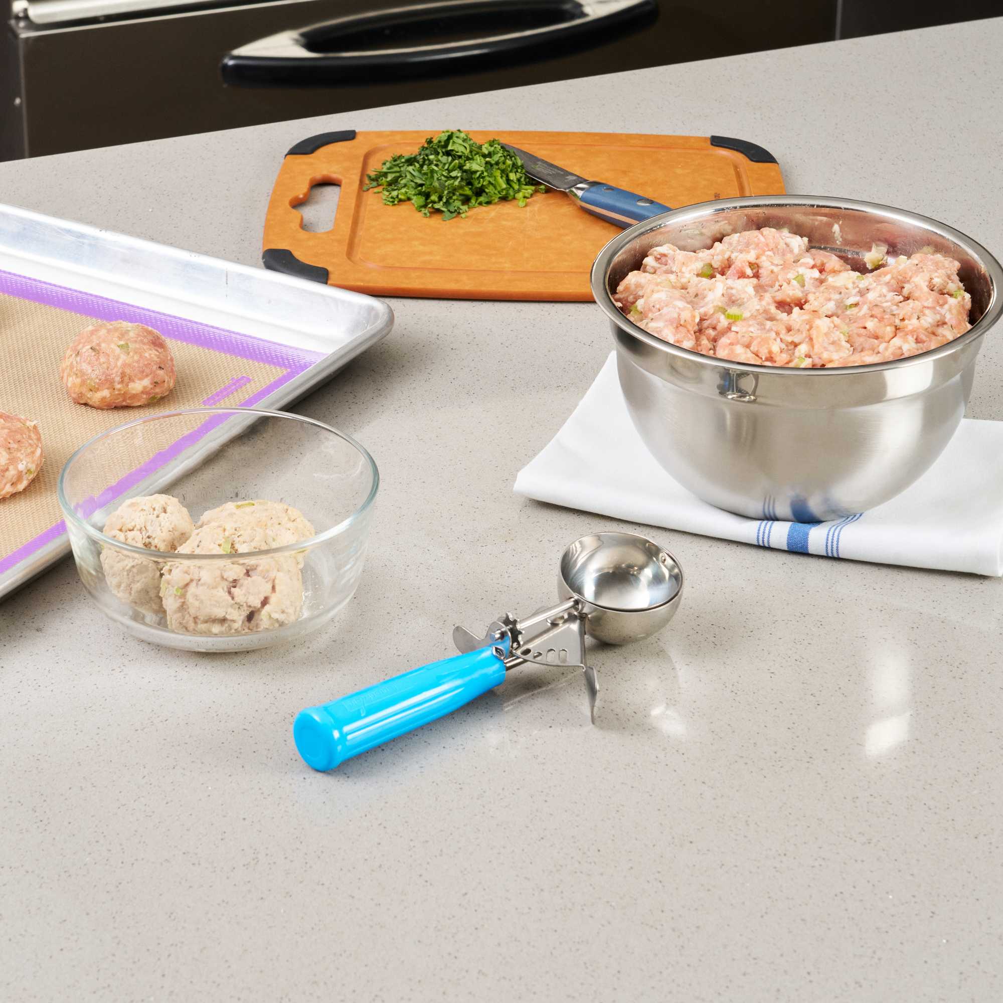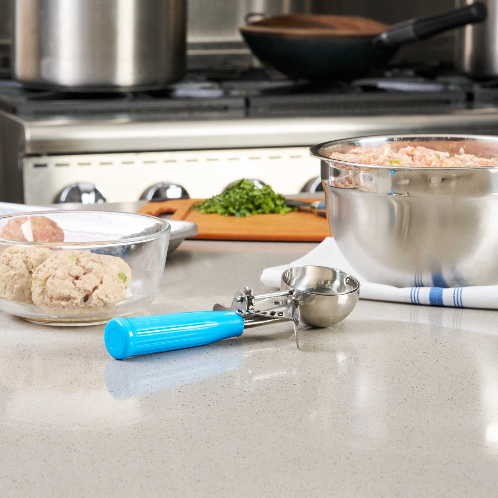 Ideal for preparing evenly baked desserts and accurately portioned meals! These scoops with trigger allow you to easily scoop cookie dough, cupcake batter, meatballs, mashed potatoes, and more in seconds.