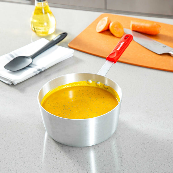 Enhance your cooking experience with a versatile saucepan built for performance. The Met Lux Aluminum Saucepan features a tapered design that promotes efficient stirring and cooking, making it an essential tool for both commercial kitchens and home chefs. Constructed from 3003 series, 2.5 millimeter thick aluminum, this saucepan offers excellent heat distribution and consistency, ensuring that your dishes are cooked evenly. The red silicone handle stays cool to the touch, minimizing burn risks and providing a safe grip, which is particularly beneficial in busy settings. This silicone handle saucepan is also oven safe, allowing for versatile cooking applications in professional kitchens, whether you're simmering sauces or boiling liquids. With dimensions of 14.96 inches in length, 8.27 inches in width, and 5.51 inches in height, this 2.75 quart aluminum saucepan is compatible with standard lids (sold separately). Sold in a 1 count box.