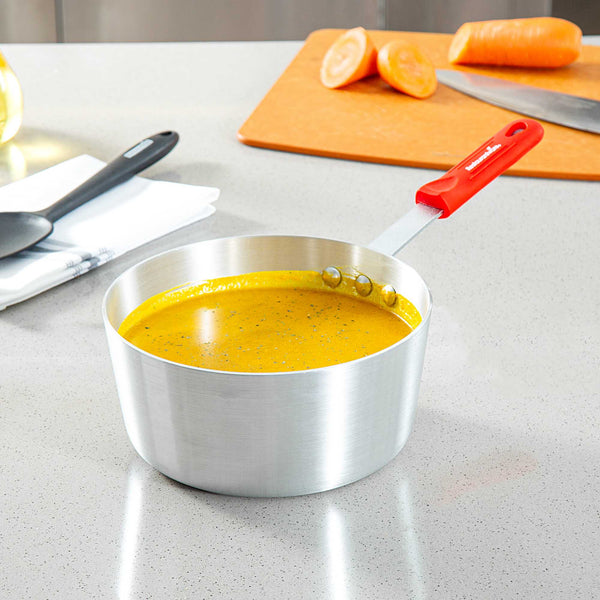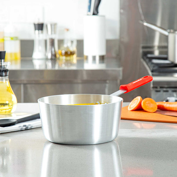 Enhance your cooking experience with a versatile saucepan built for performance. The Met Lux Aluminum Saucepan features a tapered design that promotes efficient stirring and cooking, making it an essential tool for both commercial kitchens and home chefs. Constructed from 3003 series, 2.5 millimeter thick aluminum, this saucepan offers excellent heat distribution and consistency, ensuring that your dishes are cooked evenly. The red silicone handle stays cool to the touch, minimizing burn risks and providing a safe grip, which is particularly beneficial in busy settings. This silicone handle saucepan is also oven safe, allowing for versatile cooking applications in professional kitchens, whether you're simmering sauces or boiling liquids. With dimensions of 14.96 inches in length, 8.27 inches in width, and 5.51 inches in height, this 2.75 quart aluminum saucepan is compatible with standard lids (sold separately). Sold in a 12 count box.