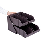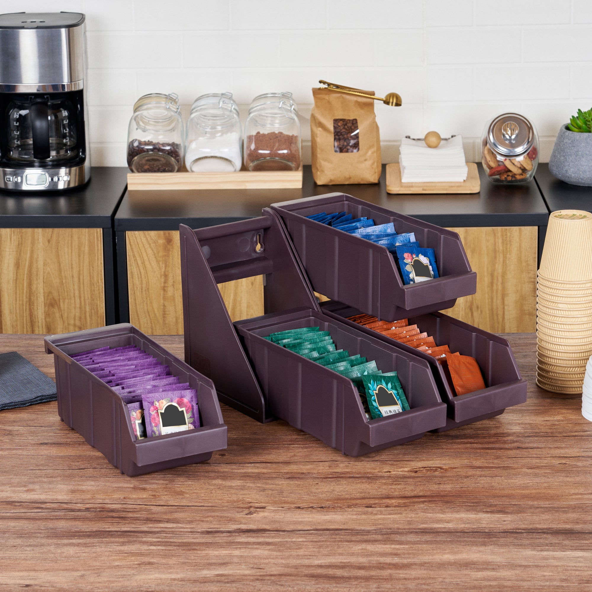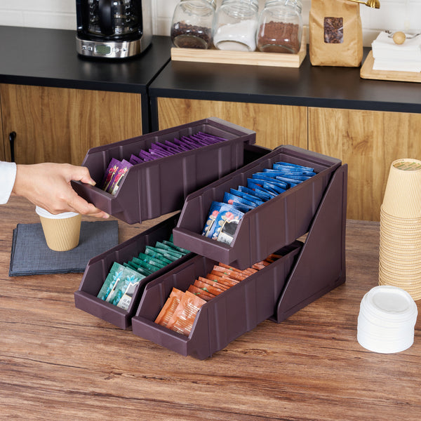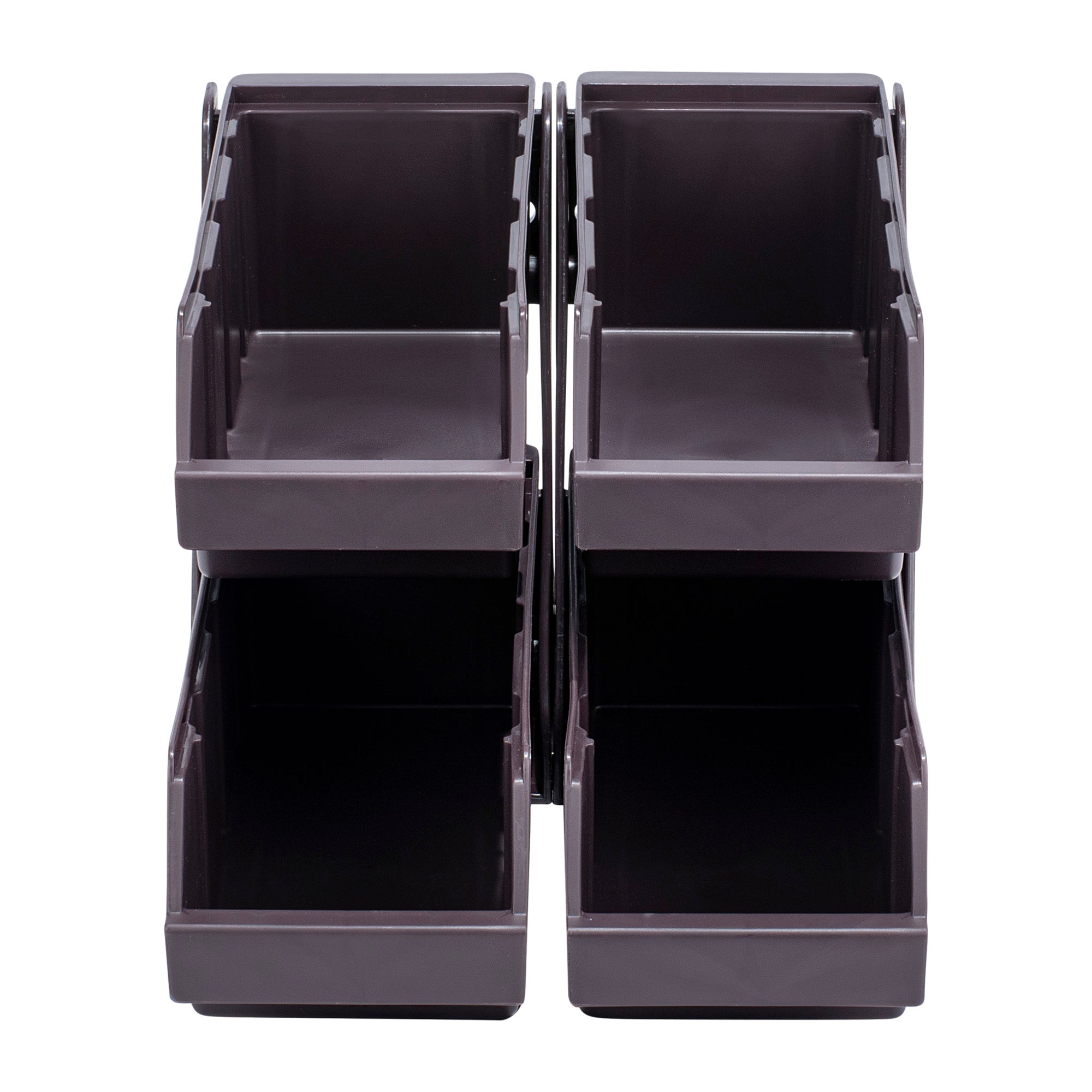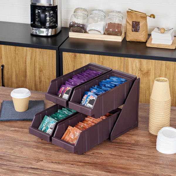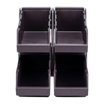 Revolutionize your foodservice setup with our Bundle: Met Lux 2 Brown 2-Tier Stands and 4 Condiment Bins and 4 Connector Clips, designed to streamline your operations with style and efficiency. This comprehensive bundle includes two durable brown plastic 2-tier stands, four versatile condiment bins, and four connector clips, providing everything you need for a customizable and organized workspace. The vertical design of the stands maximizes countertop space, making them ideal for self-serve beverage stations or take-out order preparation areas. Crafted with durability in mind, this stand offers unparalleled convenience and longevity in busy foodservice environments. The brown finish of this stand blends seamlessly with various decor, ensuring a stylish and professional look. The included connector clips allow for an easy combination of stands, creating a flexible and expandable system to meet your specific needs. The condiment bins provide ample storage for various toppings, sauces, or utensils, enhancing organization and efficiency. With dimensions of 7.68 inches in length by 5.59 inches in width by 9.09 inches in height for each stand, this bundle offers a compact yet highly functional solution for any kitchen or service area. Each order includes 2 brown 2-tier stands, 4 condiment bins, and 4 connector clips.