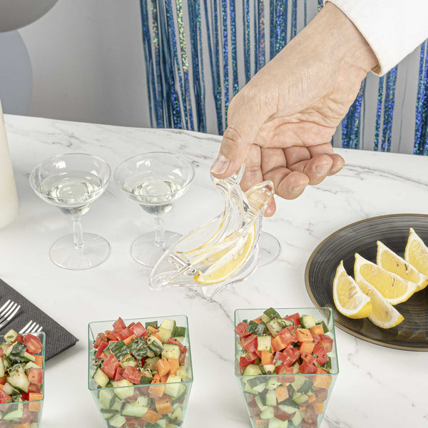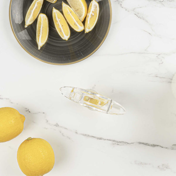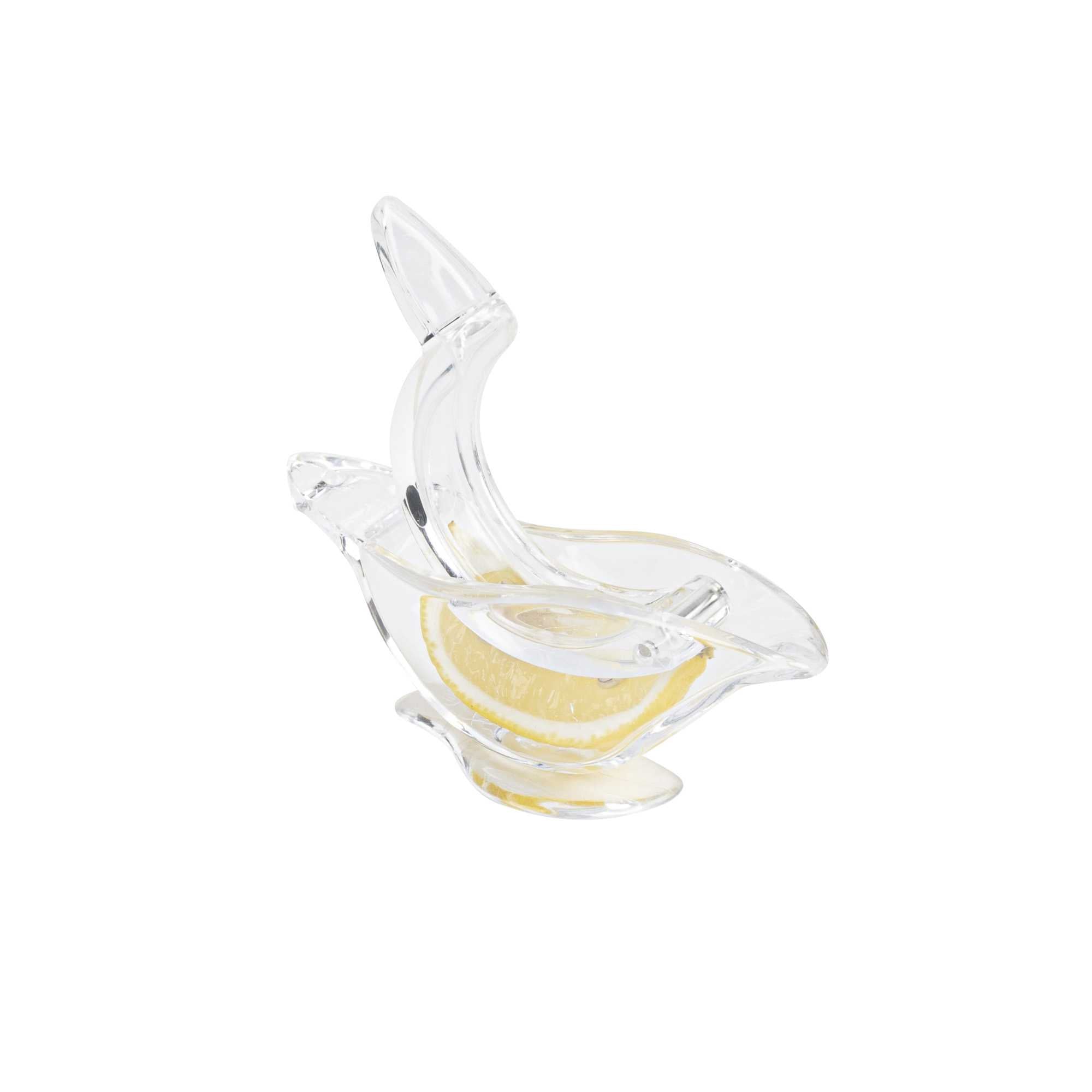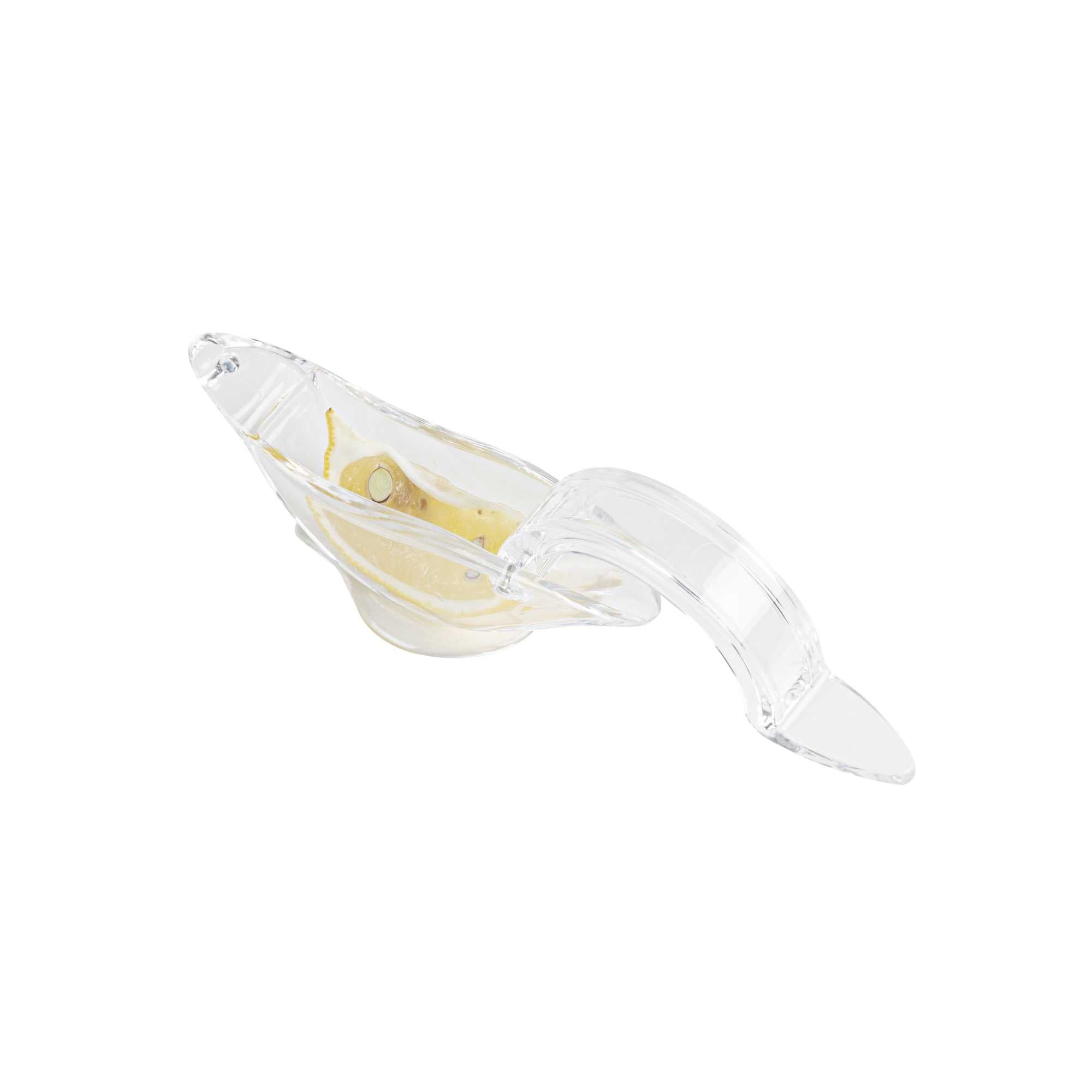 Efficiently flavor your dishes with freshly squeezed lemon juice with our Met Lux 2-ounce Clear Plastic Press Art Lemon and Lime Squeezer. This lemon wedge squeezer, with a sturdy construction, helps efficiently squeeze citrus. With a convenient handheld lever, this lemon squeezer requires only a simple press to extract juice. An elegant way to drizzle citrus, this free-standing lime squeezer allows you to freshly squeeze lemon wedges on demand. With a sturdy plastic construction, this lemon squeezer is built to withstand frequent use in busy commercial kitchens. For optimal stability, this lime squeezer features a wide base that prevents tipping. To comfortably squeeze, this handheld lemon juicer has an ergonomic handle that reduces strain. To capture every drop of juice, this citrus reamer has a 2 ounce capacity and measures 4.75 inches in length by 1.5 inches in width by 2 inches tall, fitting within cramped counter space. Sold in a 1 count box.