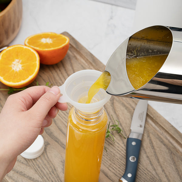 Expertly funnel liquids into jars or bottles using our Met Lux 2-ounce Silicone Funnel. A great addition to your bar or kitchen supplies, these silicone funnels feature ridges that are designed to collapse and fold down flat for easy storage after use. Made from high-quality silicone, these collapsible funnels are food-safe. To easily pour warm jellies or mixtures, these foldable funnels are conveniently heat-resistant. The narrow mouth of these silicone funnels is perfect for neatly transferring liquids or ingredients into all kinds of bottles. Designed with a small hanging hole, these collapsible funnels can be conveniently stored on hooks or inside drawers. Perfect for a hassle-free cleanup, these foldable funnels are dishwasher-safe. These silicone funnels hold up to 2 ounces and measure 2.7 inches in diameter by 2.5 inches in height when expanded. Sold in a 5 count box.