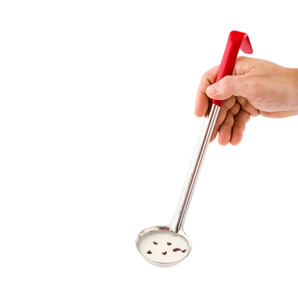 Optimize portion stability and refine recipe outcomes with our Met Lux 2-ounce Stainless Steel Serving Ladle. Fabricated from robust stainless steel, this serving ladle is built to withstand the pressures of your bustling commercial kitchen. This serving spoon features a color-coded handle in a bold red hue and embossed capacities, enabling hassle-free identification and consistent servings. The ergonomically designed handle of this soup spoon ensures easy and comfortable handling for streamlined operations. With a 2-ounce capacity, this stainless steel spoon is ideal for accurately apportioning vegetables, salads, soups, and more. This sauce spoon is dishwasher-safe, providing for simple post-use cleanup. Measuring 11.75 inches long, this stainless steel ladle can contain up to 2 ounces. Sold in a 1 count box.