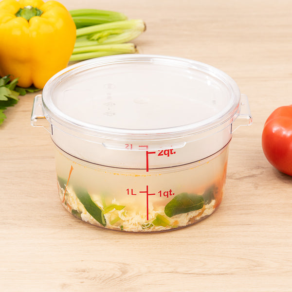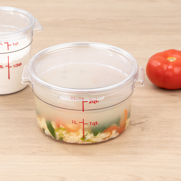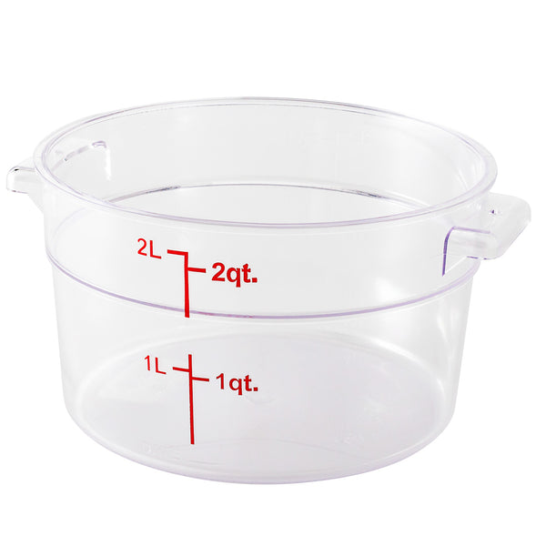 Easily store ingredients using our Met Lux 2-quart Round Clear Plastic Food Storage Container. This food storage container features red volume markers printed on each container that expertly measures up to 2 quarts. Crafted with premium plastic, this plastic food container is crack-resistant and scratch-resistant to withstand regular use in your commercial kitchen. Pair this food storage container with our matching lid for an airtight seal (SKU: RWT0853-1). This clear plastic food container includes built-in handles that provide a comfortable grip when transporting sauces or prepped meals around your establishment. Great for storing ingredients in commercial kitchens, this plastic food container is stain-resistant and odor-resistant. This food storage container can endure temperatures from -40F to 210F and is conveniently freezer-safe. This clear food container provides clear visibility of your foods and has a wide base to store large amounts of produce. For a quick clean up after use, this food storage container is dishwasher-safe. Measuring 7 inches in diameter by 4.25 inches in height, this 2-quart food container is shipped in a 10 count box. Food storage lid is available and sold separately.