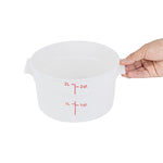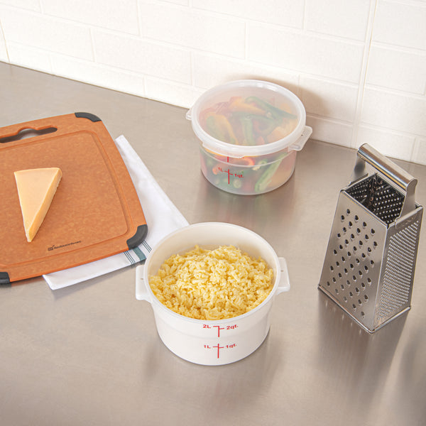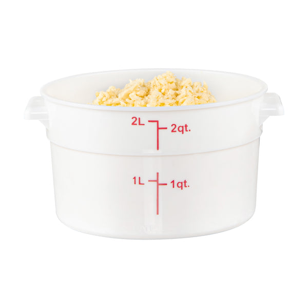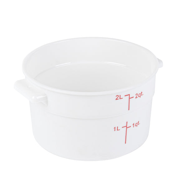 Ensure optimal food preservation with our Met Lux 2-quart Round White Plastic Food Storage Container. This food storage container is crafted from durable pp plastic, designed to withstand the rigors of daily use in a busy kitchen. Equip your culinary space with this plastic food storage container, featuring red volume markers for easy measuring and control of your ingredient. Take advantage of the stable handle on this round plastic food container, ensuring secure and comfortable transportation from the pantry to the countertop. With the ability to endure temperatures ranging from -40 to 160 degrees Fahrenheit, this food container is both freezable and dishwashable for maximum convenience. Pair this round plastic container with our available lid (SKU: RWT1572C-1), creating a tight seal to maintain freshness and prevent spills. Boasting a 2-quart capacity, this white food container is ideal for storing large batch of food, while its dimensions of 7.25 inches in diameter by 4.25 inches in height allow for efficient space utilization in your storage area. Sold in a 1 count box. Lid is available and sold separately.