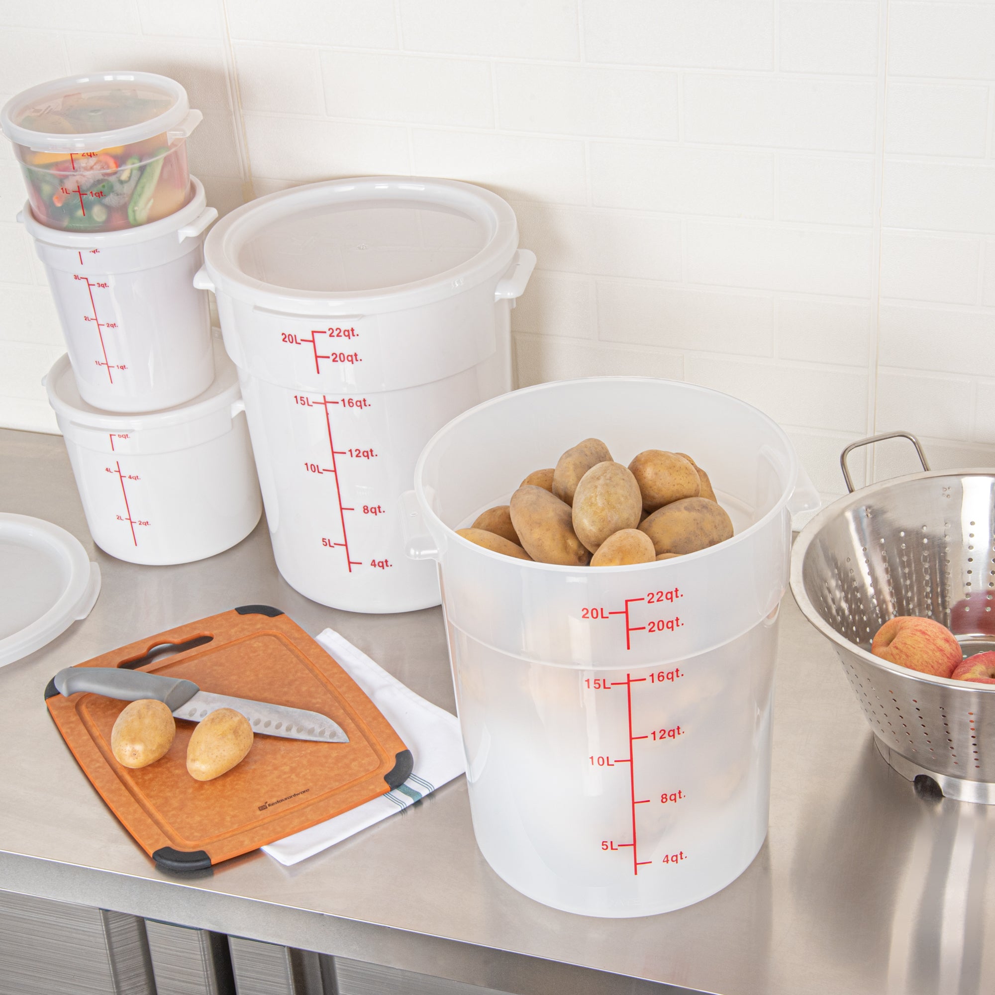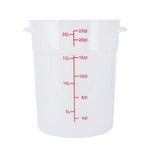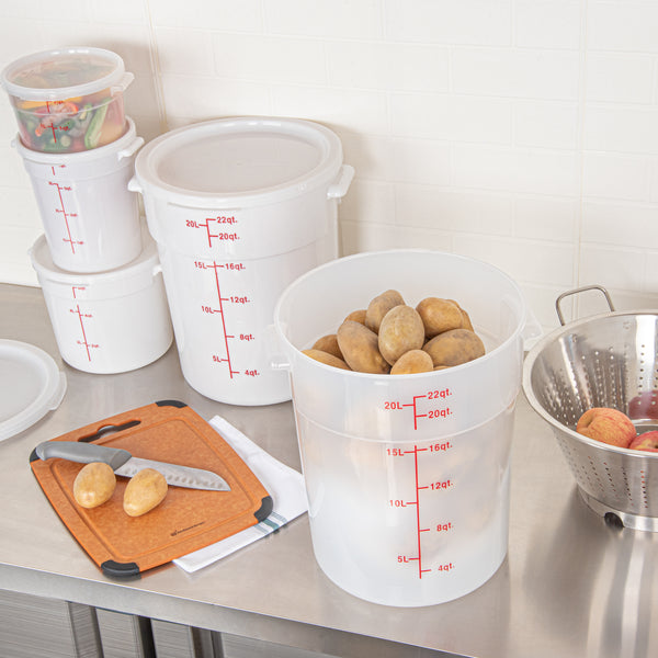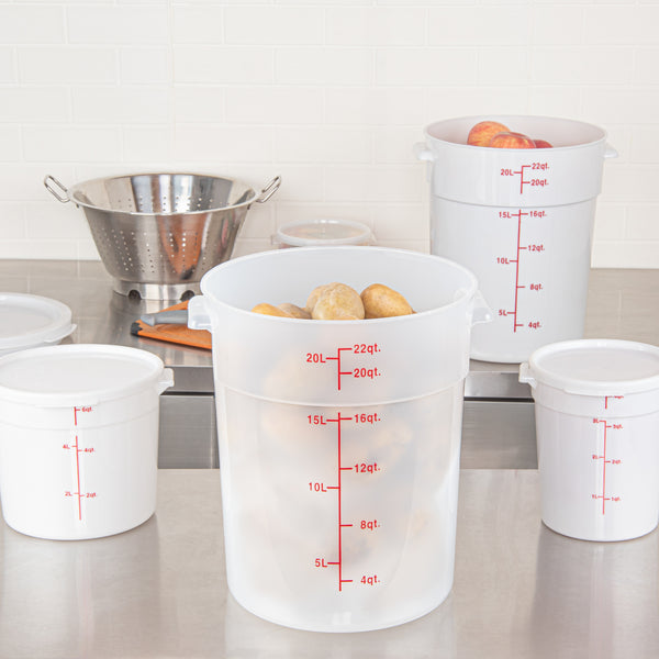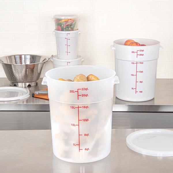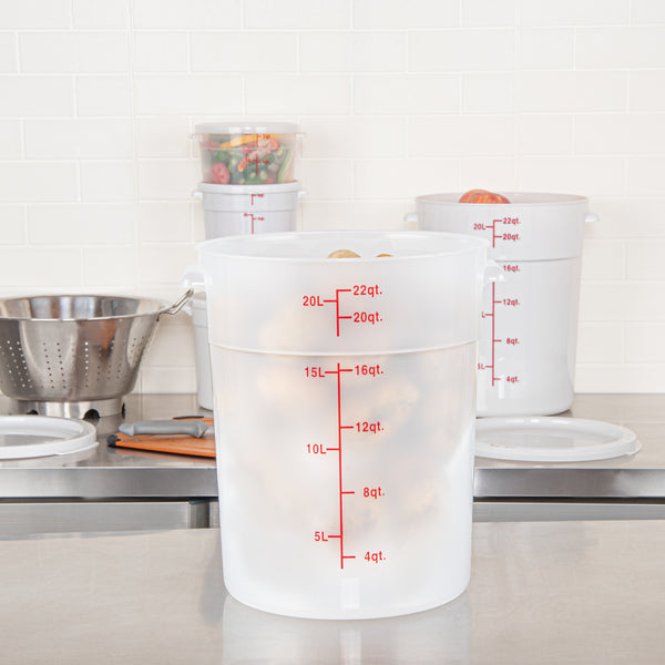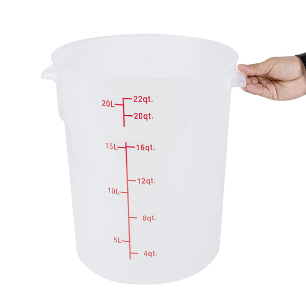 Upgrade your kitchen storage solutions with our Met Lux 22-quart Round Translucent Plastic Food Storage Containers. These food storage containers are crafted from durable PP plastic, ensuring long-lasting use in any professional kitchen. Featuring red volume markers, these plastic food storage containers make it easy to measure and portion ingredients accurately. With stable handles, these round plastic food containers provide a secure grip for easy transportation. Designed to be dishwashable and freezable, these storage containers can withstand temperatures ranging from -40 to 160 degrees Fahrenheit, making them versatile for a variety of food items. Pair these translucent food containers with compatible lids (SKU: RWT1579C) to keep your ingredients fresh and well-protected. Boasting a generous 22-quart capacity and measuring 12.25 inches in diameter by 15 inches in height, these round plastic containers are perfect for storing large batches of food or ingredients. Sold in a 10 count box. Lids are available and sold separately.