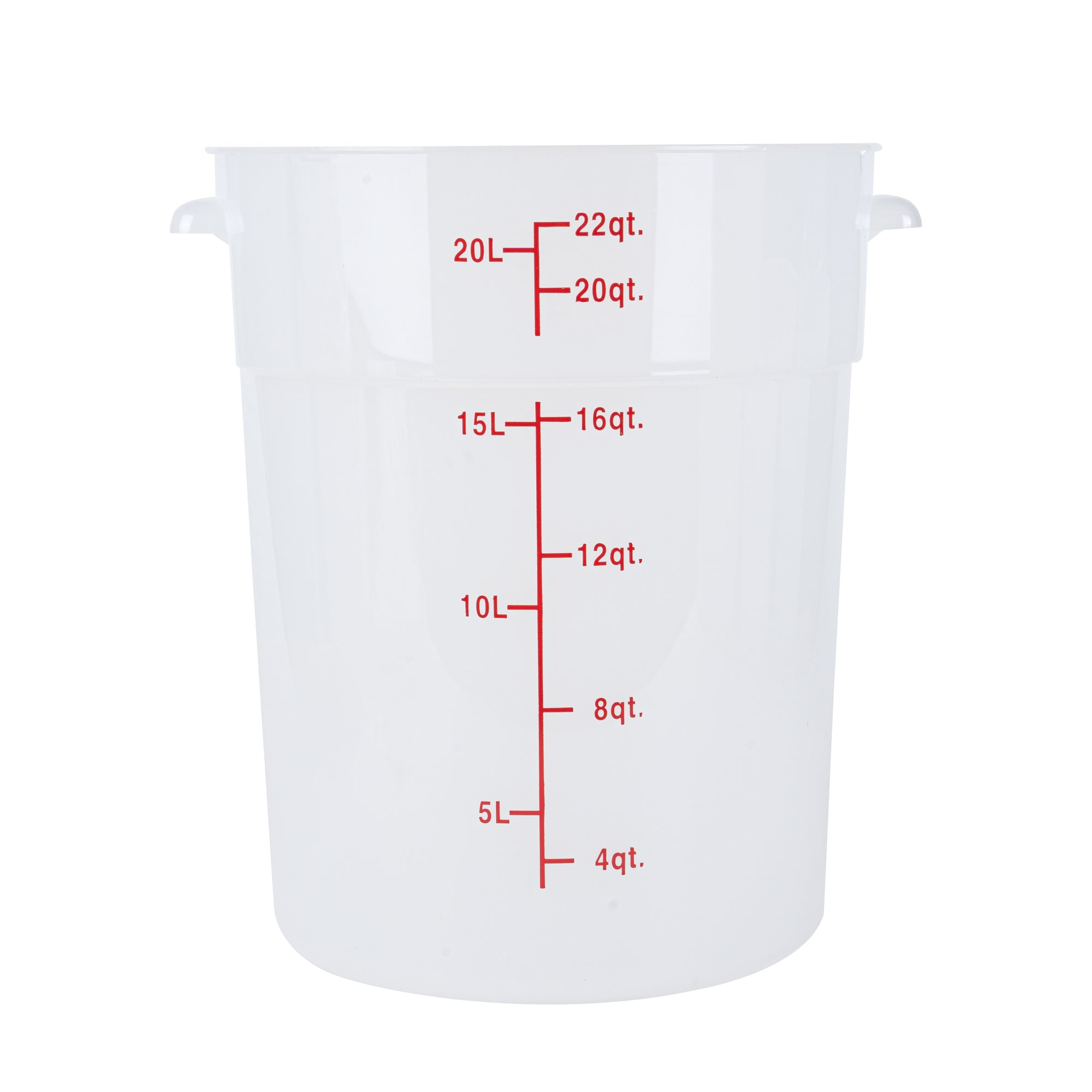 Upgrade your kitchen storage solutions with our Met Lux 22-quart Round Translucent Plastic Food Storage Containers. These food storage containers are crafted from durable PP plastic, ensuring long-lasting use in any professional kitchen. Featuring red volume markers, these plastic food storage containers make it easy to measure and portion ingredients accurately. With stable handles, these round plastic food containers provide a secure grip for easy transportation. Designed to be dishwashable and freezable, these storage containers can withstand temperatures ranging from -40 to 160 degrees Fahrenheit, making them versatile for a variety of food items. Pair these translucent food containers with compatible lids (SKU: RWT1579C) to keep your ingredients fresh and well-protected. Boasting a generous 22-quart capacity and measuring 12.25 inches in diameter by 15 inches in height, these round plastic containers are perfect for storing large batches of food or ingredients. Sold in a 10 count box. Lids are available and sold separately.