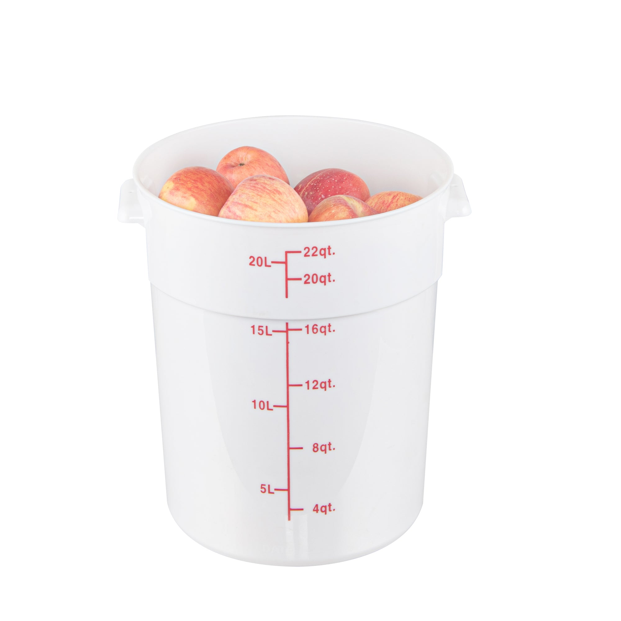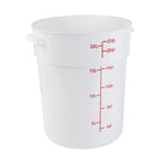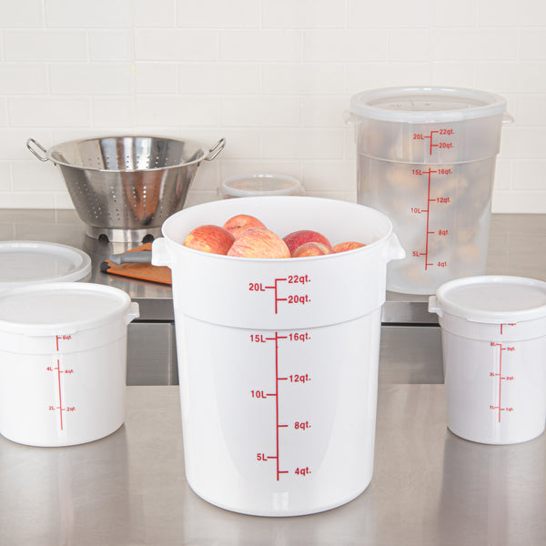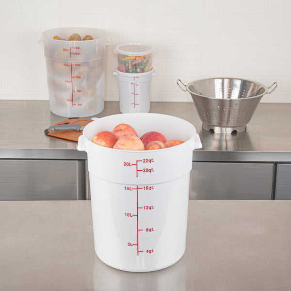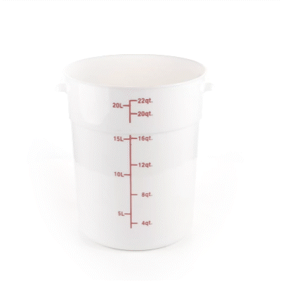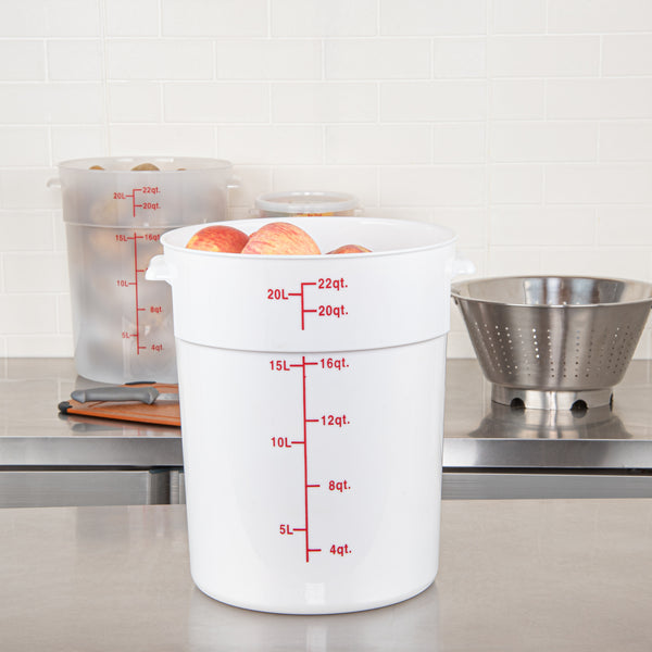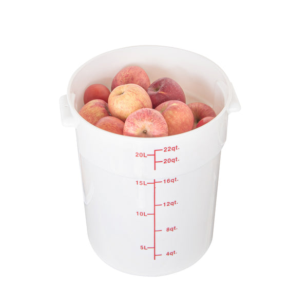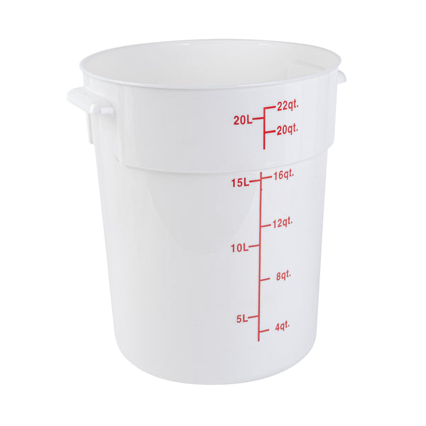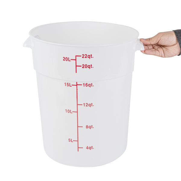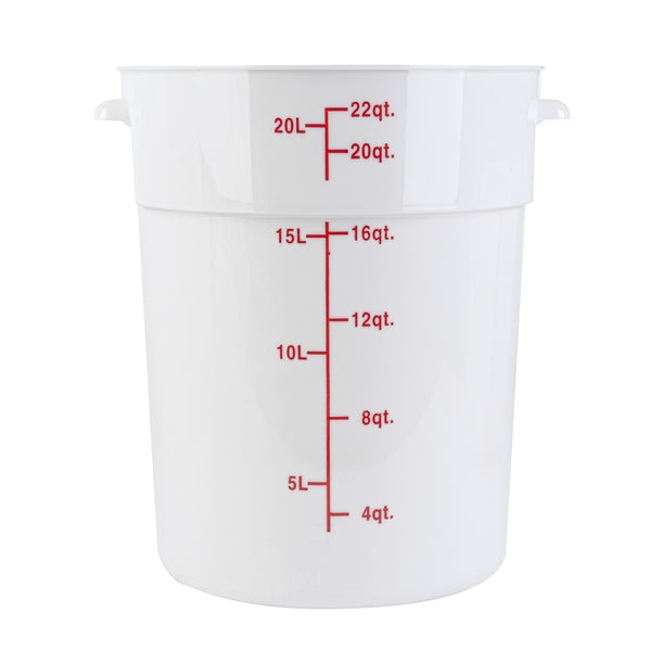 Organize and store your food items efficiently with our Met Lux 22-quart Round White Plastic Food Storage Container. Durably designed, this food storage container is crafted from robust PP plastic, ensuring prolonged use and withstanding wear and tear. The red graduations on this plastic food storage container ensure your ingredients are perfectly portioned every time. Easily lift and transport this food container with its stable handle, designed for optimal user comfort and convenience. This round plastic food container is dishwashable, making clean-up quick and easy after use. Plus, this storage container can be stored in the freezer and can withstand temperatures ranging from -40 to 160 degrees Fahrenheit, making it perfect for a variety of food items. The white design of this food container allows you to easily identify content, enhancing kitchen efficiency. This round plastic container has a generous capacity of 22 quarts, perfect for storing large quantities of food. Measuring 12.25 inches in diameter by 15 inches in height, this plastic food container optimizes storage space without compromising on content volume. Pair this container with a lid (SKU: RWT1579C-1) that is available to ensure food stays fresh. Sold in a 1 count box. Lid is available and sold separately.