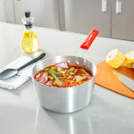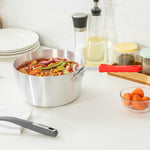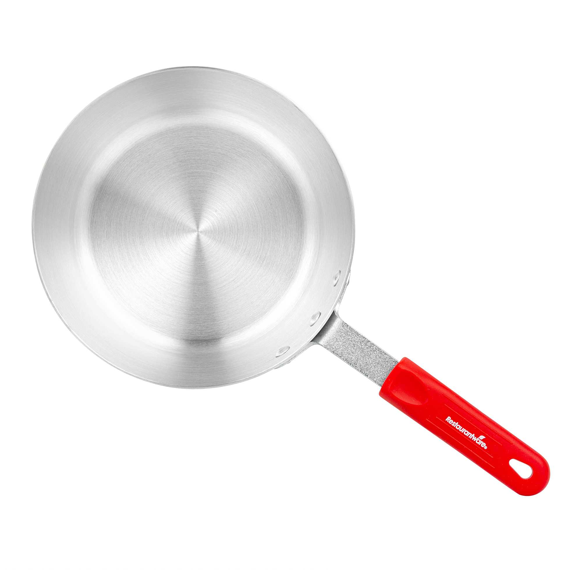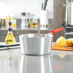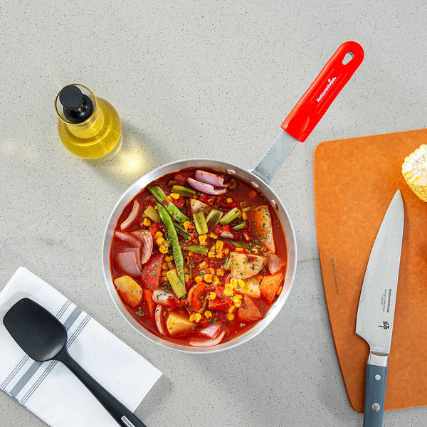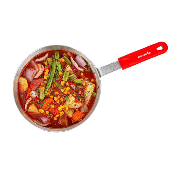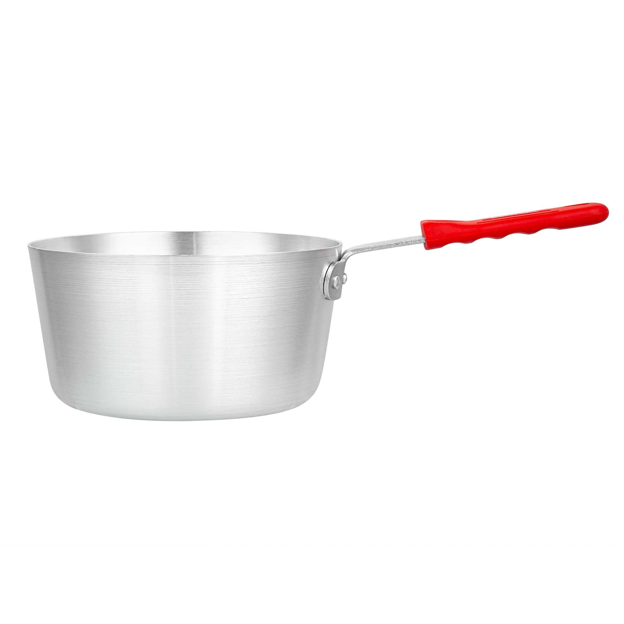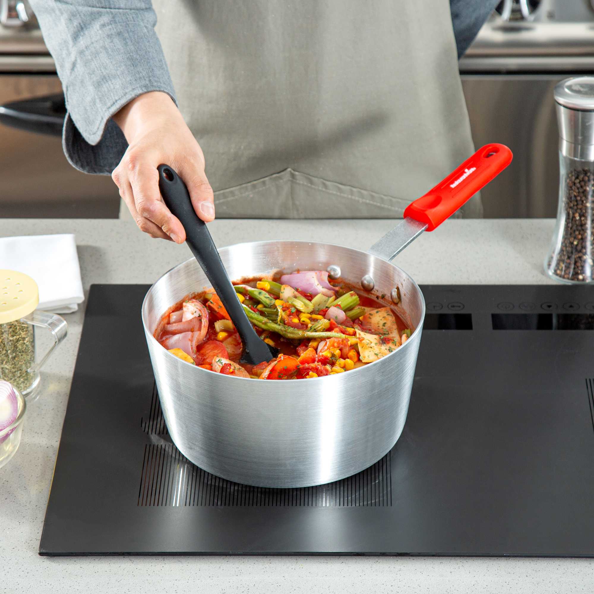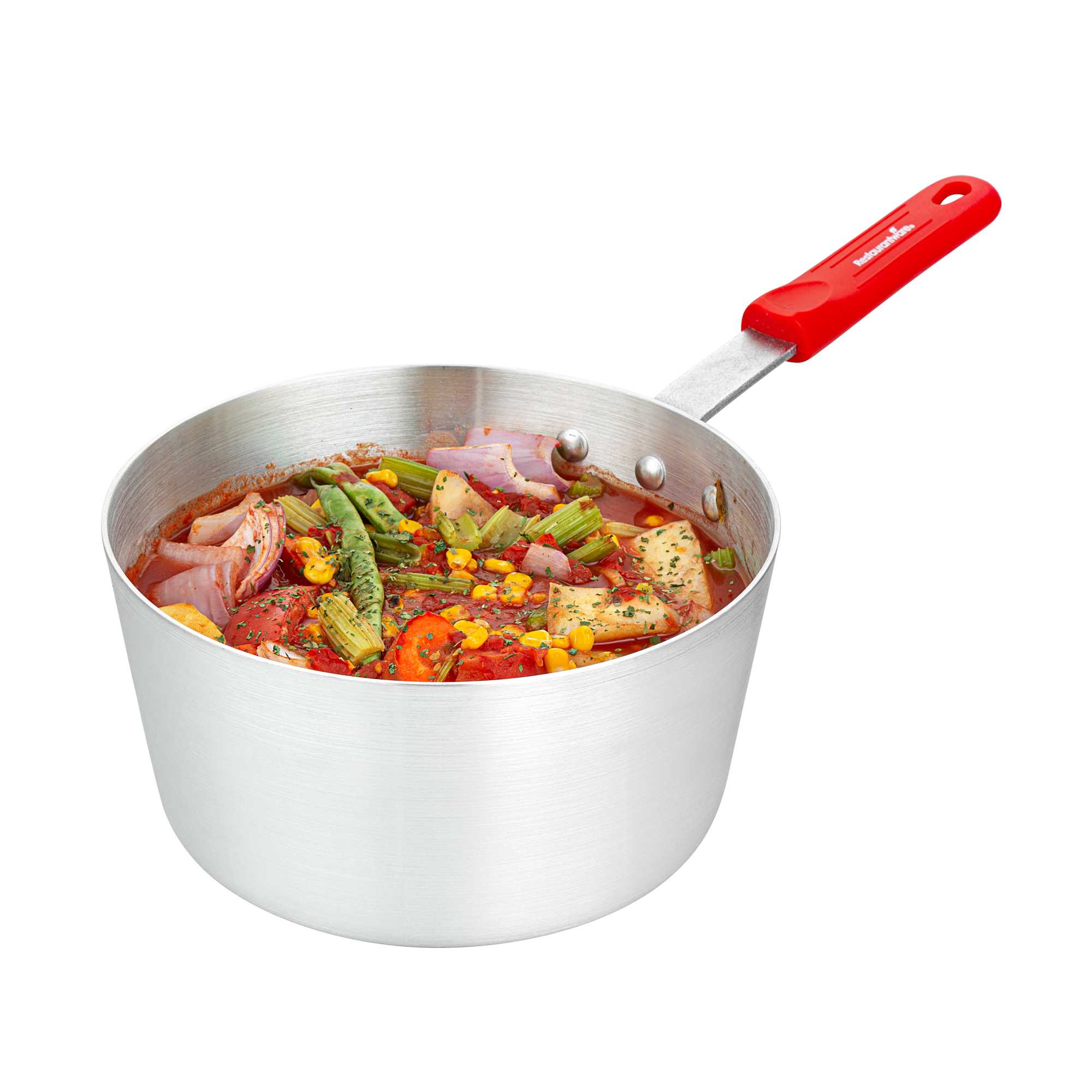 Enhance your kitchen's efficiency with adaptable cookware. The Met Lux Silver Aluminum Sauce Pan is expertly designed to streamline cooking processes, making it an essential 4.5 qt sauce pan for both commercial and home kitchens. Its tapered design promotes efficient stirring and even cooking, ensuring precise control over sauces and boiling liquids. Constructed from 3003 series, 2.5-millimeter thick aluminum, this aluminum cooking pot offers excellent heat distribution, preventing hot spots and guaranteeing consistent results. The vibrant red silicone handle ensures a cool, safe grip, reducing the risk of burns during busy shifts. This oven safe saucepan can withstand temperatures up to 450F, allowing for versatile culinary applications, from stovetop to oven. With a sleek, professional appearance and a length of 16.65 inches, it perfectly complements any kitchen setup. Elevate your cooking experience with reliable, professional cookware. Sold in a 1 count box.