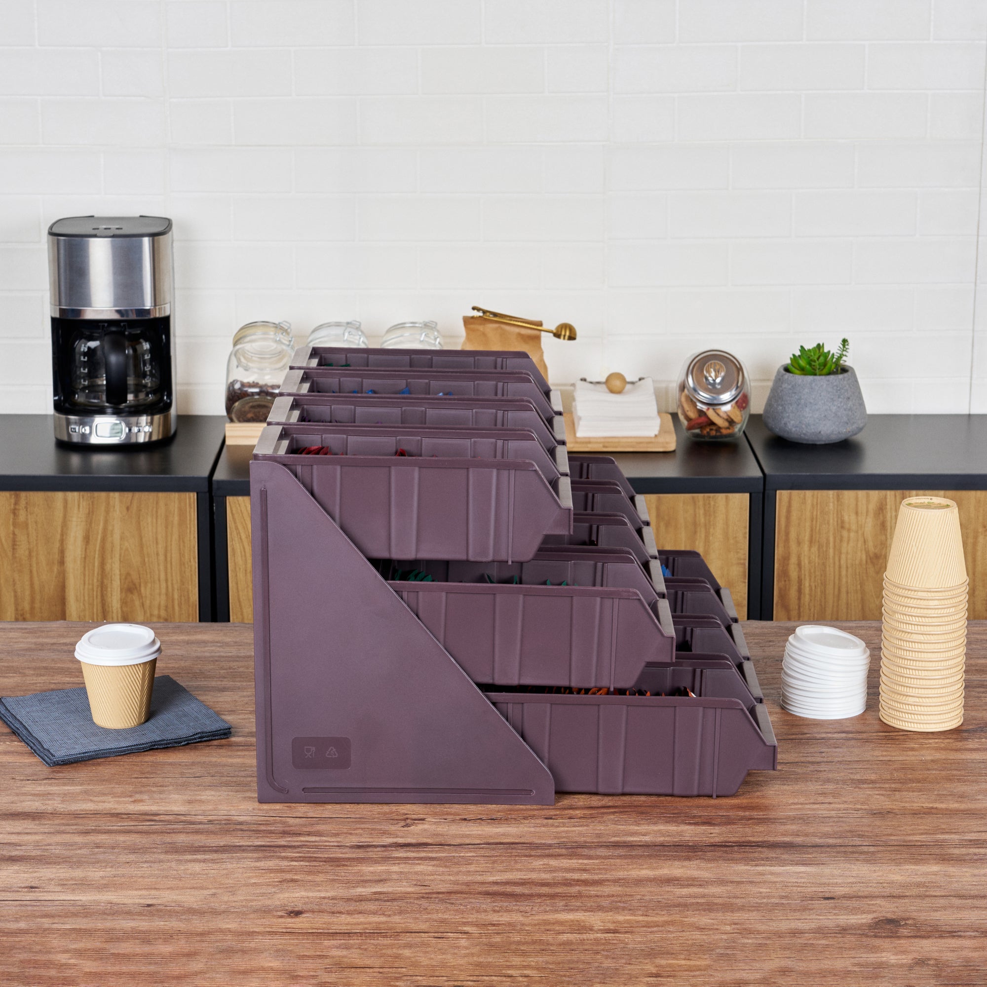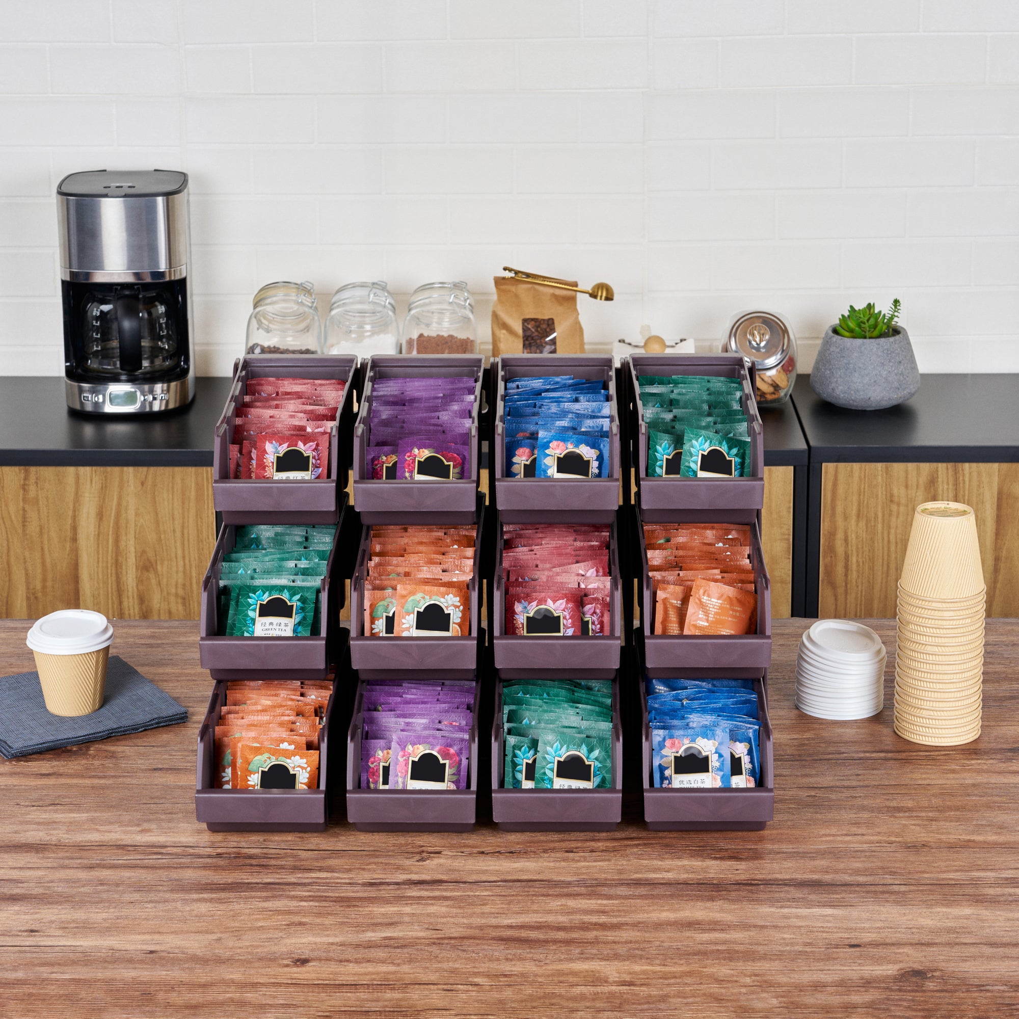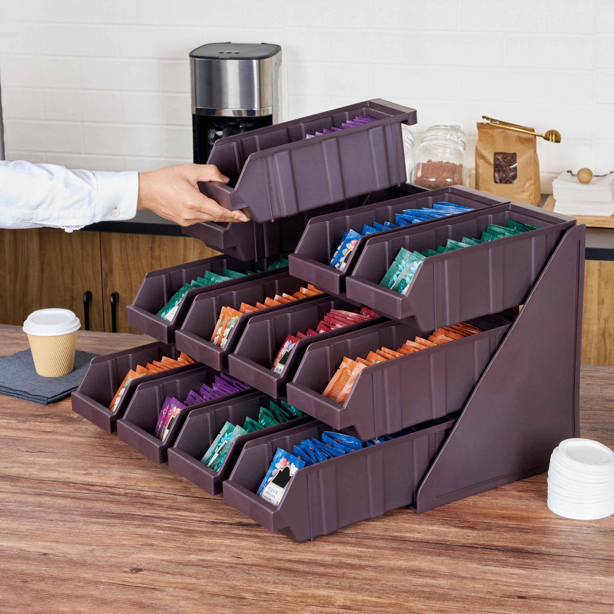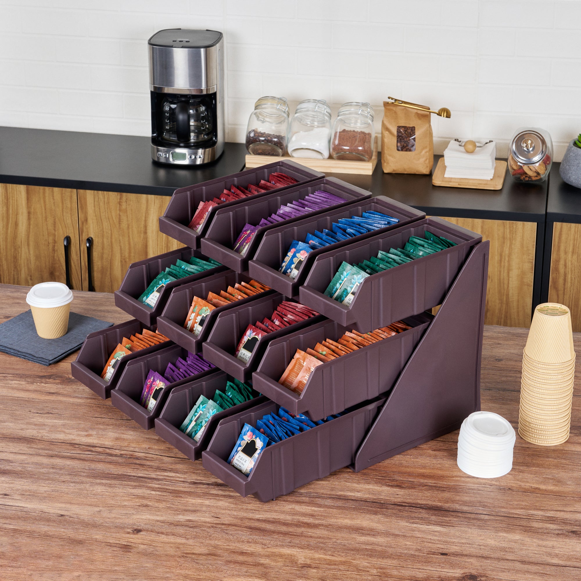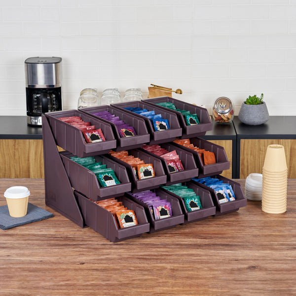 Revolutionize your foodservice setup with our Bundle: Met Lux 4 Brown 3-Tier Stands and 12 Condiment Bins and 12 Connector Clips, designed to streamline operations with style and efficiency. This bundle includes four durable brown plastic 3-tier stands, twelve condiment bins, and twelve connector clips, providing a complete solution for self-serve beverage stations or take-out order preparation areas. The vertical design of these stands maximizes counter space, allowing for efficient use of your workspace. Easily customize your configuration by connecting multiple stands using the included clips, creating a seamless and organized setup. The stylish brown finish of the stands blends seamlessly with various decor, enhancing the aesthetic appeal of your service area. Crafted for durability and functionality, these stands ensure a long-lasting and practical addition to your foodservice operations. The versatile design accommodates a wide range of condiments and utensils, making it ideal for both beverage stations and food preparation areas. Each stand measures 11.57 inches in length by 5.59 inches in width by 13.78 inches in height, providing ample space while maintaining a compact footprint. Each order includes 4 brown 3-tier stands, 12 condiment bins, and 12 connector clips.