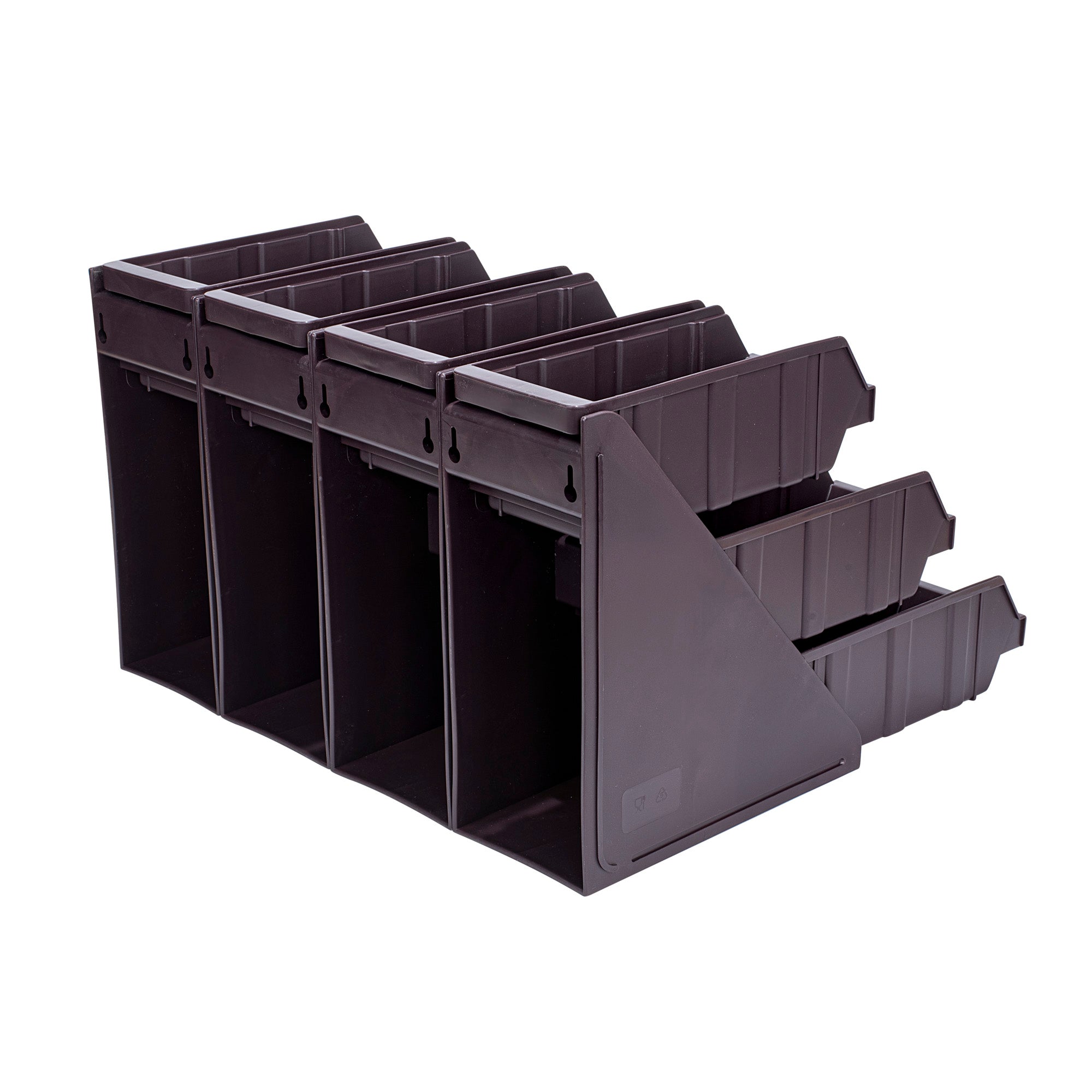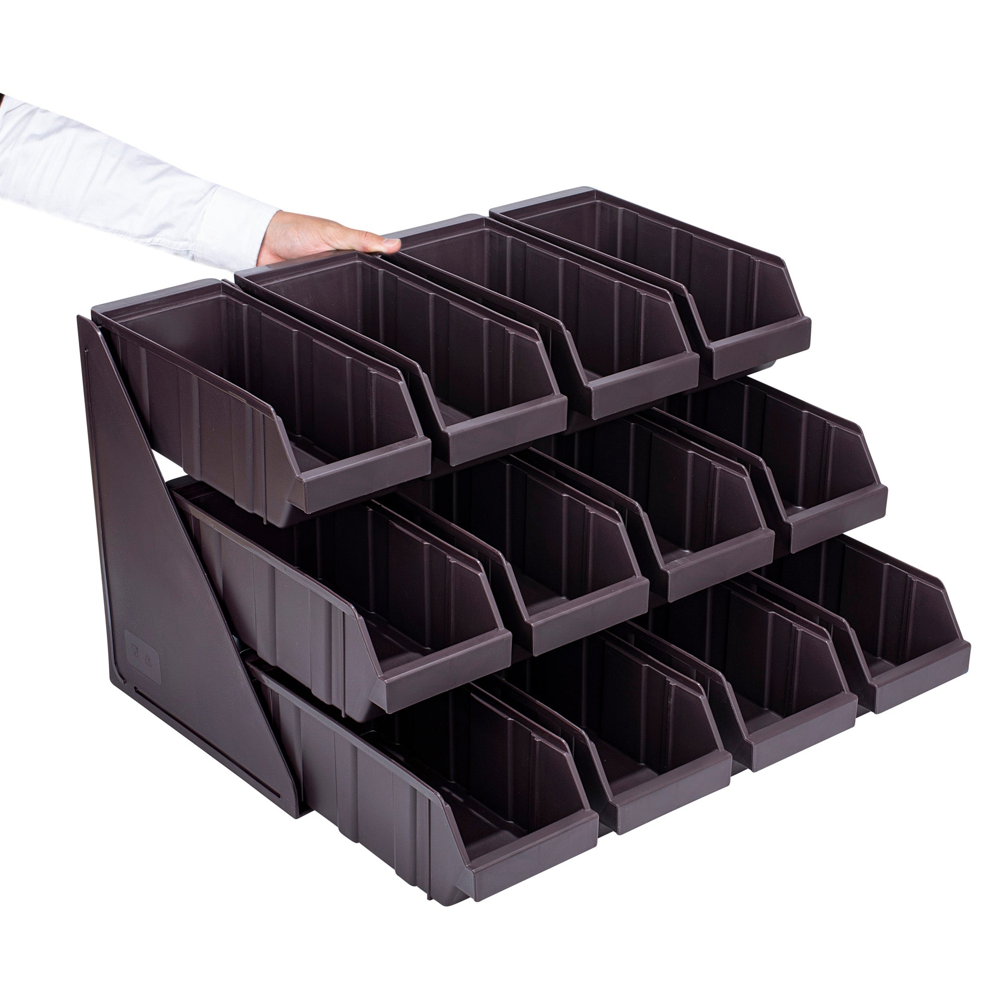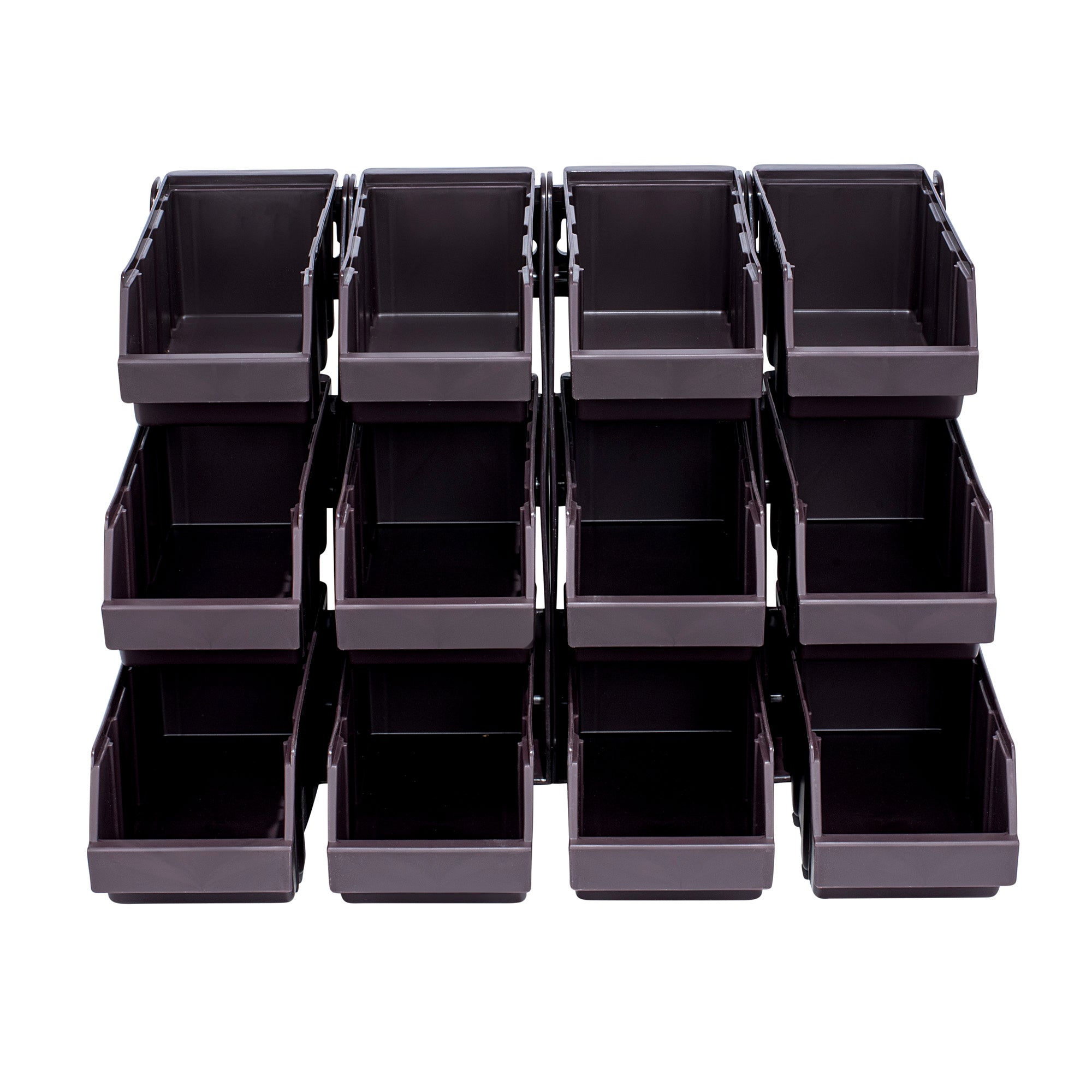 4 BROWN 3-TIER STANDS AND 12 CONDIMENT BINS AND 12 CONNECTOR CLIPS