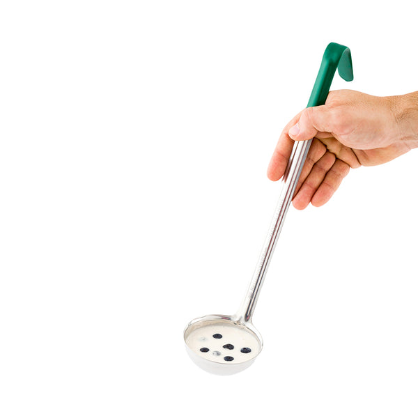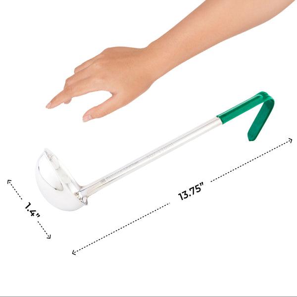 Magnify serving consistency and elevate culinary precision with our Met Lux 4-ounce Stainless Steel Serving Ladle. Crafted with durable stainless steel, this serving ladle is engineered to endure high-capacity usage in your commercial kitchen settings. This serving spoon sports a vivid green handle with engraved capacities for easy recognition, assuring consistent serving sizes for your profit enhancement. The ergonomic handle of this sauce spoon makes it comfortable and efficient to use. With a 4-ounce capacity, this soup spoon is handy for portioning side dishes, salads, soups, and more accurately. Designed to be dishwasher-safe, this stainless steel spoon makes post-service cleanup is made easy. This soup ladle measures 13.75 inches and contains up to 4 ounces. Shipped in a 1 count box.