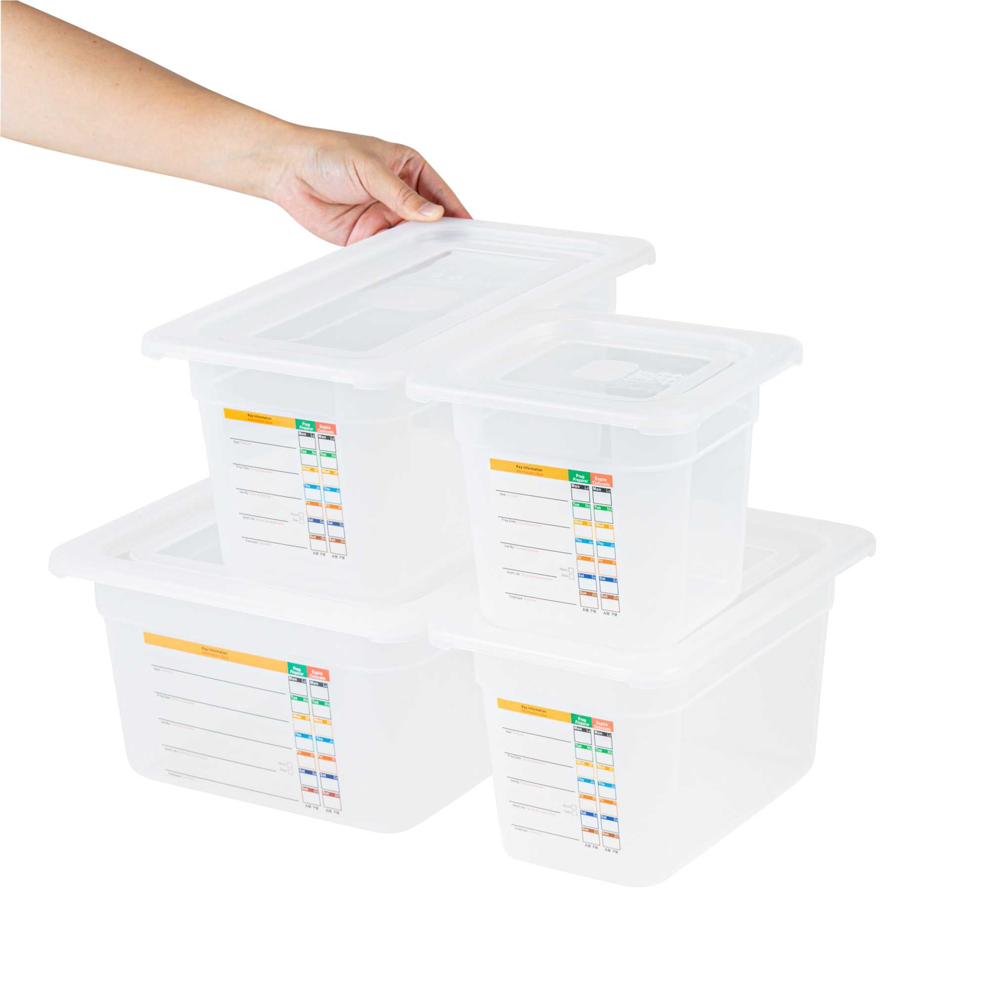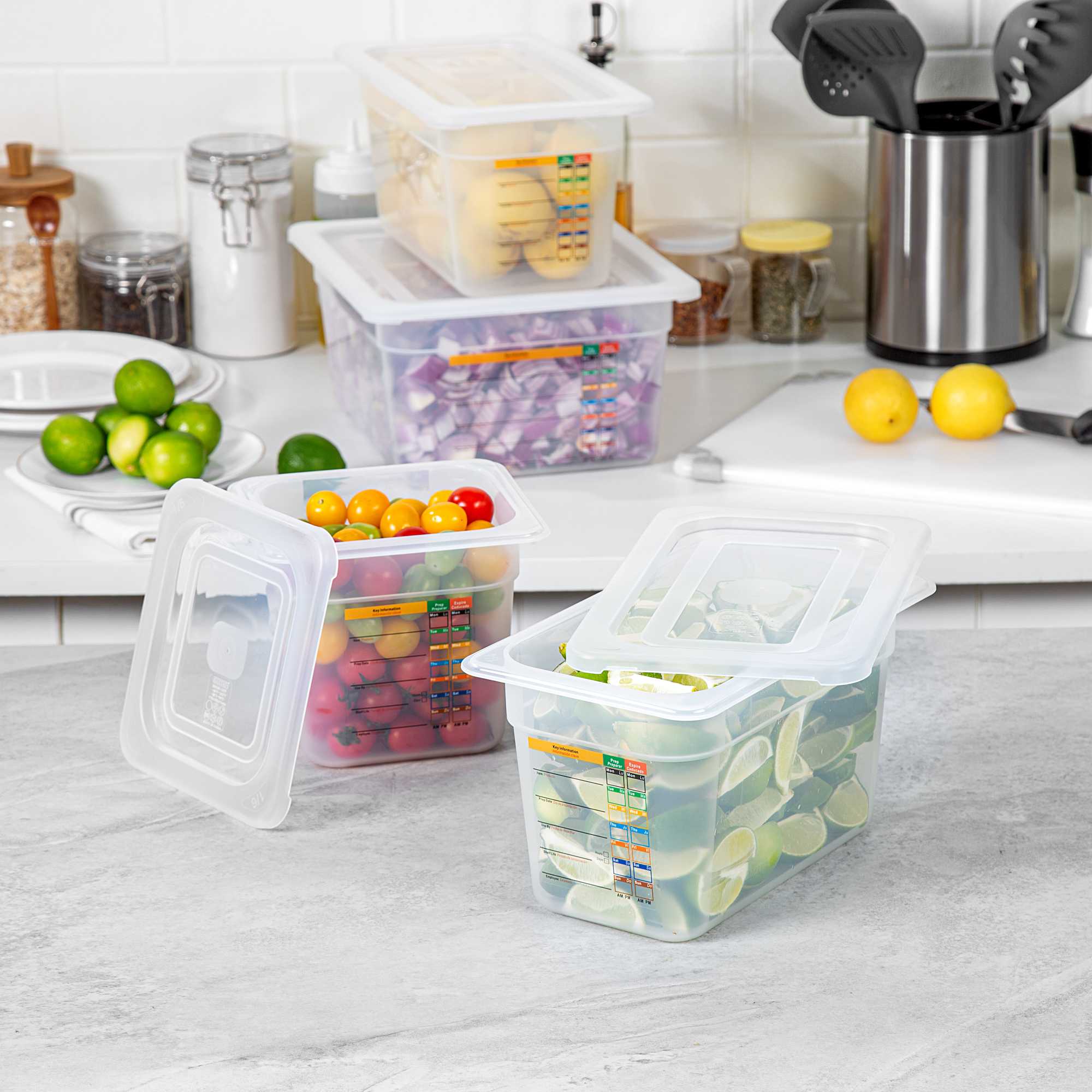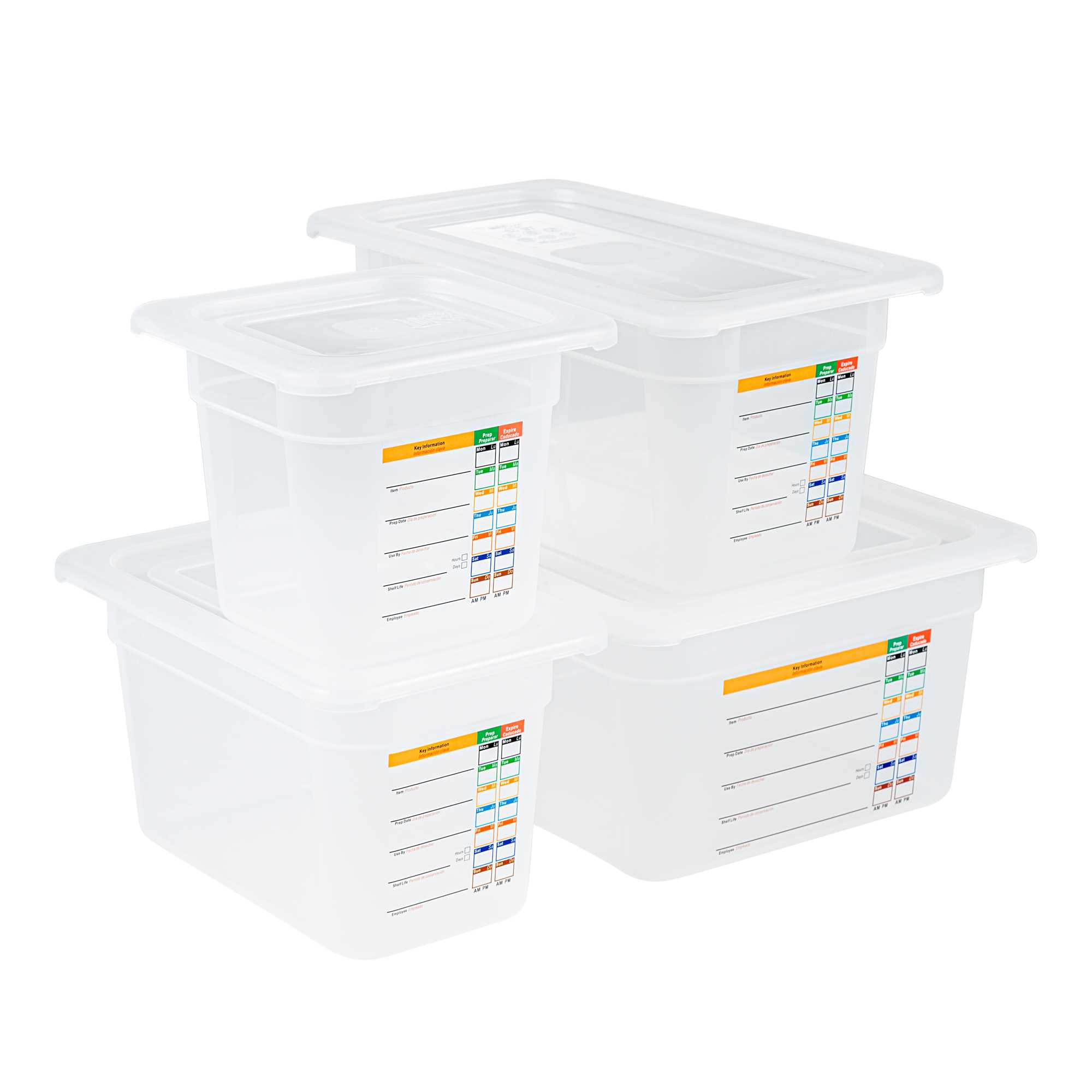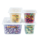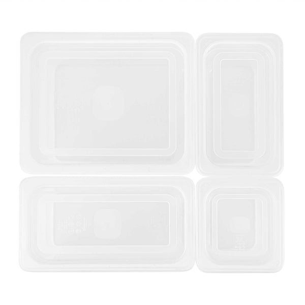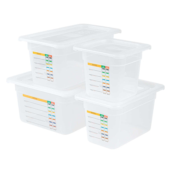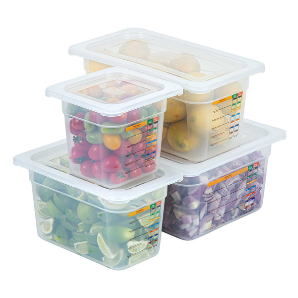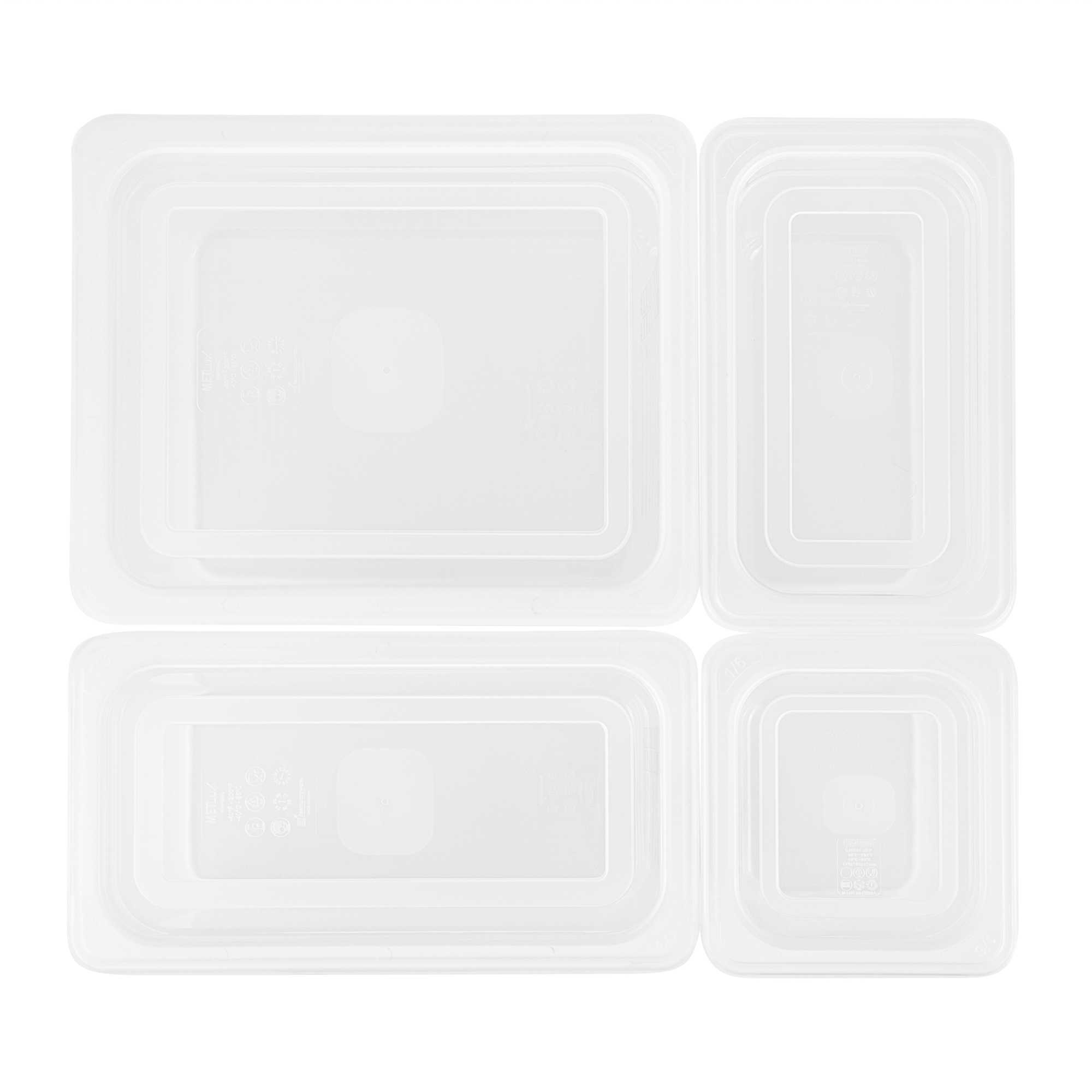 Maximize kitchen efficiency with versatile food storage solutions. Met Lux Airtight Seal Plastic Storage Containers offer a stackable design that optimizes storage space, reducing clutter in busy kitchens. This set contains a half size container, a 1/3 size container, a 1/4 size container and a 1/6 size container along with compatible lids. These airtight storage containers feature an airtight lid that ensures better food preservation and protection, crucial for maintaining ingredient freshness. Constructed from durable plastic, they guarantee safe food storage, giving chefs peace of mind. With a wide temperature range from -40 to 200 degrees Fahrenheit, these microwave-safe food containers are suitable for both hot and cold items, enhancing their versatility in foodservice operations. Their translucent design allows for easy content identification, while integrated traceability labels facilitate proper record keeping. Enhance your kitchen's organization with these indispensable plastic storage containers. Each order includes 1 Met Lux Airtight Seal Plastic Storage Container.