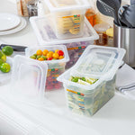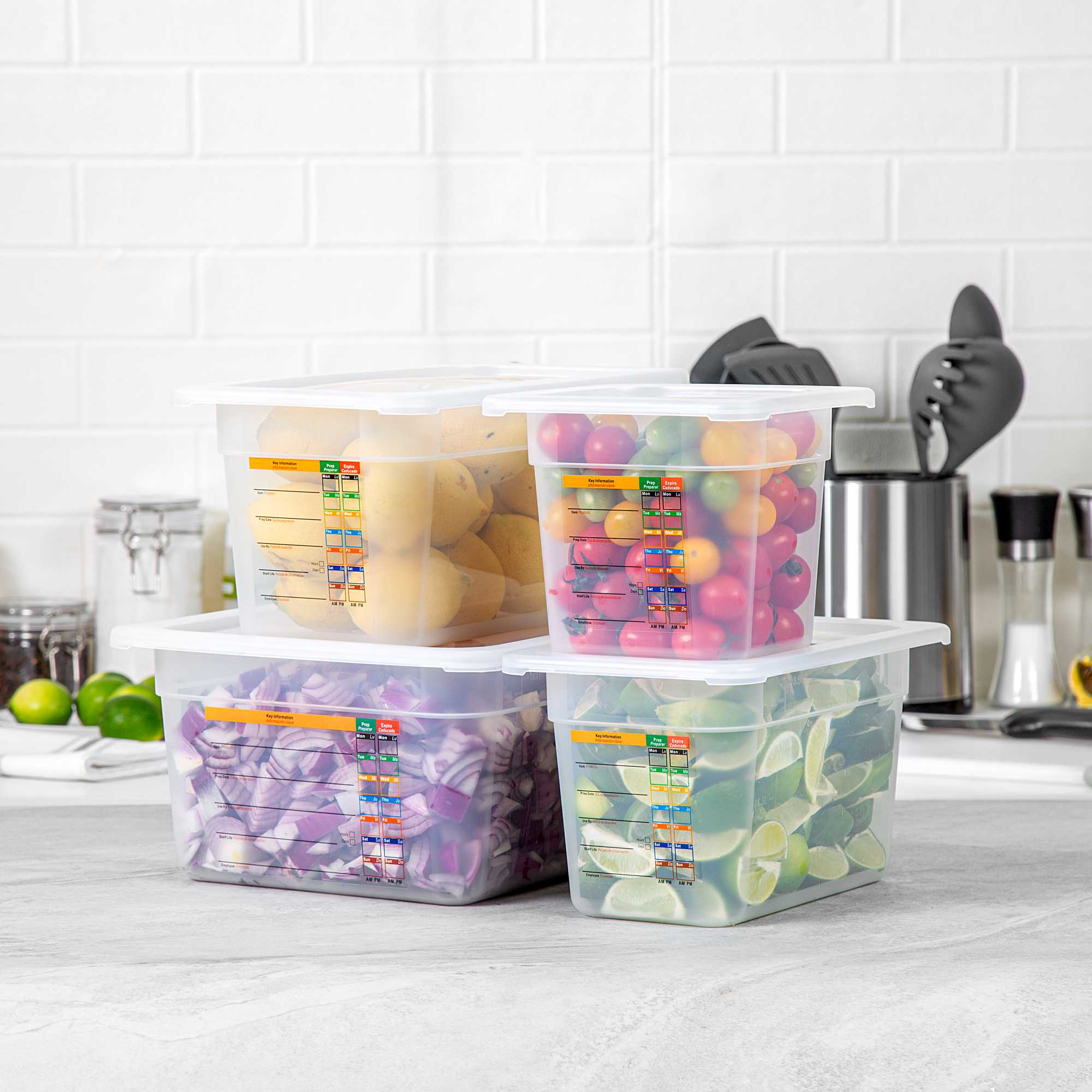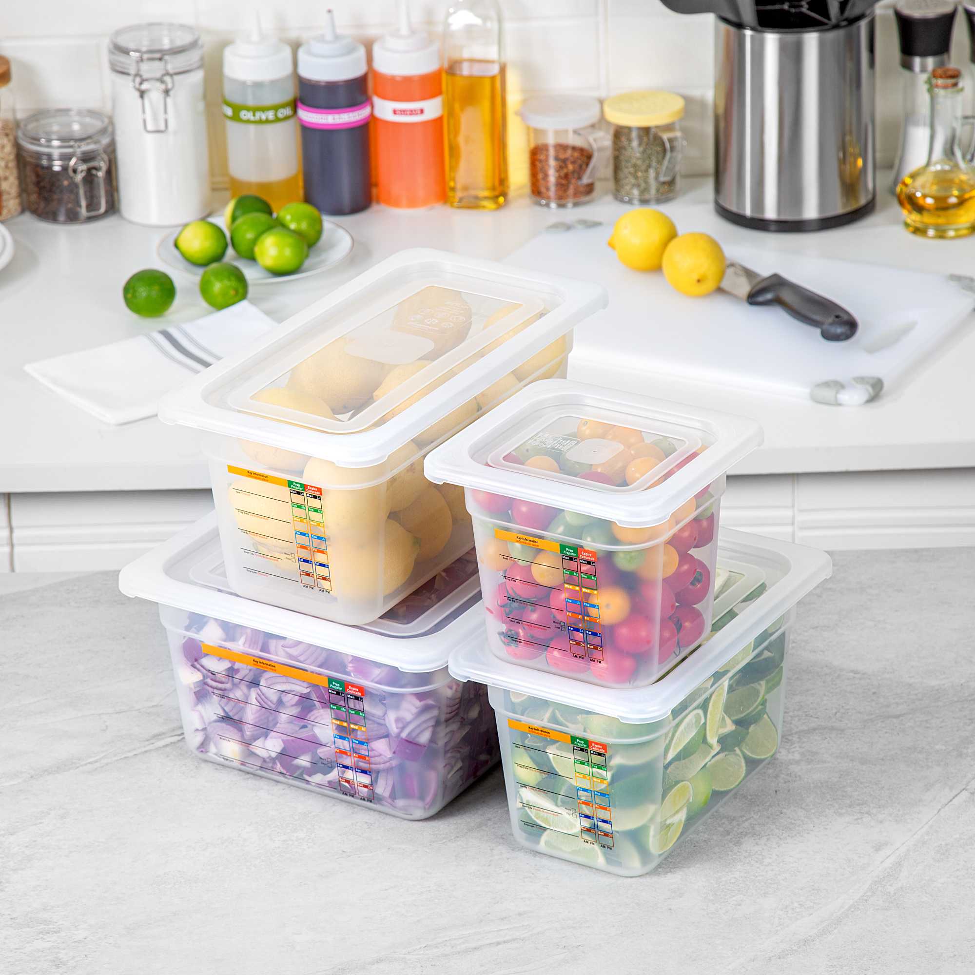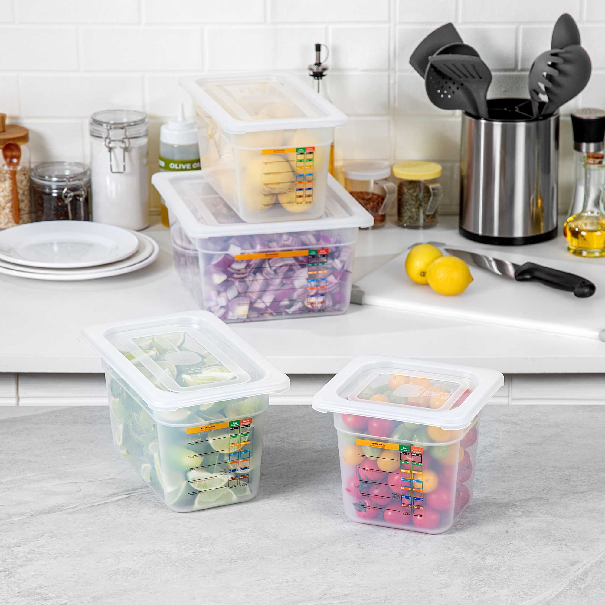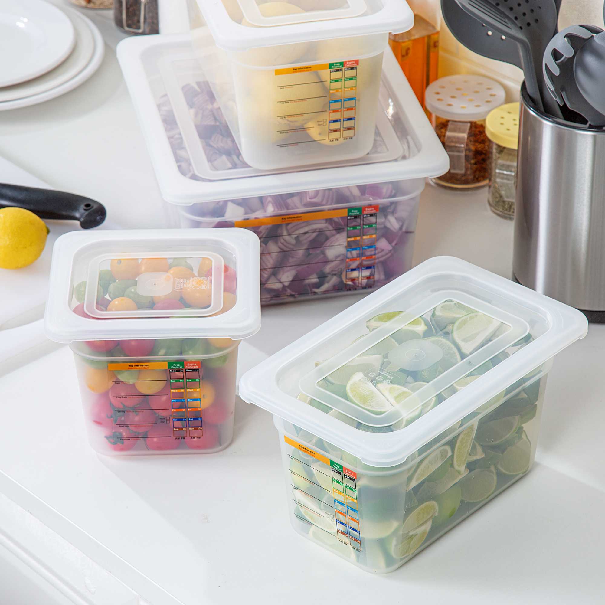 Maximize kitchen efficiency with versatile food storage solutions. Met Lux Airtight Seal Plastic Storage Containers offer a stackable design that optimizes storage space, reducing clutter in busy kitchens. This set contains a half size container, a 1/3 size container, a 1/4 size container and a 1/6 size container along with compatible lids. These airtight storage containers feature an airtight lid that ensures better food preservation and protection, crucial for maintaining ingredient freshness. Constructed from durable plastic, they guarantee safe food storage, giving chefs peace of mind. With a wide temperature range from -40 to 200 degrees Fahrenheit, these microwave-safe food containers are suitable for both hot and cold items, enhancing their versatility in foodservice operations. Their translucent design allows for easy content identification, while integrated traceability labels facilitate proper record keeping. Enhance your kitchen's organization with these indispensable plastic storage containers. Each order includes 1 Met Lux Airtight Seal Plastic Storage Container.