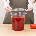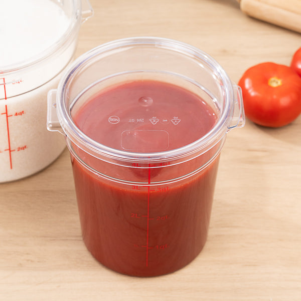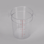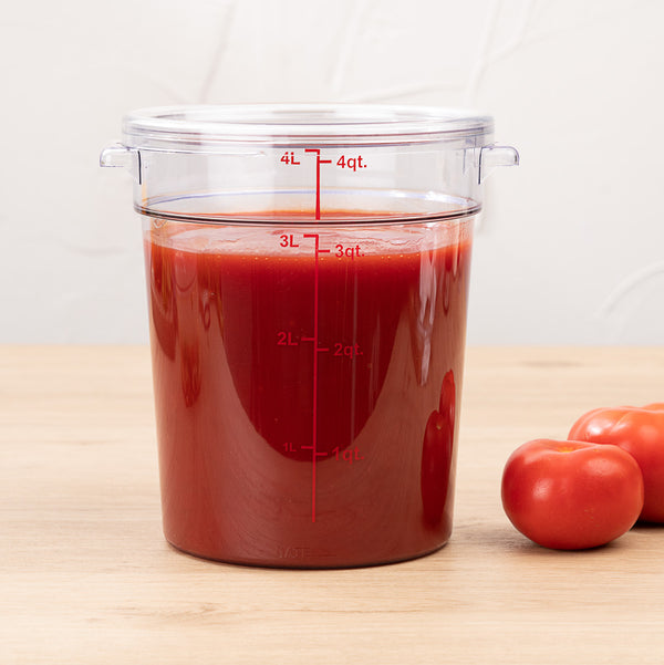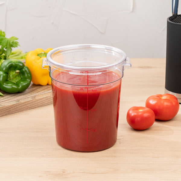 Store prepared sauces and raw ingredients using our Met Lux 4-quart Round Clear Plastic Food Storage Container. Featuring bright red volume markers, this food container accurately measures up to 4 liters and 4 quarts of your foods so you can easily see the amount of produce being stored. Made from high-quality plastic, this round food container is freezer-safe and perfect for storing hot or cold foods. Designed to withstand frequent use, this 4-quart container is crack-resistant and stain-resistant. Perfect for use in commercial kitchens or food preparation areas, this food container is odor-resistant. Pair this food container with our coordinating lid to keep food intact (SKU: RWT0853-1). This round food container includes built-in handles to safely carry foods around your commercial kitchen with ease. The clear finish of this food container is great for quickly identifying stored foods. This round food container can resist temperatures between -40F to 210F which allows you to store all kinds of hot and cold ingredients. To streamline clean up after use, this food container is dishwasher-safe. Measuring 7 inches in diameter by 8.5 inches in width, this 4-quart container is shipped in a 1 count box. Lid is available and sold separately.