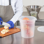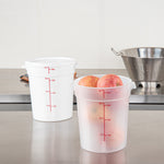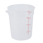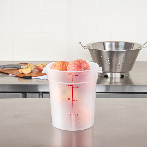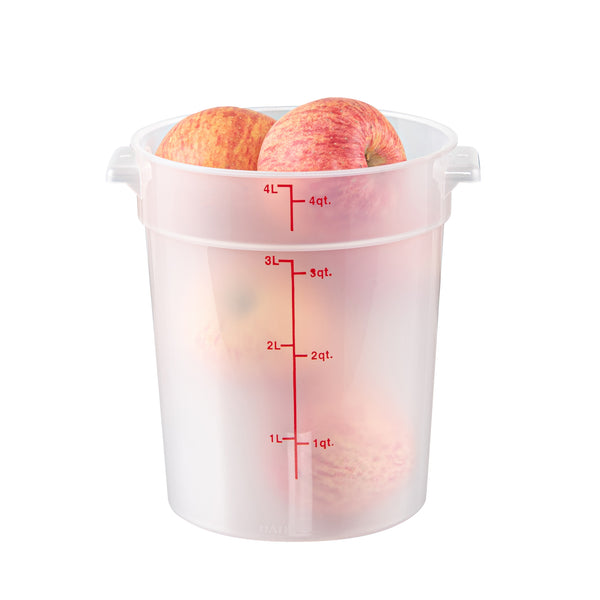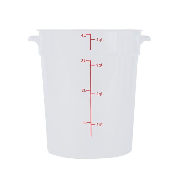 Our Met Lux 4-quart Round Translucent Plastic Food Storage Container is a must-have addition to any bustling kitchen or foodservice establishment. Crafted from durable PP plastic, this food storage container is designed to withstand temperatures ranging from -40 to 160 degrees Fahrenheit, perfect for storing a variety of foods. The round plastic food container possesses a unique feature, a red volume marker, which aids in accurate measurements to ensure consistency in your culinary creations. Equipped with a stable handle, this storage container is easy to carry, reducing the risk of spills or accidents in your busy kitchen. The translucent design of this food container allows for quick and easy identification of contents, saving you valuable time during peak hours. Impressively versatile, this round plastic container can be used in both the dishwasher and the freezer, making it a practical choice for all your food storage and cleaning needs. Boasting a generous 4-quart capacity, this round plastic container can hold substantial amounts of food, while its dimensions of 7.25 inches in diameter by 8.5 inches in height make it easy to store and stack. Pair this container with its compatible lid (SKU: RWT1572C-1) for a complete food storage solution. Sold in a 1 count box. Lid is available and sold separately.