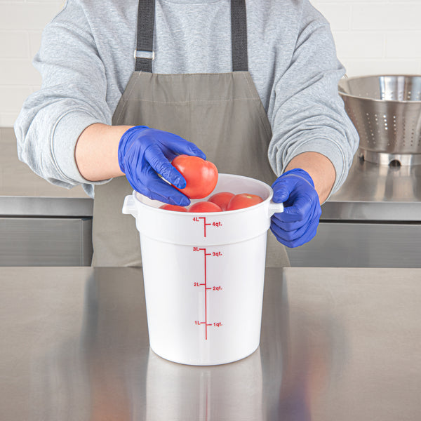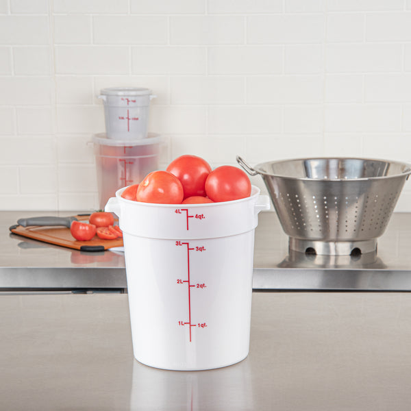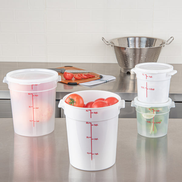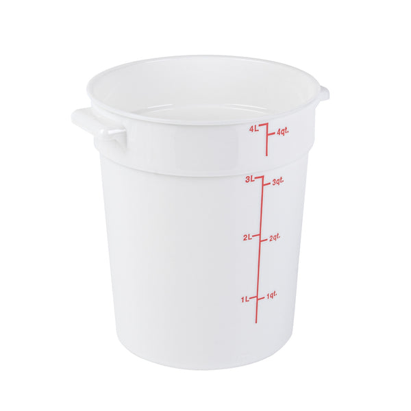 Elevate your food storage solutions with our Met Lux 4-quart Round White Plastic Food Storage Containers. Crafted from durable PP plastic, these round plastic food containers are designed to withstand everyday wear and tear, ensuring long-lasting reliability in your kitchen. Built to endure temperatures ranging from -40 to 160 degrees Fahrenheit, these food storage containers are perfect for storing a wide range of food items, from fresh produce to freezable goods. For easy portion control and inventory management, these containers feature red graduations, making it simple to measure ingredients or meals. Comfortable and stable handles enhance usability, making these containers easy to carry and maneuver in a busy kitchen. Both dishwashable and freezable, these versatile storage containers simplify your cleaning and food prep processes. These white food containers enhance visibility, making it easy to identify contents at a glance. With a generous 4-quart capacity, these round plastic containers can accommodate multiple servings of your culinary creations. Measuring 7.25 inches in diameter by 8.5 inches in height, these food containers maximize storage efficiency without compromising on space. Pair these containers with available lids (SKU: RWT1572C) for secure storage. Sold in a 10 count box. Lids are available and sold separately.