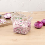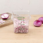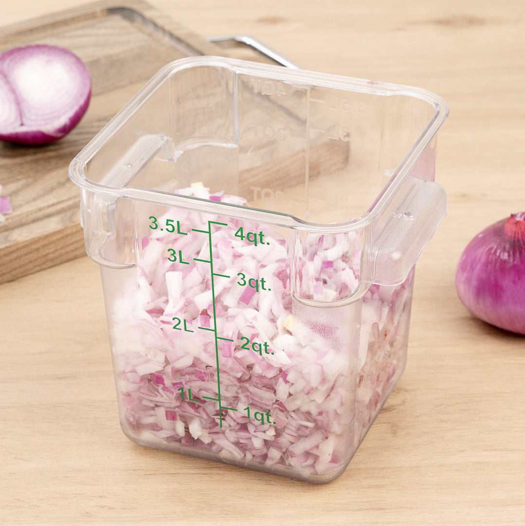 Organize your ingredients using our Met Lux 4-quart Square Clear Plastic Food Storage Container. Featuring green volume markers in quarts and liters, this plastic food storage box allows you to measure ingredients and manage your inventory at a glance. Made from high-quality plastic, this durable food container is resistant to stains and won't get damaged from oils, alcohols, or food acids. This odor-resistant food storage container has built-in handles to ensure you safely store ingredients or transport foods throughout your busy kitchen. With a clear finish, this commercial food container provides your staff with a quick way to identify products in your freezer, refrigerator, or storage shelf. Pair this clear food container with our compatible lid (SKU: RWT0841-1) to keep ingredients covered and prevent cross-contamination. With a durable design, this clear plastic food box is built for commercial dishwasher use to speed up your cleaning time after service hours. This plastic food storage container can endure temperatures from -40F to 210F and is stackable for space-saving storage in your kitchen. Containing up to 4 quarts, this food container measures 7 inches wide by 7.25 inches long. Sold in a 1 count box. Lid is available and sold separately.