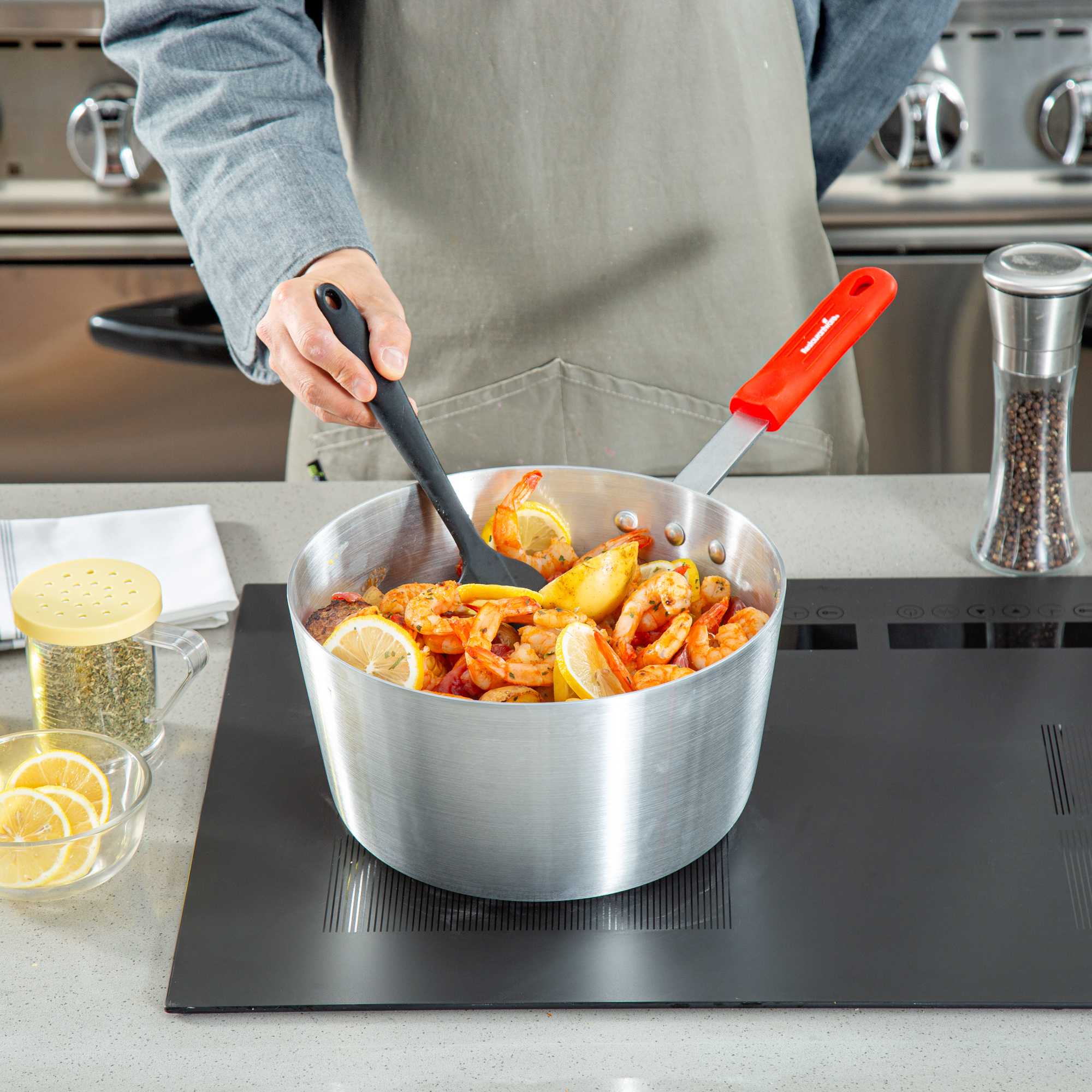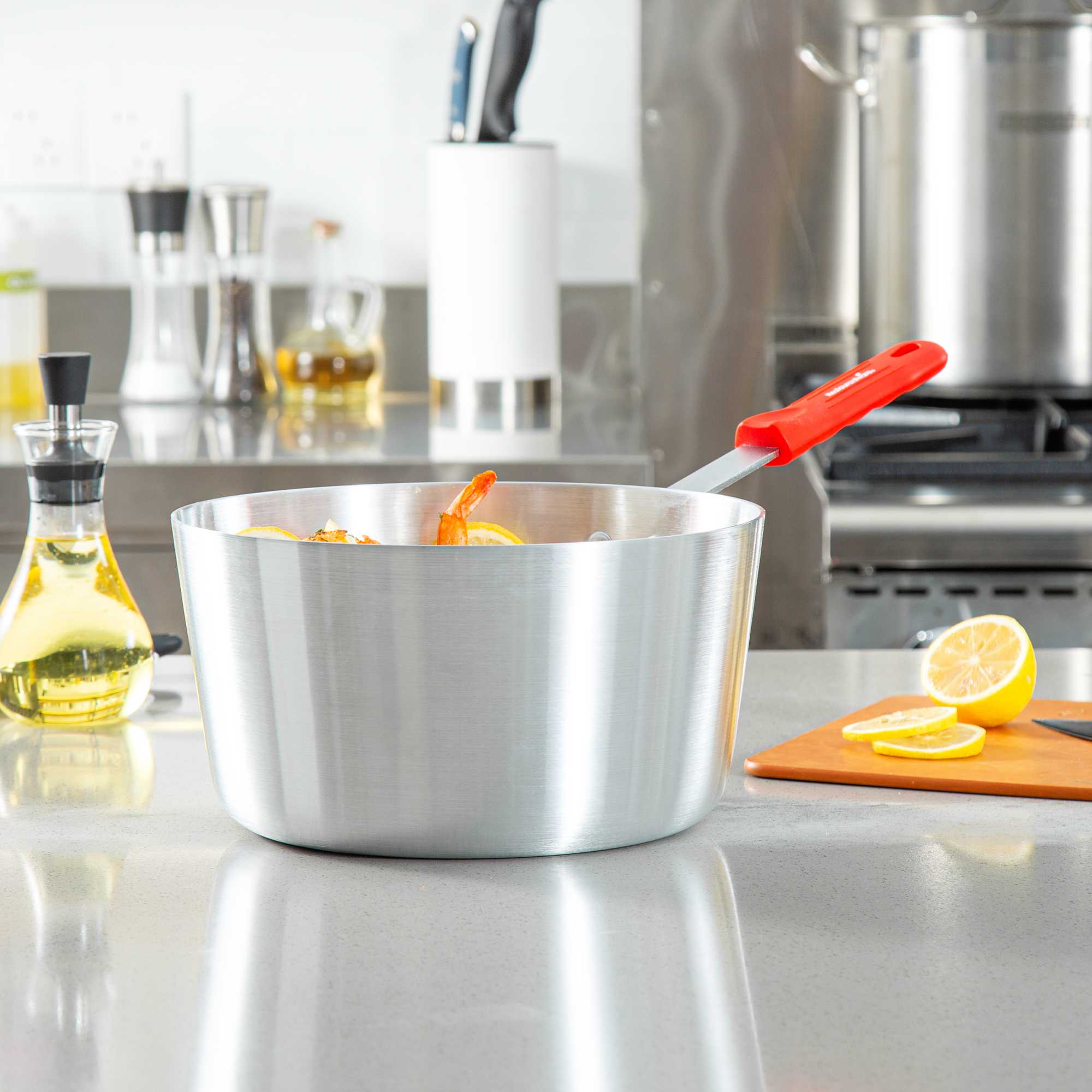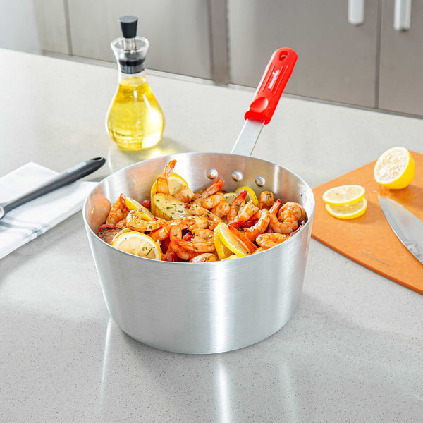 Maximize your kitchen's efficiency with versatile cookware solutions. The Met Lux Heat Distribution 5.5 Qt Sauce Pan combines a tapered aluminum design and a capacity of 5.5 quarts, ensuring efficient stirring and even heat distribution for simmering sauces or boiling liquids. As an aluminum cooking pan, its 3003 series, 2.5 millimeter thick construction resists warping and maintains consistency, critical for professional chefs and home cooks alike. The red silicone handle sleeve enhances safety by minimizing burn risks and improving grip, while its removable nature aids in easy cleaning. This oven safe sauce pan offers versatile cooking applications, enduring temperatures up to 450F, and fits seamlessly into any commercial kitchen setup. At 17.9 inches in length, it provides ample space for a variety of culinary tasks. Enhance your kitchen's capabilities with this reliable tool, perfect for preparing a wide range of dishes. Sold in a 1 count box.