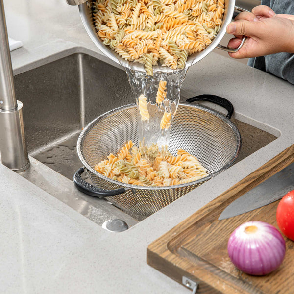 - Stainless steel punching holes ensure quick draining for pasta