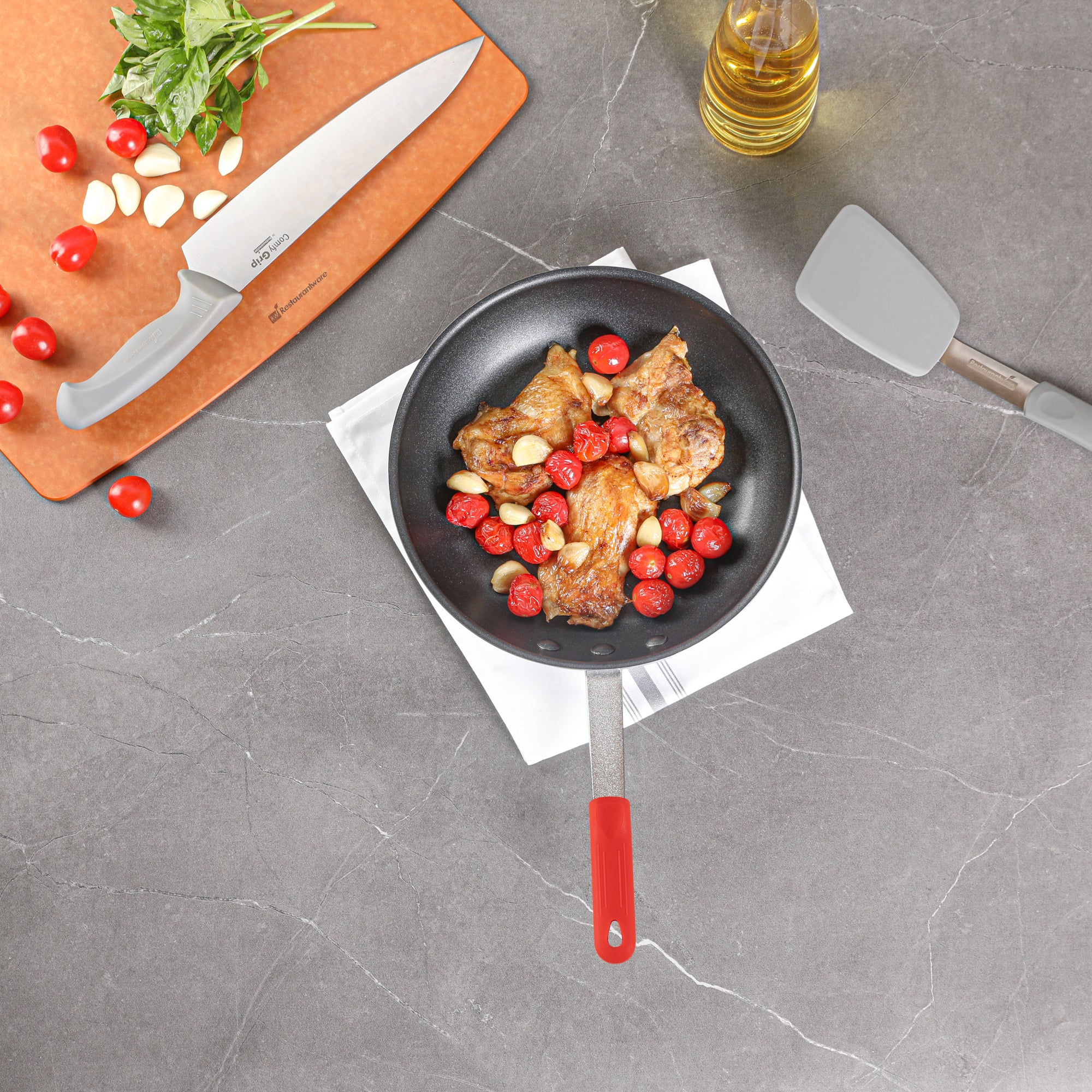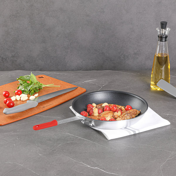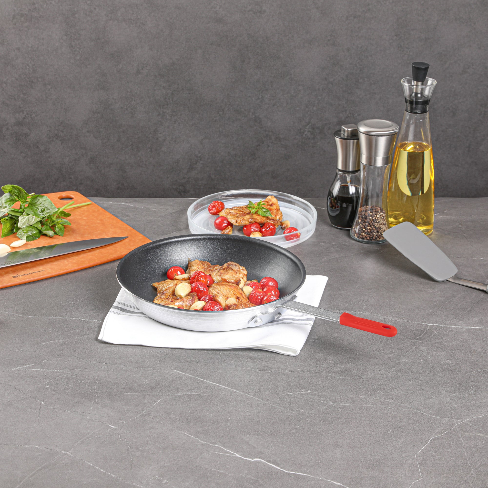 Enhance your culinary efficiency with our Bundle: Met Lux 6 Aluminum 10" Non-Stick Fry Pans with 6 Red Silicone Pan Handle Sleeves. Featuring a non-stick surface, these skillet pans provide easy food release and easy cleanup, saving precious time during busy kitchen hours. Made from 3 mm thick aluminum, these fry pans provide superior heat distribution, ensuring perfect searing, browning, and frying for all your dishes. Designed to be induction stovetop safe, these aluminum skillets expand your culinary possibilities. With a triple-riveted handle, these aluminum fry pans offer a secure grip, enhancing control and maneuverability while cooking. The convenient hanging hole of these cooking pans facilitates easy storage, improving kitchen organization and accessibility. To maintain their pristine condition, these aluminum pans are recommended to be hand washed for optimal care and longevity. These removable handle sleeves are heat-resistant up to 450F, protecting your hands from burns while handling hot cookware. The molded indentations of these pan handle sleeves provide a firm grip for improved control while cooking. With a removable design, these silicone pan handle sleeves are removable, making quick pan transitions convenient. These aluminum saute pans measure 17.72 inches in length by 10.23 inches in width by 2.75 inches in height, providing ample space for a variety of dishes. Each order includes 6 pans and 6 sleeves.