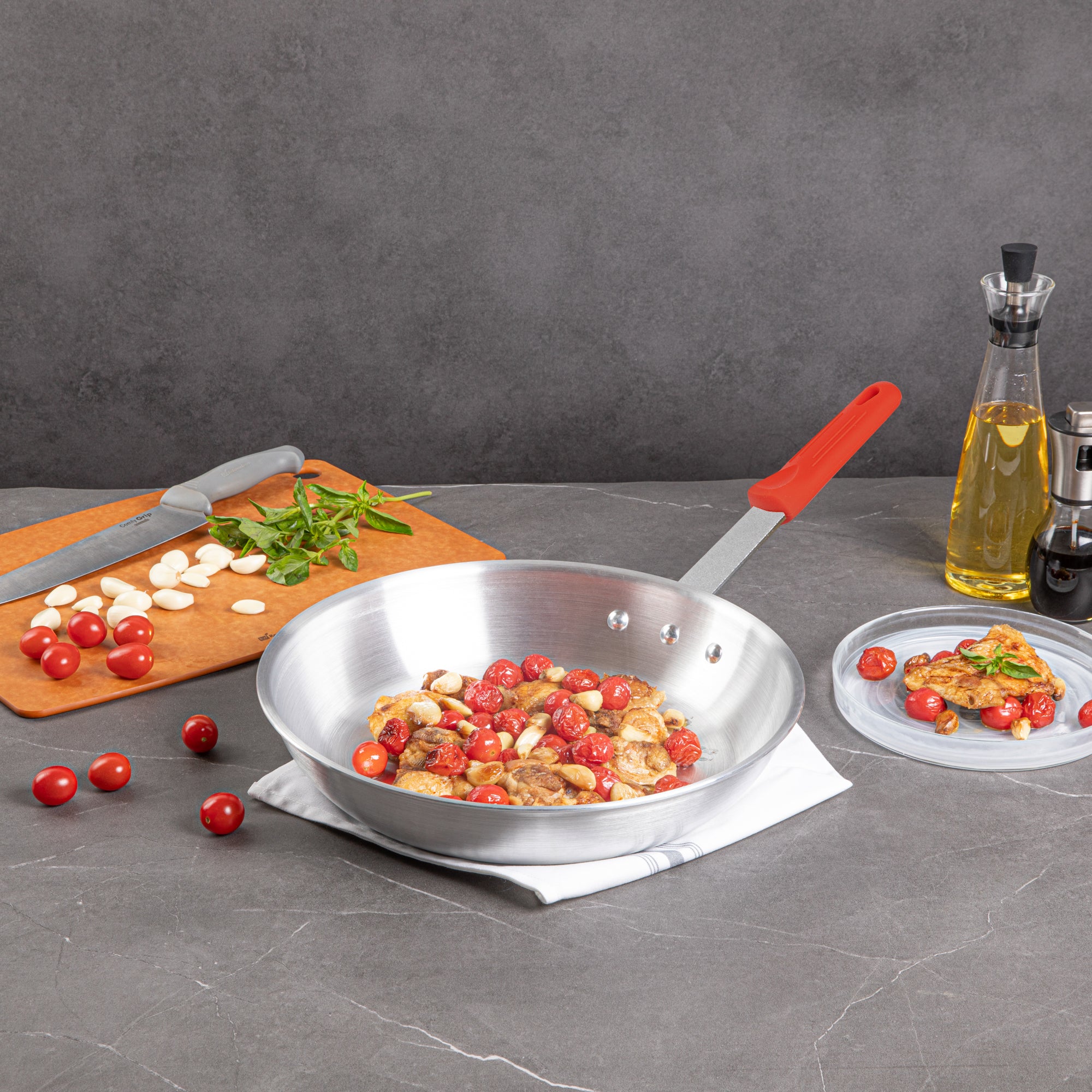 Master every dish with our Bundle: Met Lux 6 Aluminum 14" Fry Pans with 6 Red Silicone Pan Handle Sleeves. These durable cooking pans are made from 3.5 mm thick aluminum, offering exceptional heat distribution for even cooking and browning, ensuring your dishes are cooked to perfection every time. Lightweight yet durable, these cooking pans make maneuvering in the kitchen effortless, whether flipping pancakes or sautéing vegetables, reducing fatigue during long cooking sessions. Boasting a satin finish, these aluminum fry pans provide superior performance and add a touch of elegance to your cookware collection, enhancing the aesthetic appeal of your kitchen. The triple-riveted handle of these frying pans offer a comfortable grip for added stability and durability when cooking. For added convenience, these skillet pans feature a hanging hole, allowing for easy storage and quick access, optimizing your kitchen space. These aluminum skillets are designed for hand washing, ensuring optimal care and maintenance, prolonging the lifespan of your cookware. The removable design of these pan handle sleeves allow easy cleaning and storage, enhancing your kitchen's efficiency and hygiene. These removable handle sleeves withstand heat up to 450F, ensuring your hands stay cool and secure even during the busiest cooking times, preventing burns and accidents. The molded indentations on these frying pan handle sleeves provide a secure grip, reducing the chances of slips and spills, and ensuring a safer cooking environment. These aluminum saute pans measure 25.98 inches in length by 14.17 inches in width by 6.38 inches in height, offering ample cooking surface to cater to your diverse culinary needs. Each order includes 6 pans and 6 sleeves.