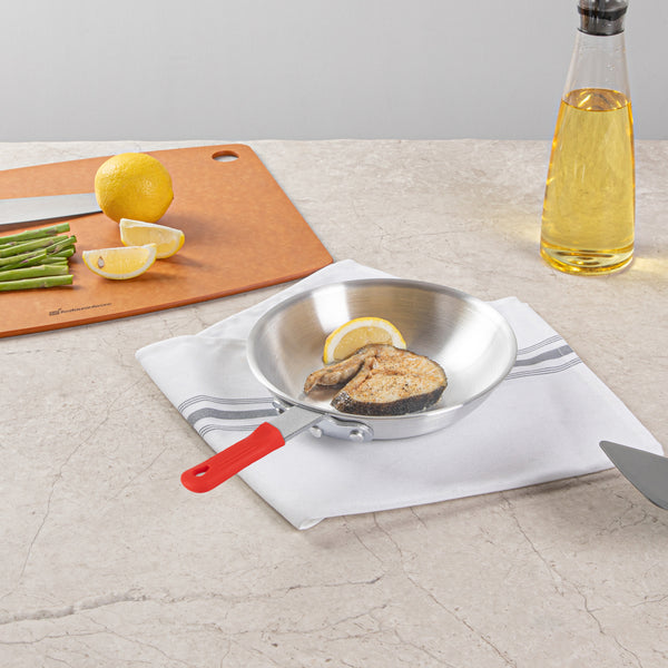 Elevate your kitchen's efficiency with our Bundle: Met Lux 6 Aluminum 8" Fry Pans with 6 Red Silicone Pan Handle Sleeves. Crafted from 3.5 mm thick aluminum, these fry pans ensure even heat distribution, offering consistent cooking results for your culinary creations. The lightweight design of these aluminum fry pans makes it effortless to flip, stir, and saute your dishes, enhancing your cooking precision. Featuring a satin finish, these frying pans are perfect for searing, sauteing, and browning food, adding a touch of finesse to your meals. The triple-riveted handle of these skillet pans provides a secure and comfortable grip, allowing for confident maneuvering while cooking. With a convenient hanging hole, these skillets simplify storage and keep your kitchen organized. Designed for hand washing, these aluminum skillets are easy to maintain and ensure long-lasting performance. The removable design of these silicone sleeves allows for easy interchange between pans, improving kitchen efficiency and reducing clutter. With the ability to withstand heat temperatures up to 450F, these removable handle sleeves protect your hands from burns, ensuring the safe handling of hot pans. Featuring molded indentations, these pan handle sleeves offer a secure grip, minimizing the risk of accidental slippage and enhancing safety. Measuring 12.99 inches in length by 7.87 inches in width by 2.28 inches in height, these aluminum cooking pans provide ample space for frying a variety of ingredients. Each order includes 6 pans and 6 sleeves.