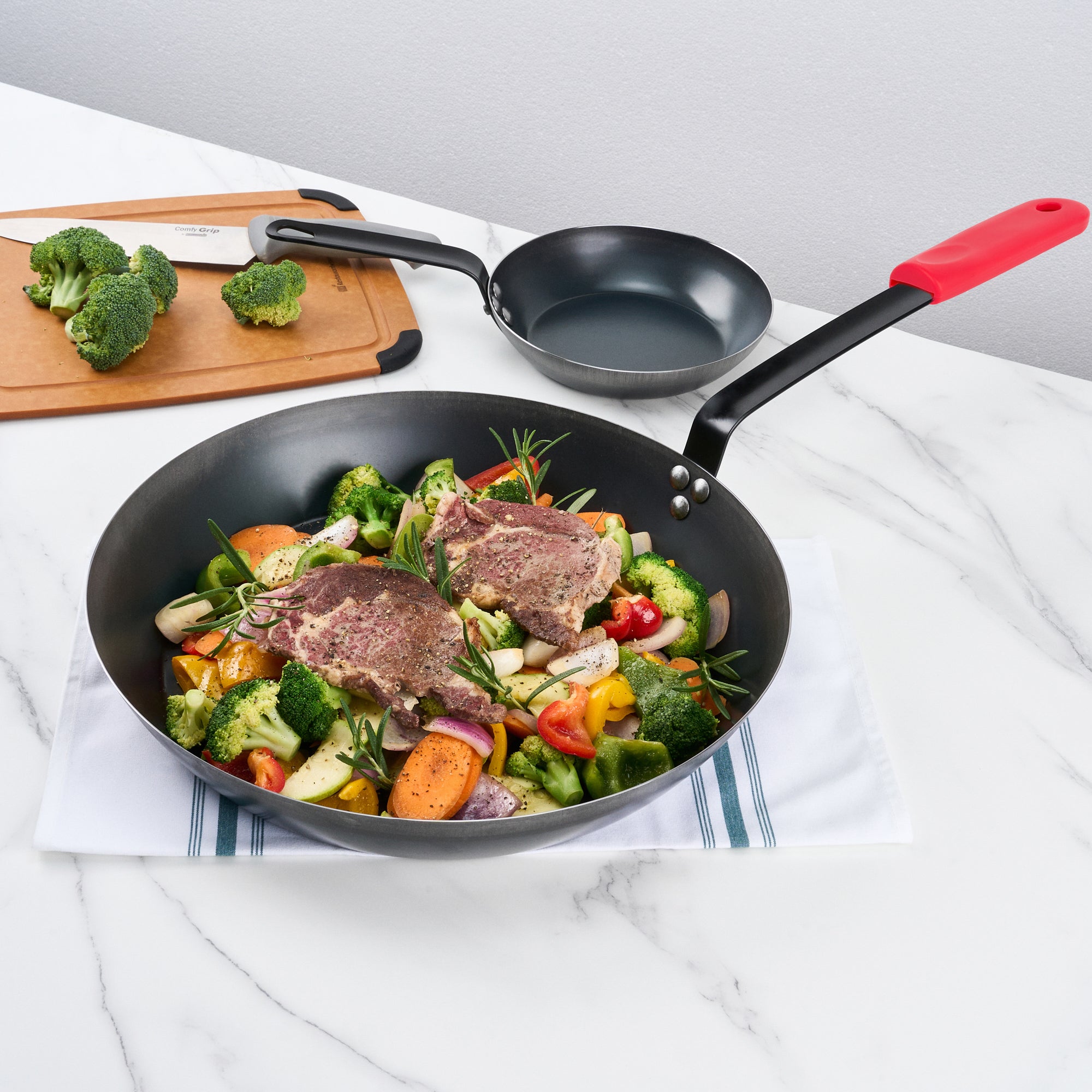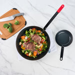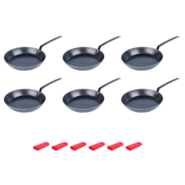 Cook pancakes with our Met Lux 6 Black Carbon Steel 16" Pre-Seasoned Fry Pans with 6 Red Silicone Pan Handle Sleeves. These fry pans are made from 1.5 mm thick carbon steel, offer exceptional heat distribution for even cooking and browning, ensuring consistent results every time. Lightweight yet durable, these carbon steel fry pans make maneuvering in the kitchen effortless, whether you're flipping pancakes or sautéing vegetables. Boasting non-coated surfaces, these frying pans provide superior performance and add a touch of elegance to your cookware collection. The triple-riveted handles of these cooking pans ensure secure connections, facilitating enhanced control in cooking. For added convenience, these skillet pans feature hanging holes, allowing for easy storage and quick access in busy kitchen environments. Designed for hand washing, these carbon steel skillets ensure optimal care and maintenance to extend their lifespans. Withstanding heat up to 450F, these removable handle sleeves keep your hands cool and secure, even during the busiest cooking times. The molded indentations on these pan handle sleeves provide secure grips, reducing the chances of slips and spills, which is crucial for maintaining kitchen safety. With removable designs, these silicone pan handle sleeves allow for easy cleaning and storage, fitting seamlessly into any kitchen routine. Including the handles, these 16-inch fry pans measure 28.54 inches in length by 15.75 inches in width by 5.79 inches in height. Each order includes 6 pans and 6 sleeves.