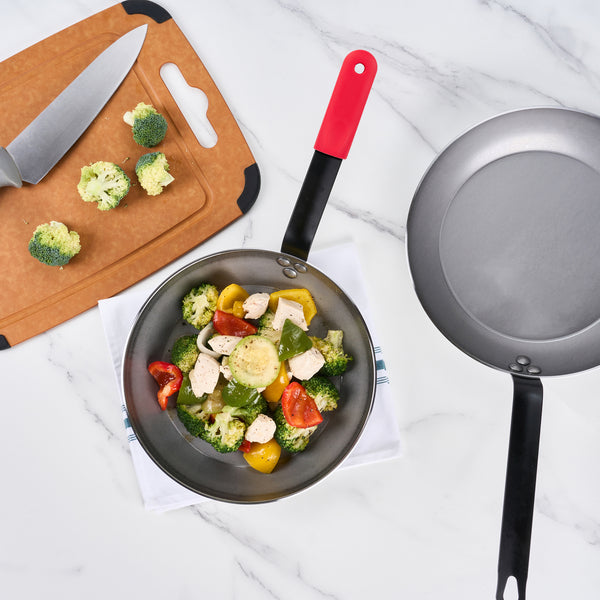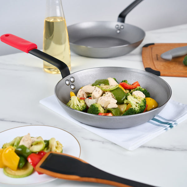 Revolutionize your kitchen operations with our Met Lux 6 Carbon Steel 10" Non-Stick Fry Pans with 6 Red Silicone Pan Handle Sleeves. These fry pans, constructed from 3 mm thick carbon steel, ensure superior durability and optimal heat distribution for uniform cooking. The lightweight design of these fry pans simplifies the cooking process, making them a must-have in any high-traffic kitchen. After seasoning, these hand-washable skillet pans develop non-stick properties, greatly enhancing your culinary experience. With these carbon steel pans oven-safe capability, you can transition dishes seamlessly from the stovetop to the oven. The triple-riveted handle of these fry pans ensures a secure grip, providing confidence during cooking and pan transfer. These induction-safe fry pans are compatible with all types of stovetops, offering a versatile frying solution. The hanging hole on the handle of these fry pans allows for convenient storage, saving precious kitchen space. These black silicone removable pan handle sleeves are heat-resistant up to 450F, protecting your hands from burns. The molded indentations on these handle sleeves ensure a firm grip even in high-heat situations, and their removable design allows for flexible use on multiple pans. For added convenience, these handle sleeves feature a hanging loop for easy storage and are dishwashable for effortless maintenance. Measuring 18.31 inches in length by 10.24 inches in width by 4.06 inches in height, these 10-inch pans offer ample space for various dishes. Each order includes 6 pans and 6 sleeves.