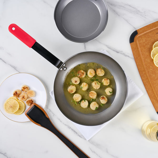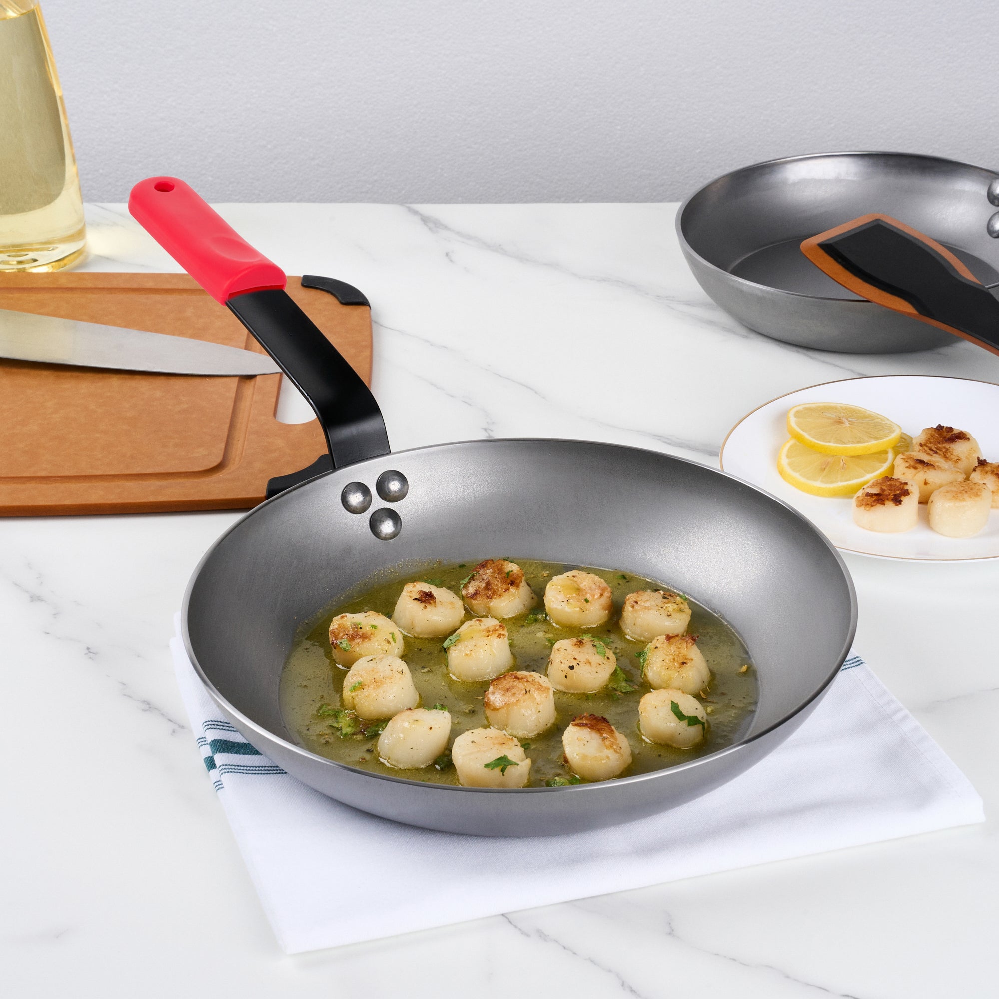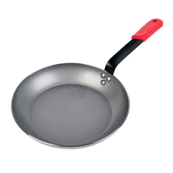 Elevate your culinary operations with our Met Lux 6 Carbon Steel 11" Non-Stick Fry Pans with 6 Red Silicone Pan Handle Sleeves. Built with 3 mm thick carbon steel, these heavy-duty fry pans are lightweight, ensuring easy handling while offering excellent heat distribution for consistent cooking results. These skillet pans gain non-stick properties once seasoned, allowing you to effortlessly prepare delicious meals without food sticking. Oven-safe and induction-safe, these versatile steel fry pans can be used on various heat sources, making them ideal for diverse cooking needs. Featuring a triple-riveted handle with a hanging hole, these frying pans provide a secure grip and convenient storage options. For easy cleaning, these fry pans can be hand washed, maintaining their pristine condition over time. Paired with the fry pans are these red silicone sleeves that offer heat resistance of up to 450F, ensuring a comfortable grip on hot pans. The removable design of these handle sleeve enables quick and easy switching between pans, saving time and effort in a busy kitchen. Plus, the molded indentations on these silicone sleeves provides a secure and comfortable grip, while the hanging loop allows for easy storage and organization. The dishwashable design of these handle sleeves ensures hassle-free cleaning after use. Each 11-inch carbon steel fry pan measures 19.88 inches in length by 11.02 inches in width by 4.57 inches in height, providing ample space for cooking a variety of dishes. Each order includes 6 pans and 6 sleeves.