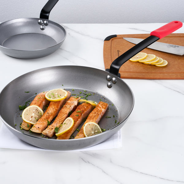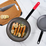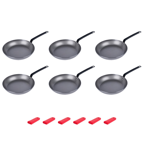 Optimize your cooking efficiency and safety with our Met Lux 6 Carbon Steel 13" Non-Stick Fry Pans with 6 Red Silicone Pan Handle Sleeves. Crafted from robust 3 mm thick carbon steel, these fry pans ensure long-lasting durability, even in the busiest culinary environments. The lightweight design of these fry pans ensures effortless handling and flipping of food, providing a smooth and enjoyable cooking experience. With seasoning, these skillet pans enhance their non-stick properties, creating an optimal cooking surface for a wide variety of dishes. The oven-safe feature of these frying pans allows seamless transitions from stovetop to oven, adding versatility to your cooking methods. Each fry pan is equipped with a triple-riveted handle for a comfortable and secure grip, enhancing safety during use. Plus, the induction-safe design of these carbon steel fry pans ensures efficient heat distribution, leading to faster and more consistent cooking times. The convenient hanging hole on each pan aids in organized storage, maintaining a neat kitchen. These pans are hand washable, ensuring easy clean-up after every culinary endeavor. Complementing the pans, the red silicone removable pan handle sleeves fit seamlessly, offering versatility and additional comfort. these sleeves are heat-resistant up to 450F, protecting your hands from burns in high-heat situations. The molded indentations on these sleeves ensure a firm and secure grip, even during intense cooking sessions. Plus, the removable design of these sleeves allows for use on multiple pans, enhancing flexibility in the kitchen. Featuring a hanging loop, these handle sleeves are easy to store and keep your kitchen organized. These dishwashable sleeves offer effortless maintenance. Measuring 22.83 inches in length by 12.59 inches in width by 4.8 inches in height, these 13-inch steel fry pans provide ample space for preparing a variety of dishes. Each order includes 6 pans and 6 sleeves.