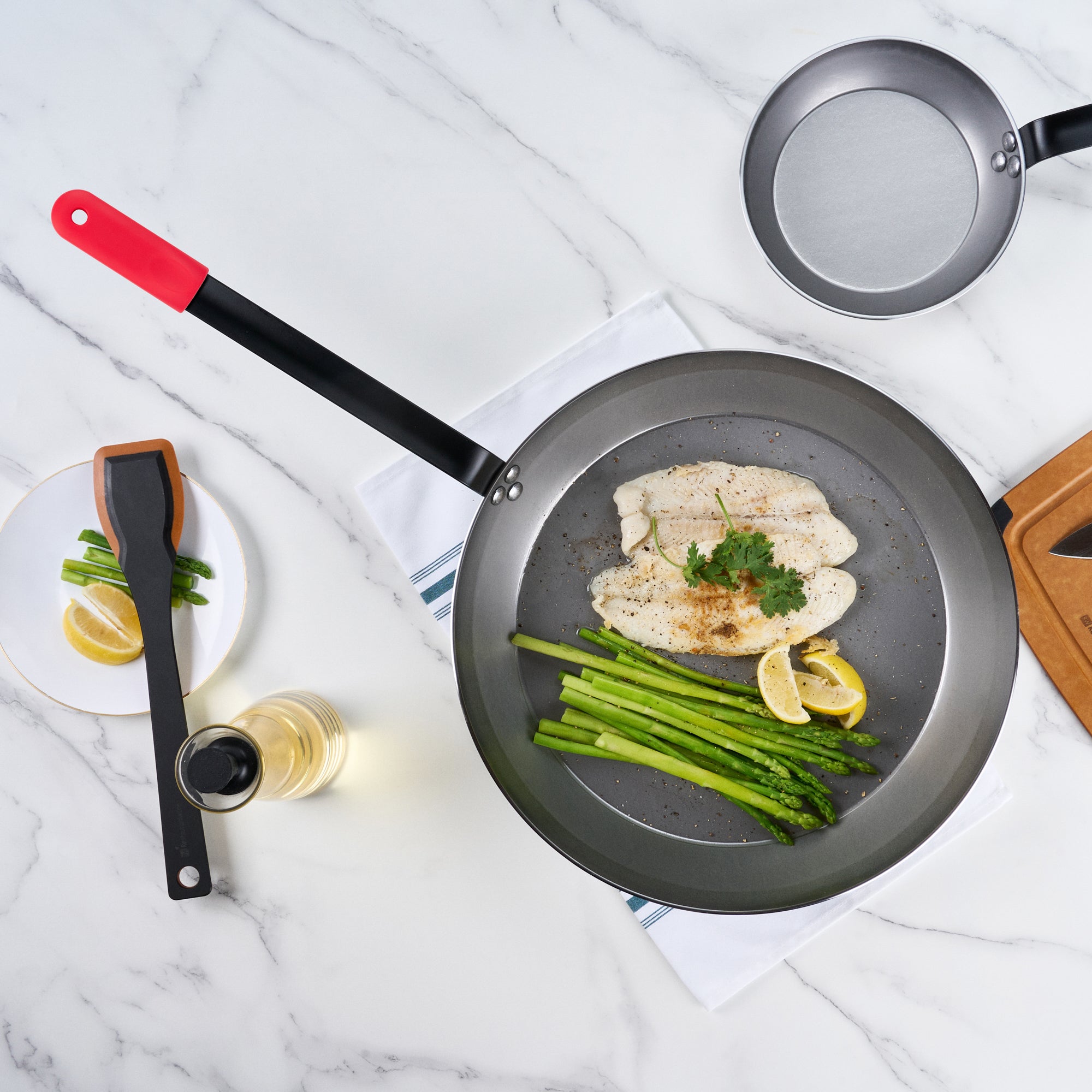 Upgrade your cooking arsenal with the Met Lux 6 Carbon Steel 16" Non-Stick Fry Pans with 6 Red Silicone Pan Handle Sleeves. Designed from durable 3 mm thick carbon steel, these fry pans offer exceptional longevity and excellent heat retention, making them ideal for high-performance cooking. With a seasoned non-stick surface, these fry pans ensure smooth food release, making them perfect for busy kitchen environments. The oven-safe design of these fry pans provides flexibility, enabling seamless use from stovetop to oven. The triple-riveted handle of these fry pans enhances safety with a secure grip, minimizing accident risks. Compatible with induction and other cooking surfaces, these versatile fry pans meet diverse culinary needs. Each handle of these carbon steel fry pans features a hanging hole for easy storage. The silicone handle sleeves included are heat-resistant up to 450F, offering protection against burns and promoting kitchen safety. The pan handle sleeves' molded indentations ensure a firm grip, even under high heat, and their removable design allows for use with multiple pans. The high sleeves are dishwashable and include a hanging loop for straightforward storage. Measuring 28.54 inches in length by 15.75 inches in width by 5.79 inches in height, these fry pans offer ample cooking space for a variety of dishes. Each order includes 6 pans 6 sleeves.
